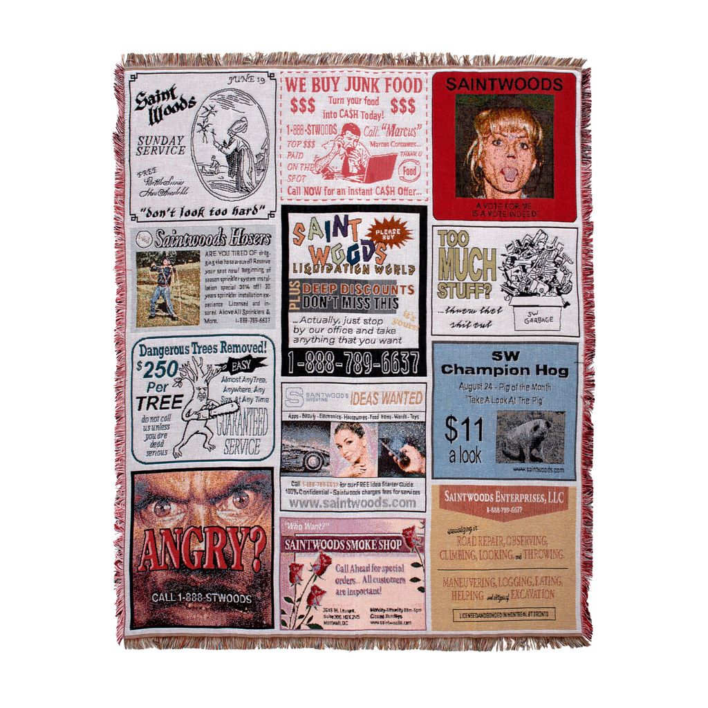 SW Blanket is multicolour knit blanket featuring Intarsia knit and Saintwoods graphics all over. Imported.