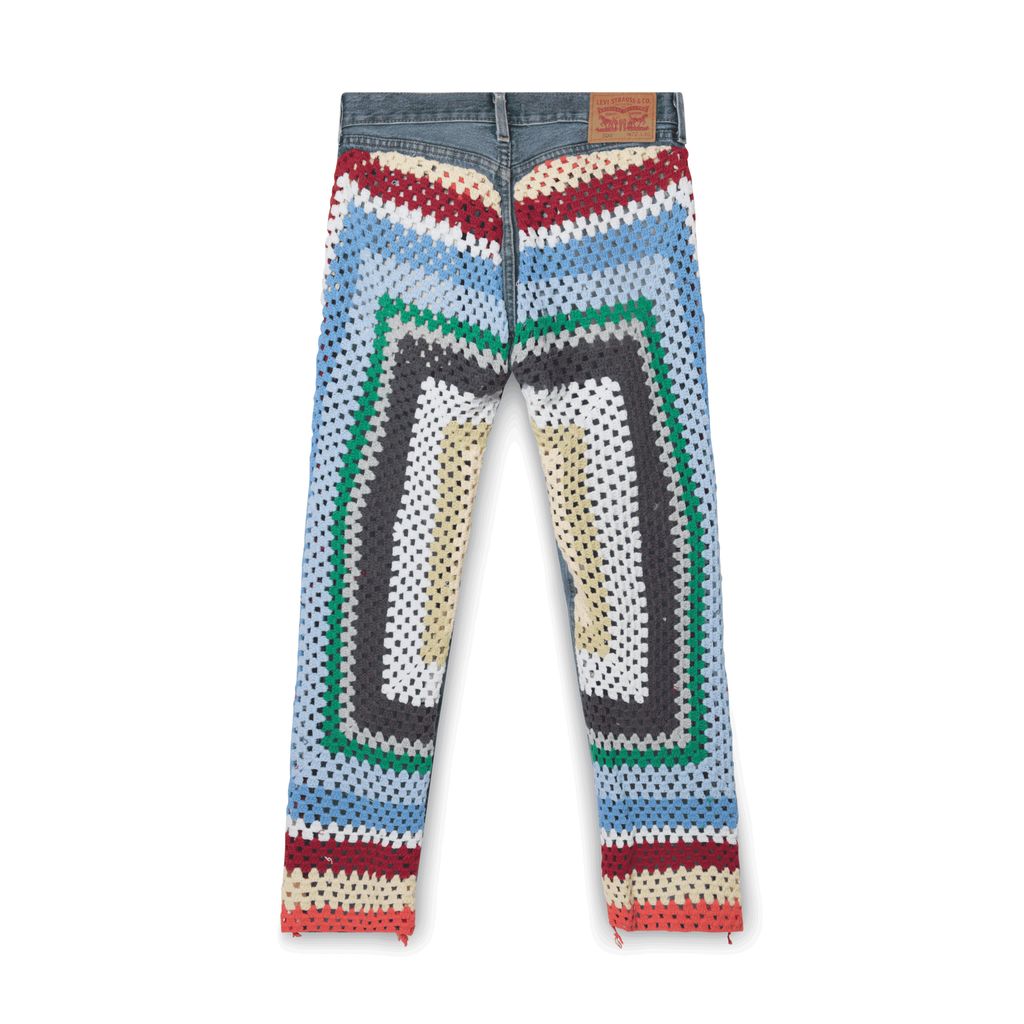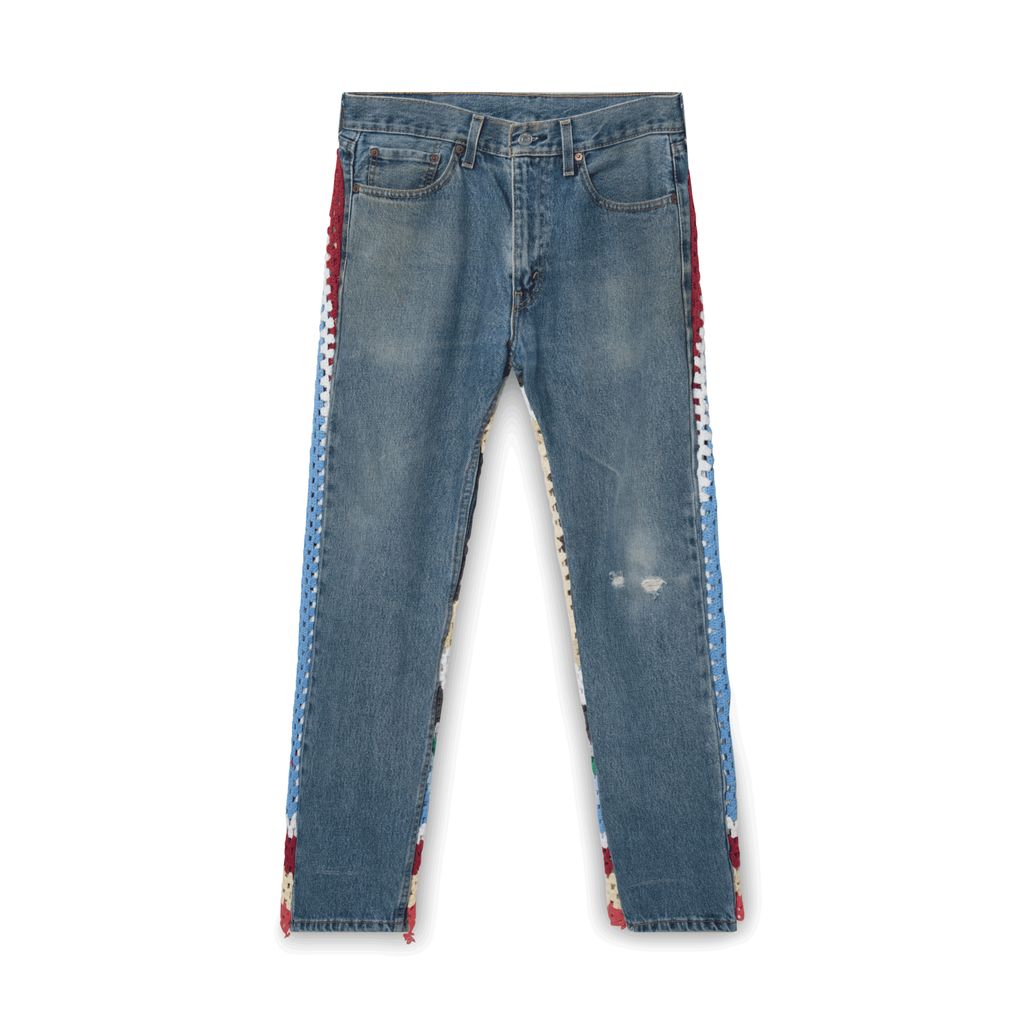 Medium wash denim jeans feature Gabby's signature crochet work.