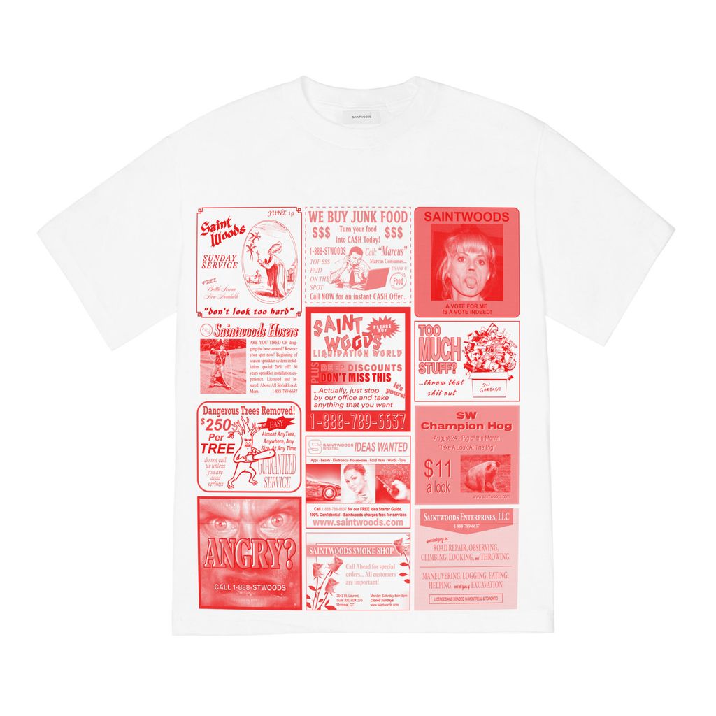 SW Blanket Tee is a short sleeve cotton jersey t-shirt in white featuring rib knit crew neck collar, split stitch double needle sewing at sleeve and hem, all-over screen print at front. Preshrunk to minimize shrinkage. Made in Canada.