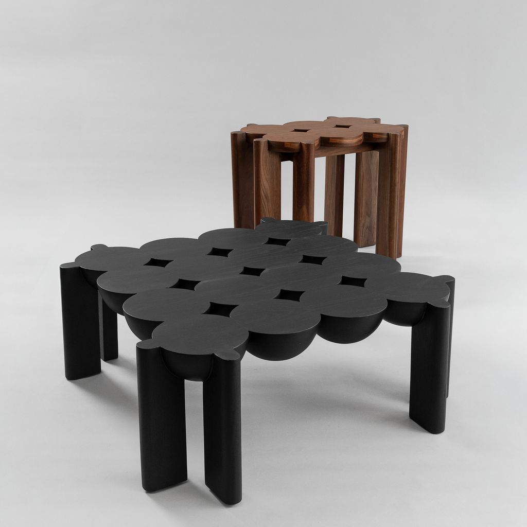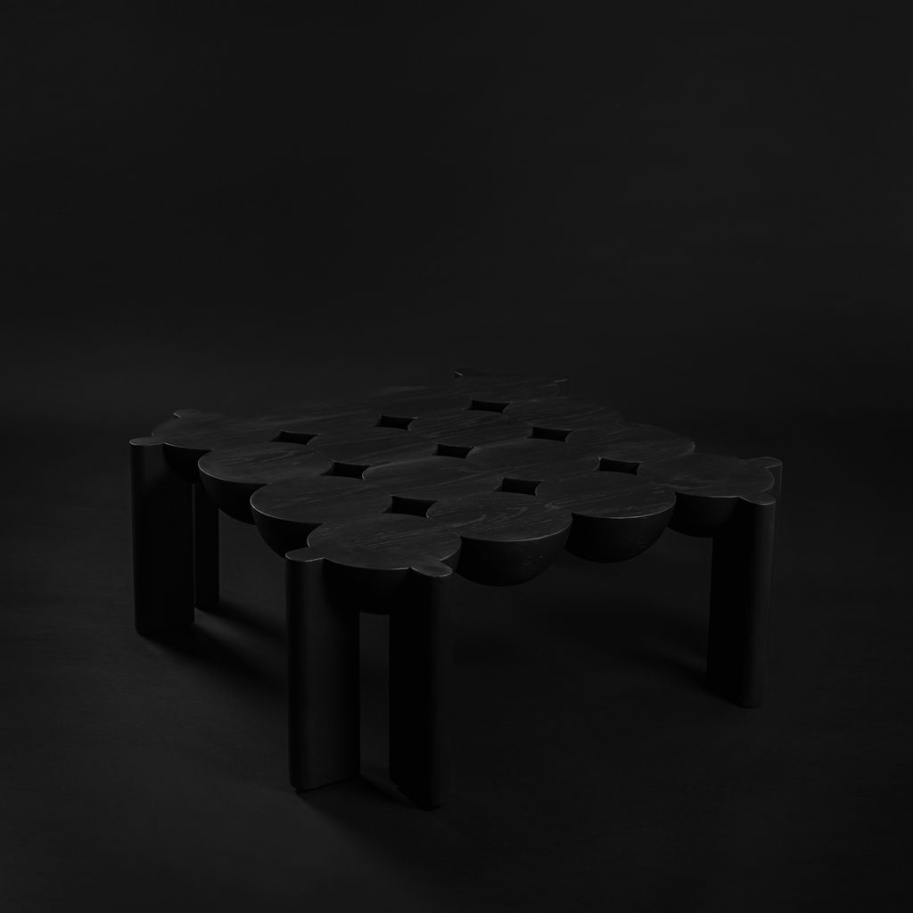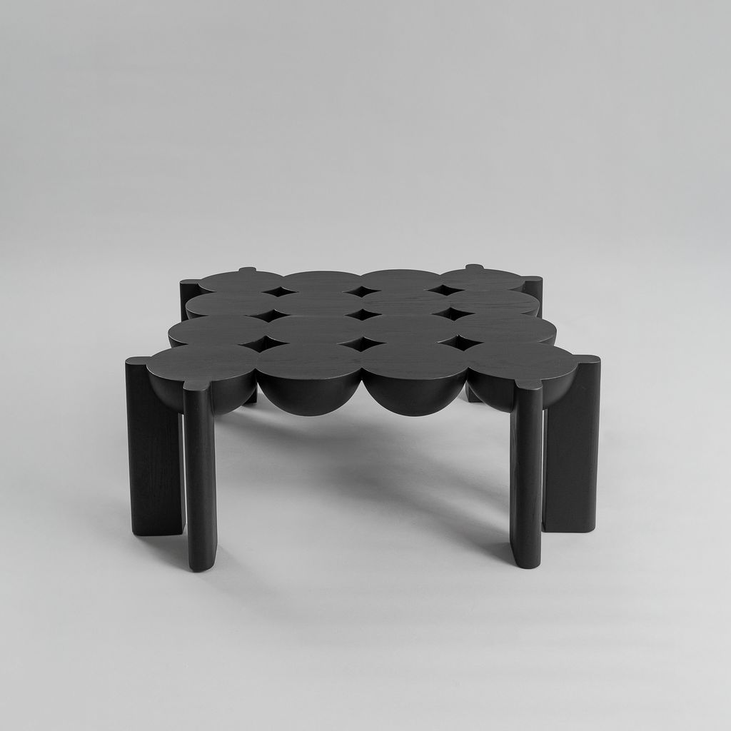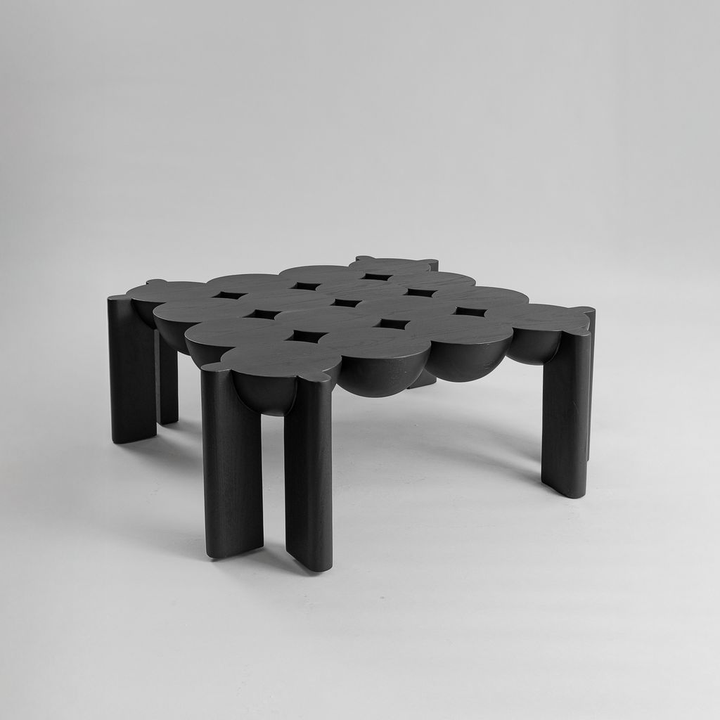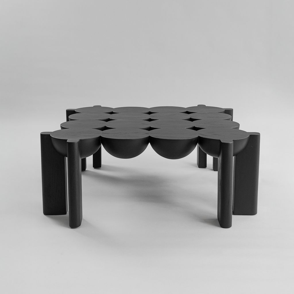 Daniel Couttolenc’s BLEO Coffee Table embodies the elegance of symmetry through the union of spheres and halves. Sculpted from Oak with a striking Black Finish, its geometry follows the golden ratio, achieving rhythmic balance and expressive contrast. The result is a table that blurs the boundary between object and sculpture, offering visual depth and quiet sophistication. Custom options available on request.