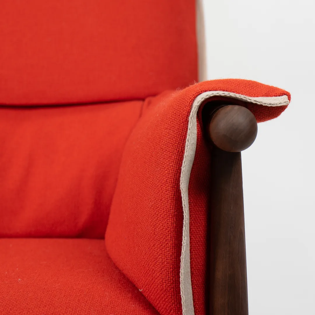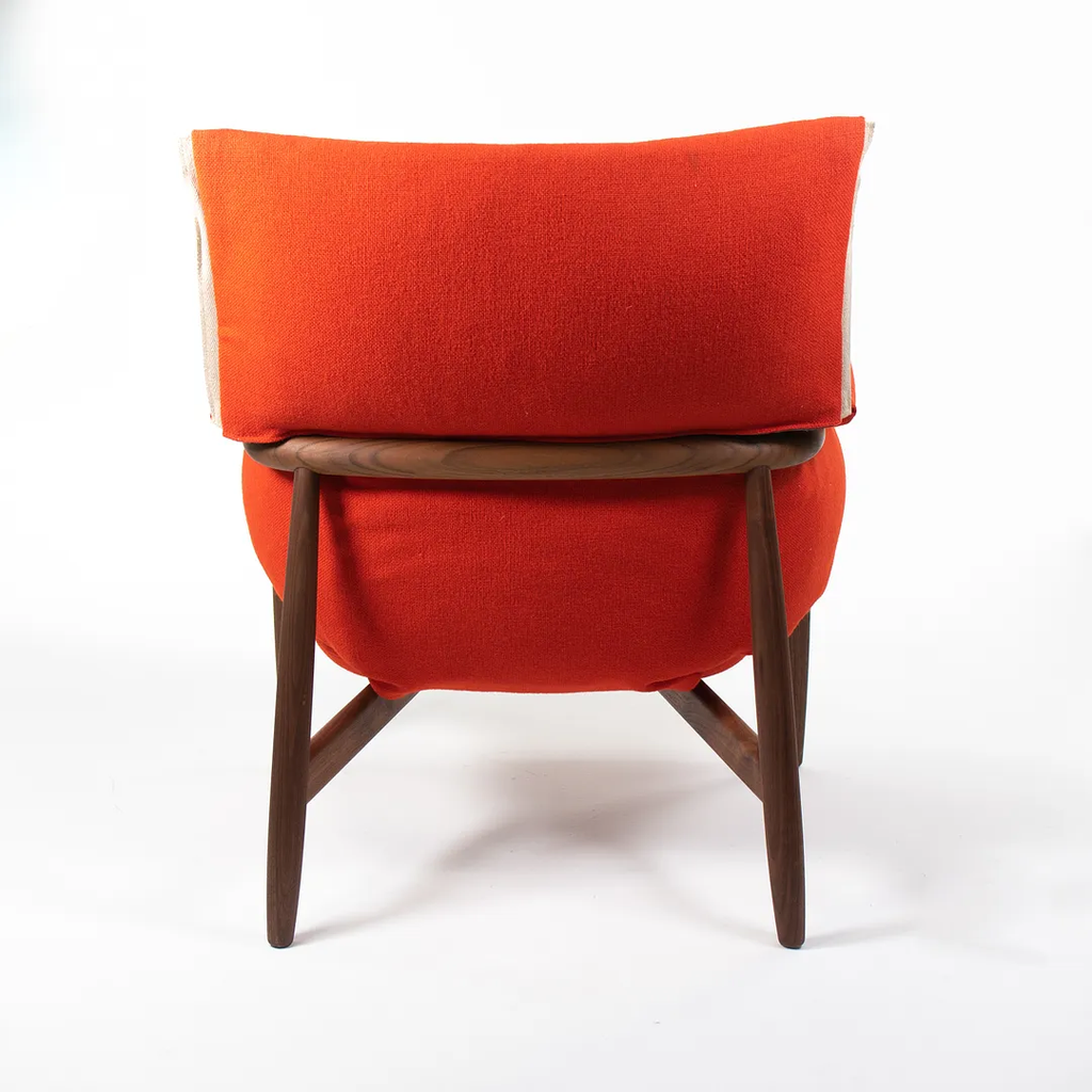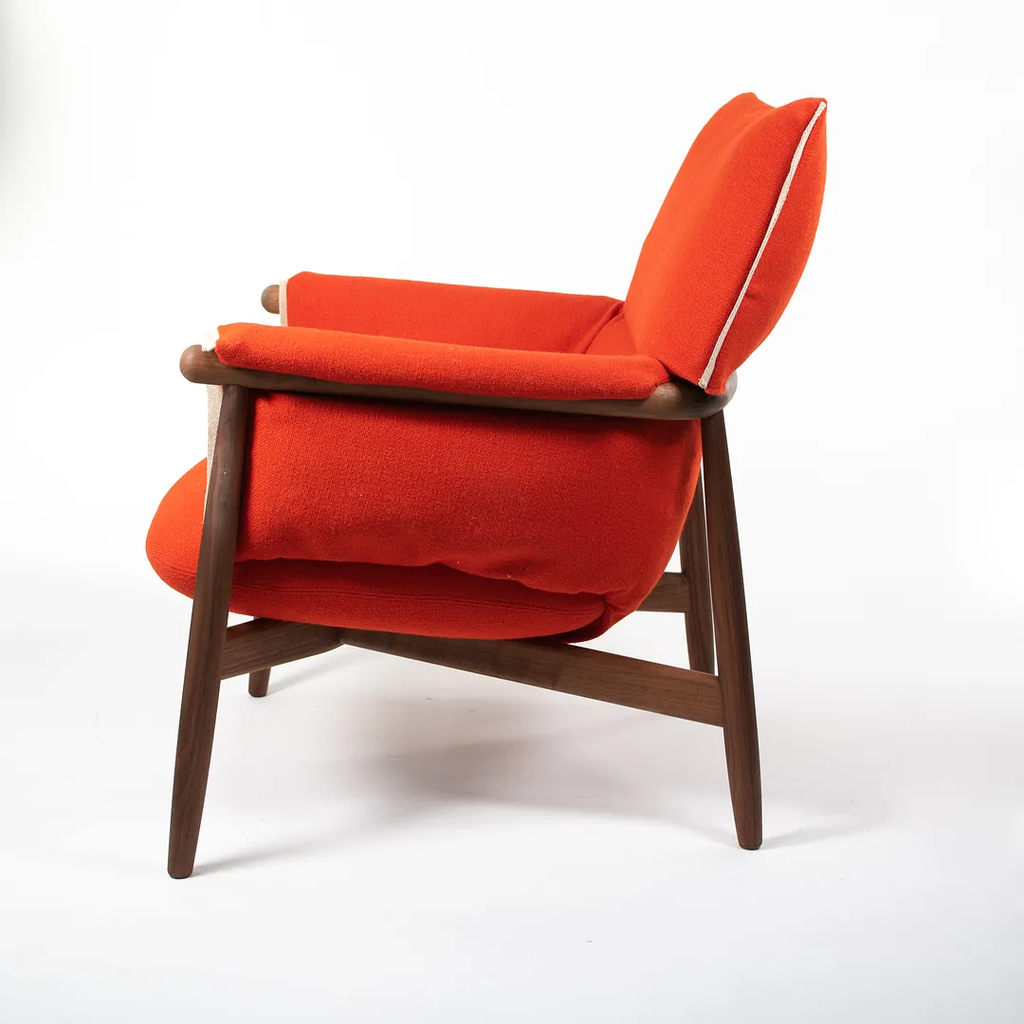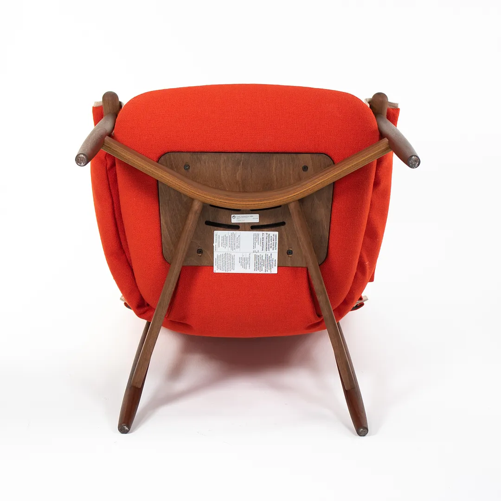 This is an EO15 Embrace Lounge Chair with a solid walnut frame, red / orange fabric upholstery, and natural edge strip. The chair was designed by EOOS and produced by Carl Hansen & Son in Denmark. The chair dates to circa 2020 and is guaranteed as authentic. Condition is excellent with only very light wear. See photos. This chair came directly from Carl Hansen. It was likely used as a floor model or display piece within their showroom.