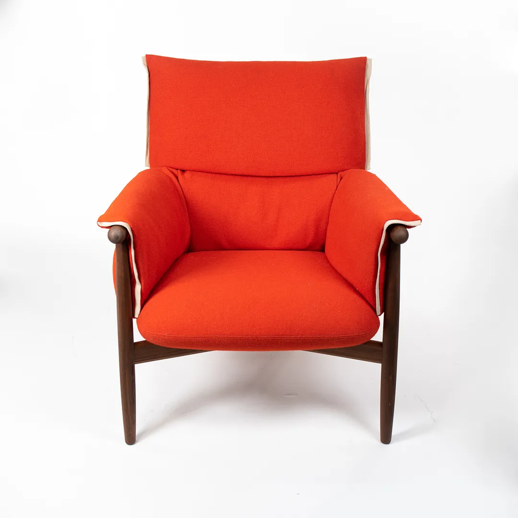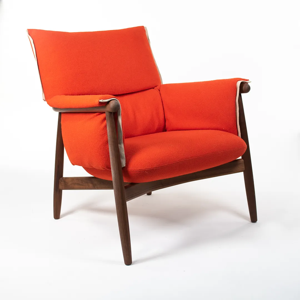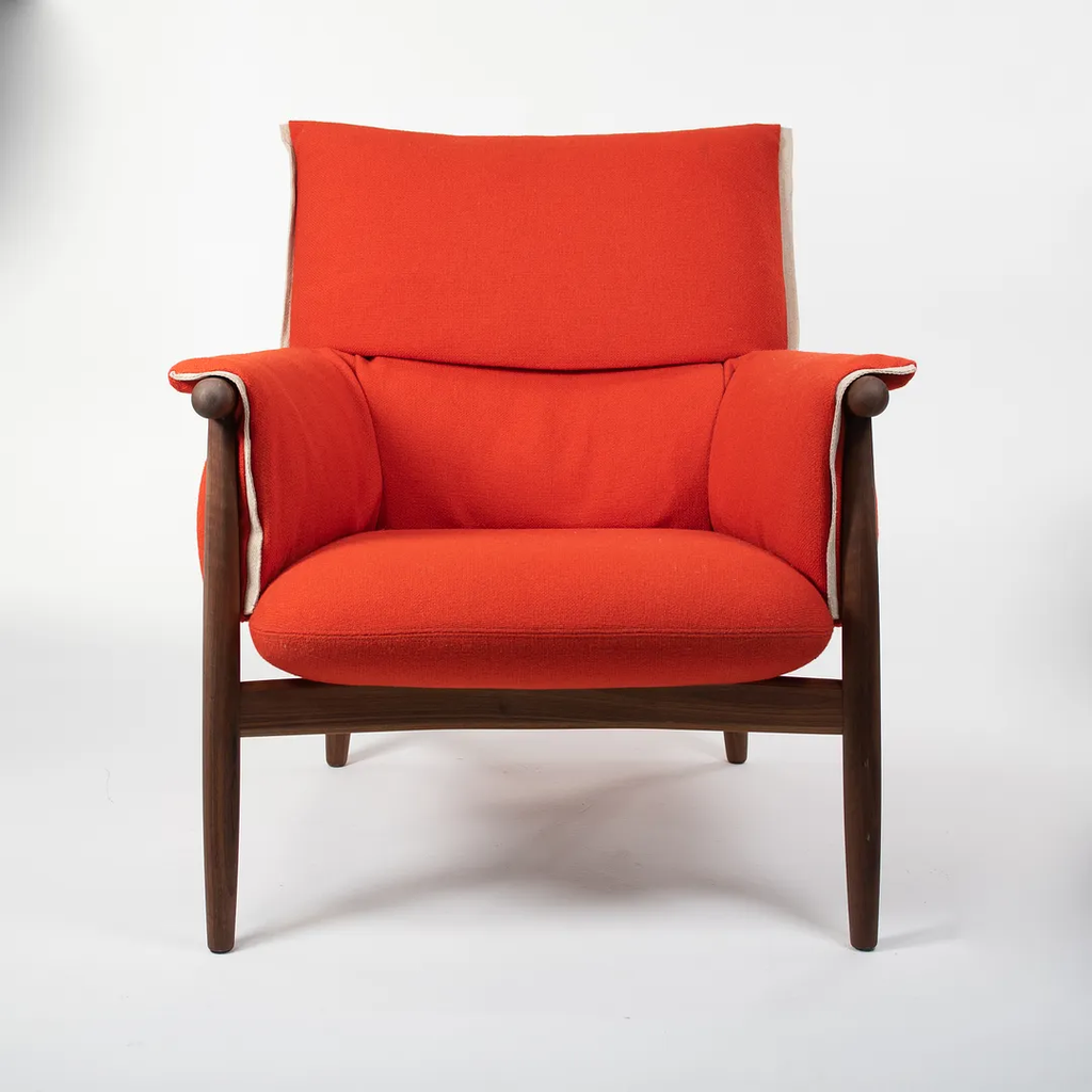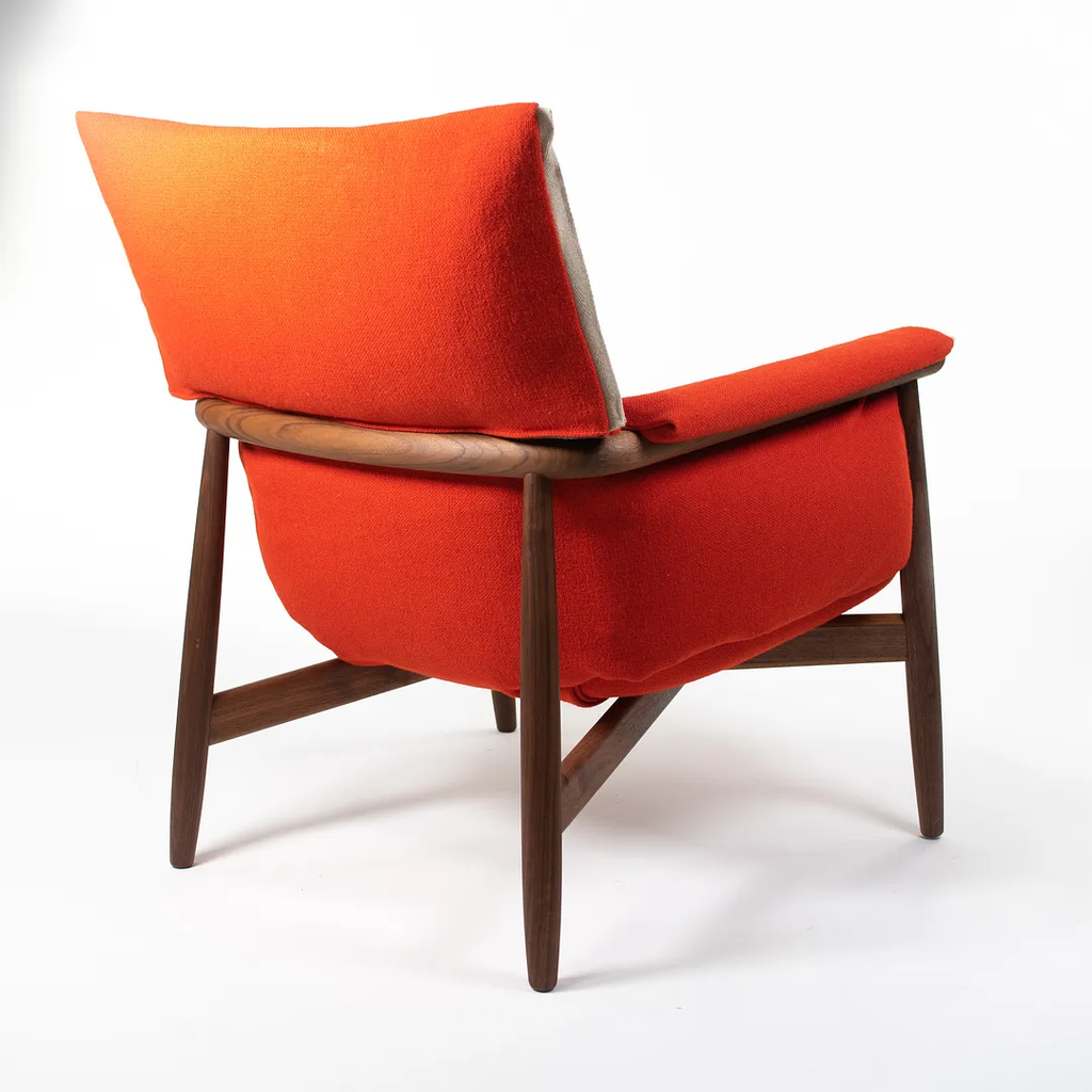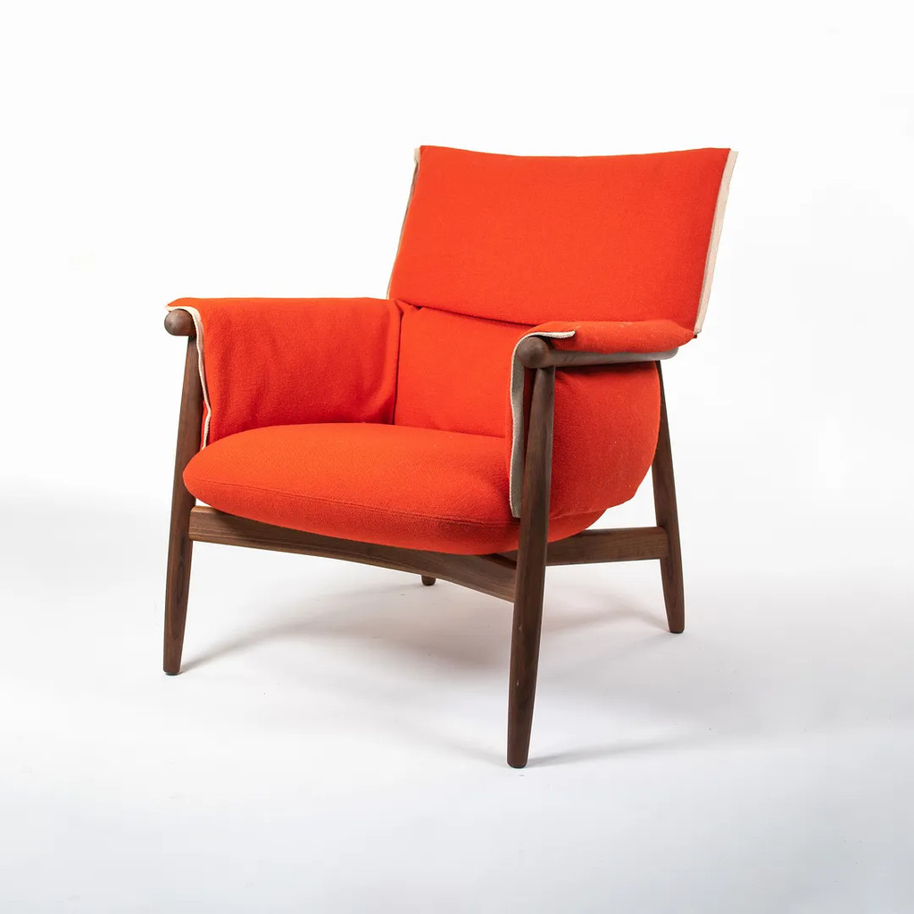 This is an EO15 Embrace Lounge Chair with a solid walnut frame, red / orange fabric upholstery, and natural edge strip. The chair was designed by EOOS and produced by Carl Hansen & Son in Denmark. The chair dates to circa 2020 and is guaranteed as authentic. Condition is excellent with only very light wear. See photos. This chair came directly from Carl Hansen. It was likely used as a floor model or display piece within their showroom.