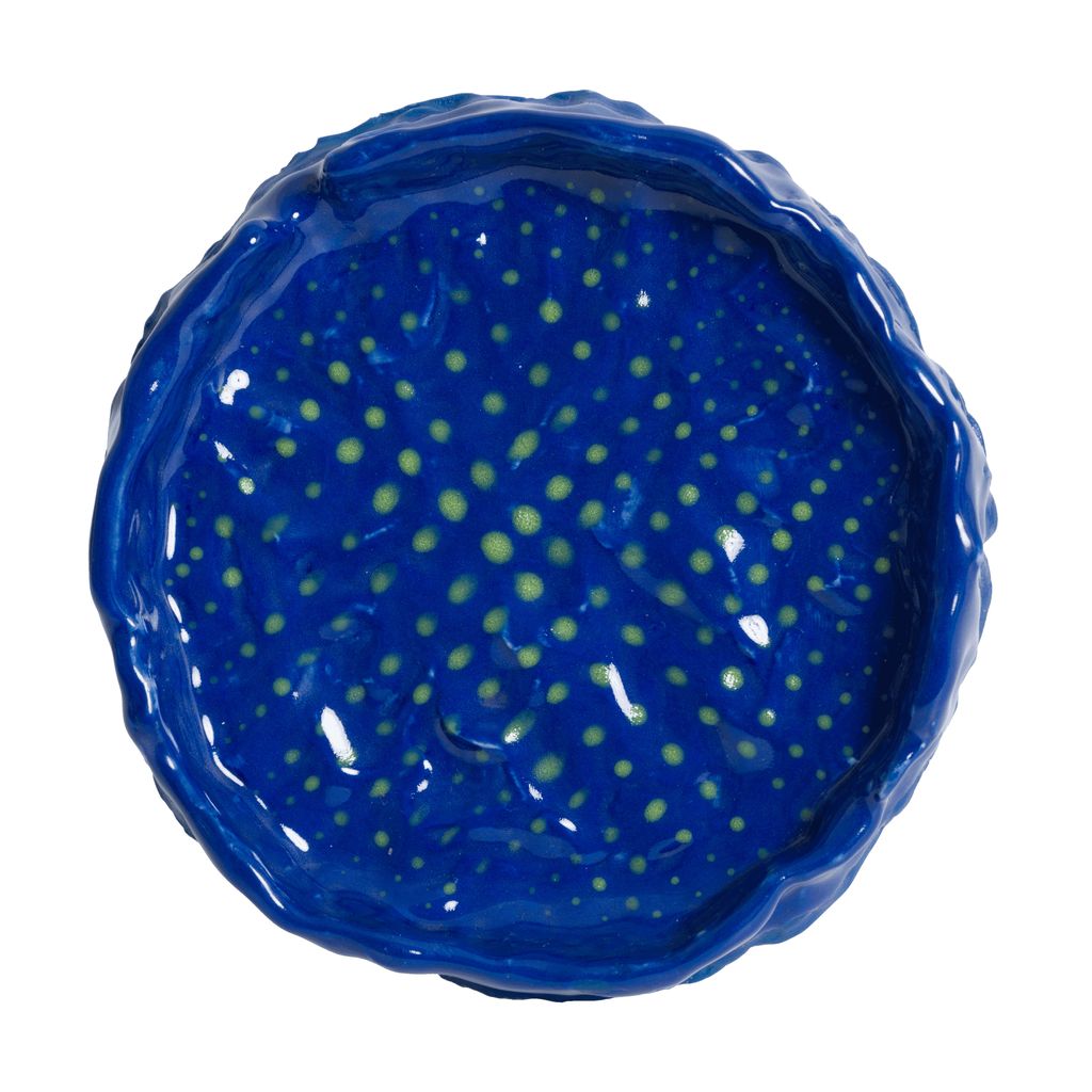 Handmade Ashtray with distinctive green dot pattern on blue coated ceramic.