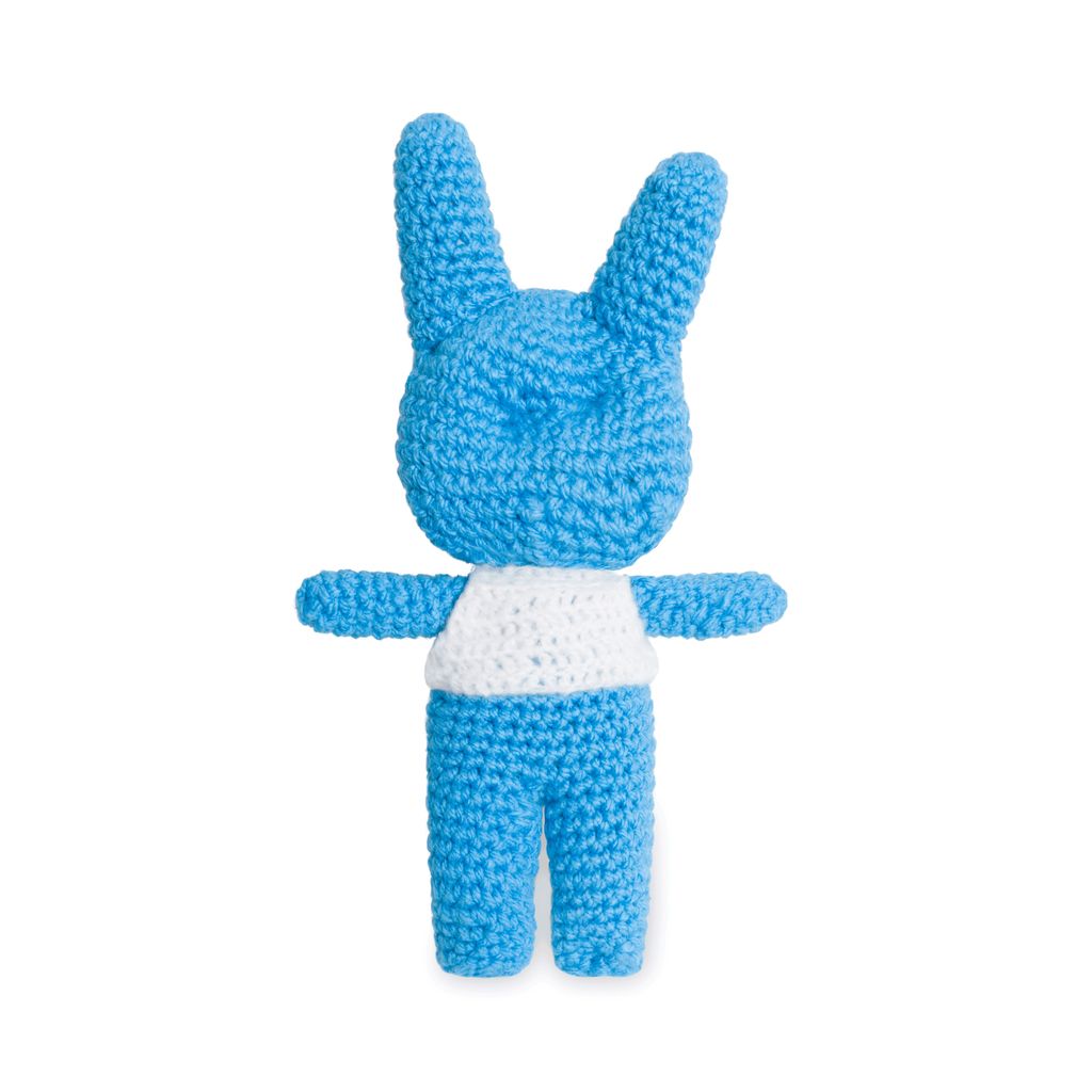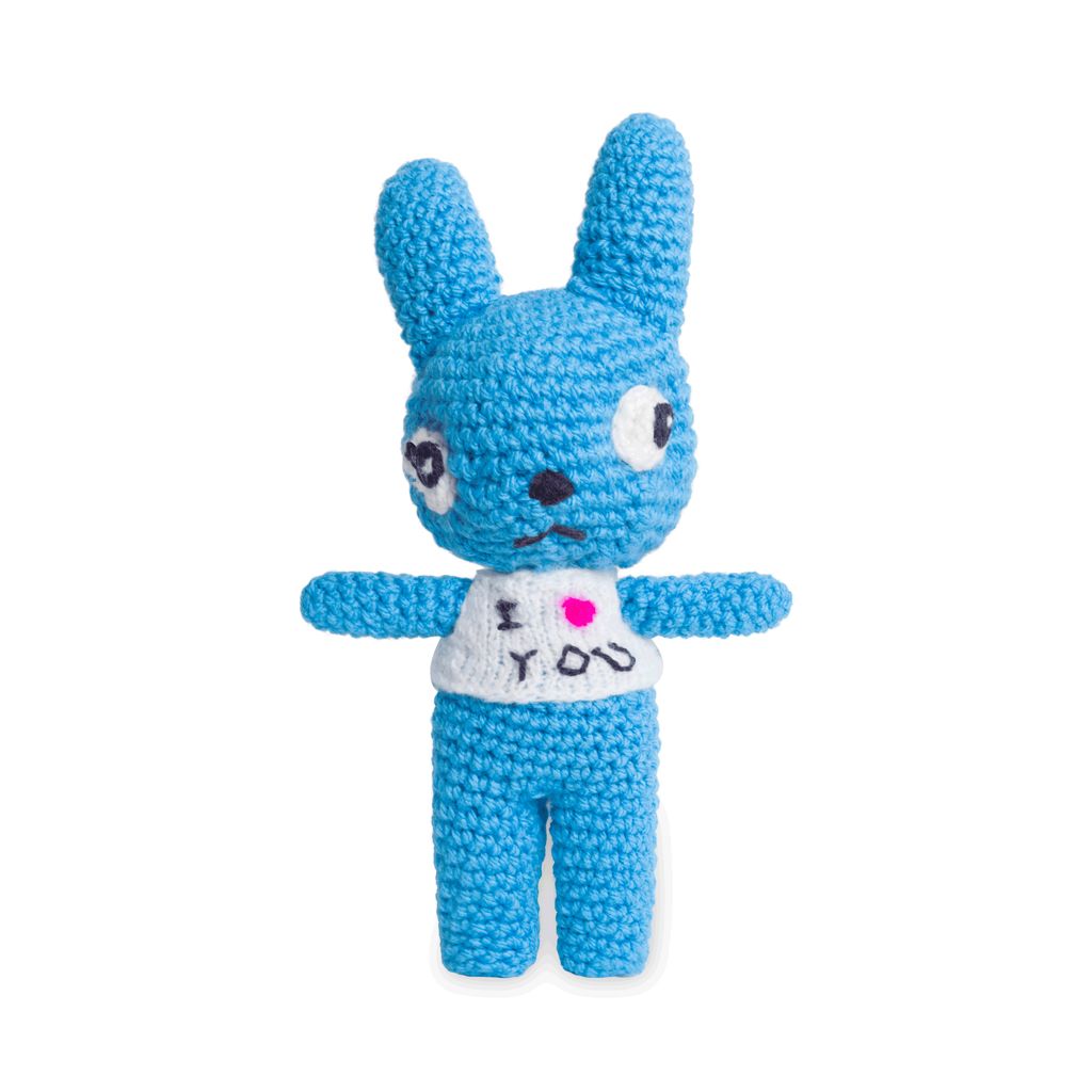 Handmade knit bunny wearing a white t-shirt that says "I <3 You".