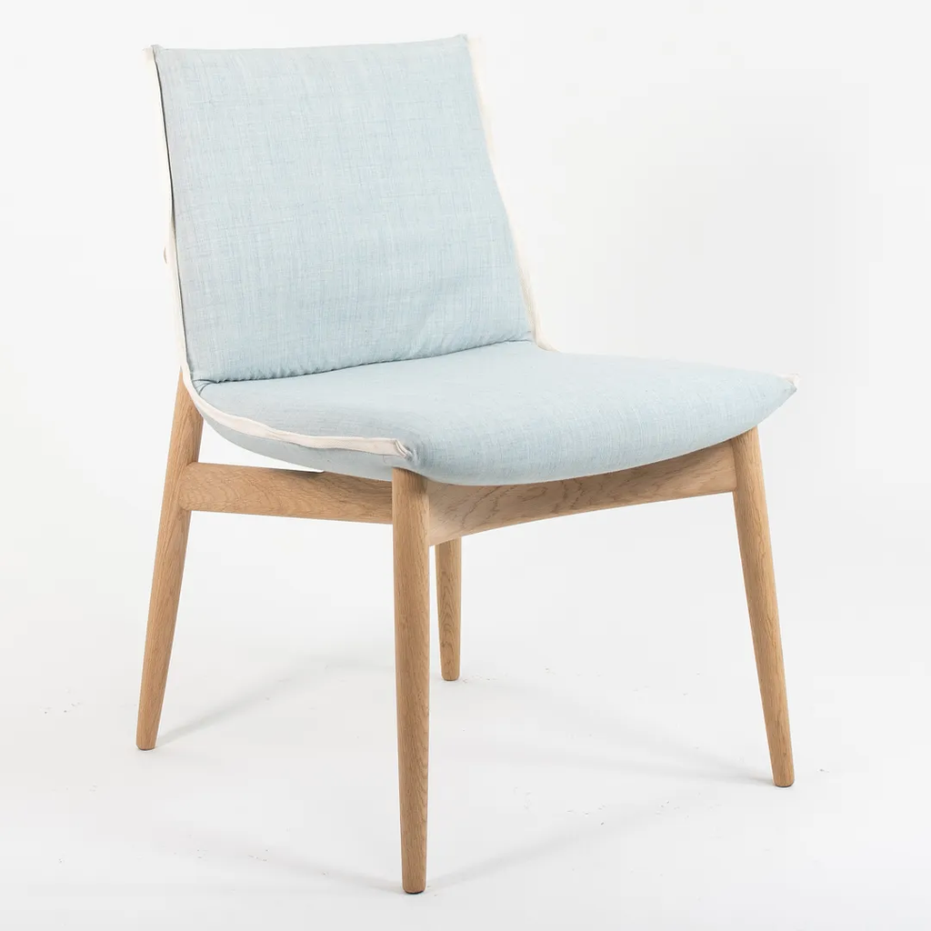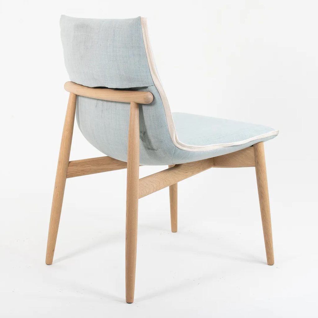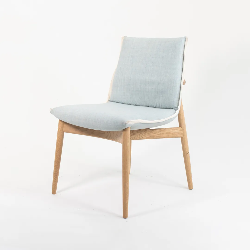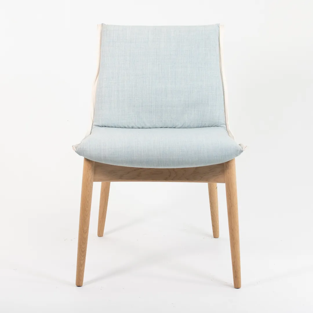 This is an EOO4 Embrace dining chair with a solid oak frame and a light blue down seat with white trim. The chair was designed by EOOS and produced by Carl Hansen & Son in Denmark. The chair was produced circa 2020 and is guaranteed as authentic. Condition is excellent with only minimal wear. See photos. The upholstery is a bit soiled, however, by request, we can have this professionally cleaned prior to shipping at no additional cost. This chair came directly from Carl Hansen. It was likely never used in a home or office setting but may have been a display or floor model within their showroom.
