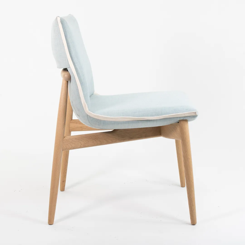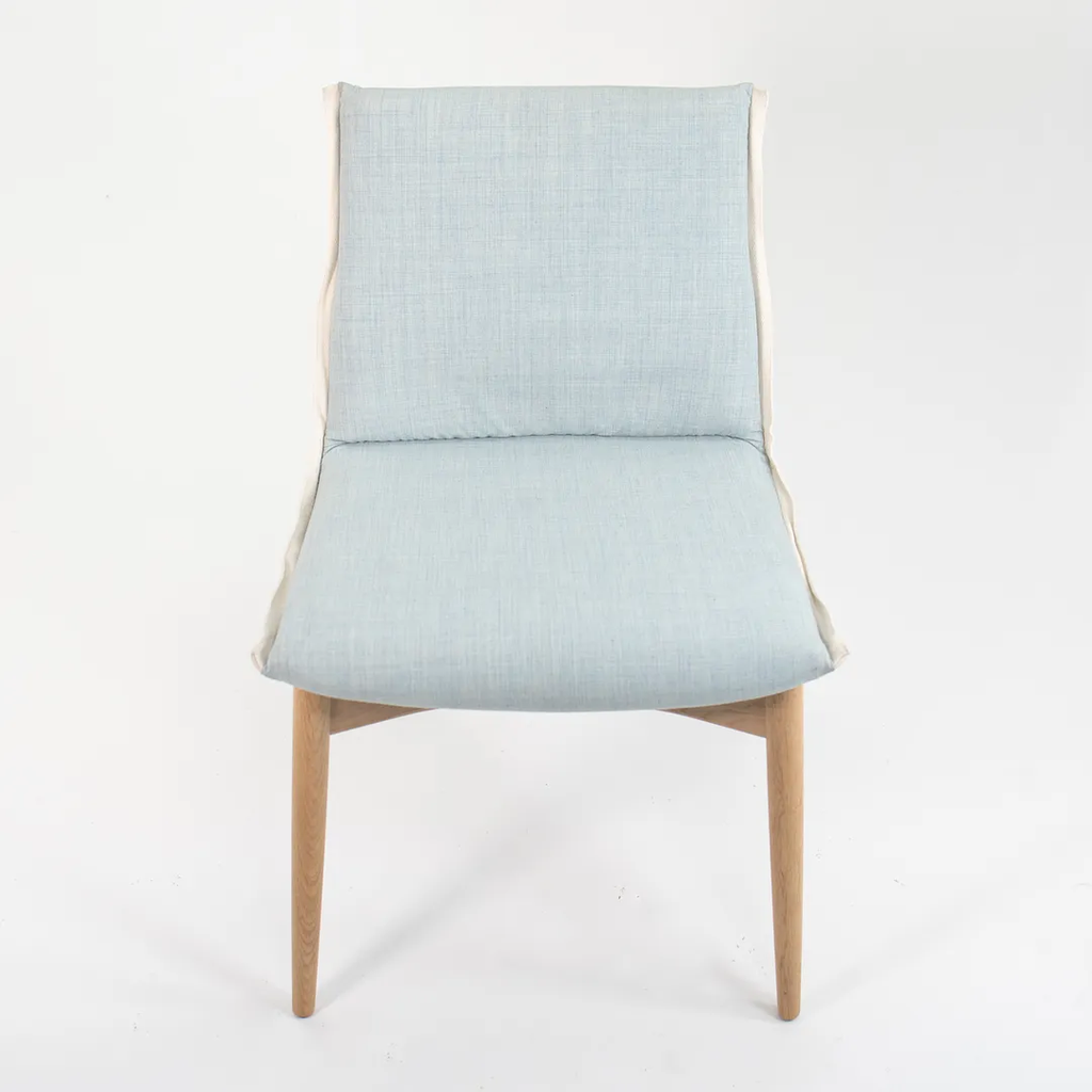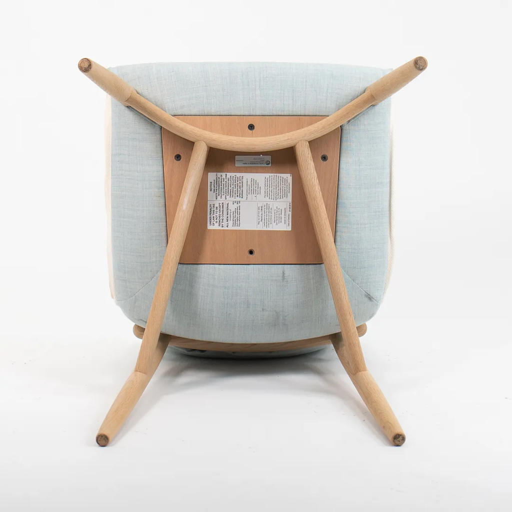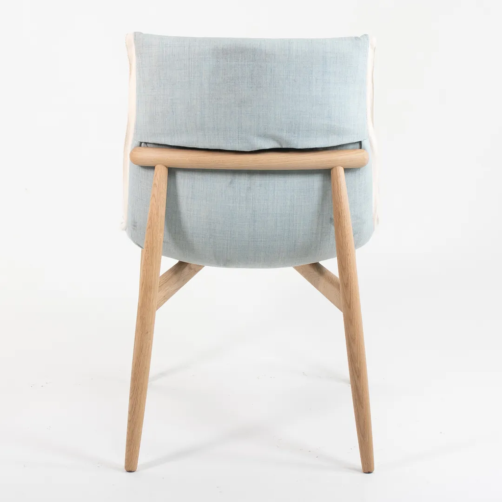 This is an EOO4 Embrace dining chair with a solid oak frame and a light blue down seat with white trim. The chair was designed by EOOS and produced by Carl Hansen & Son in Denmark. The chair was produced circa 2020 and is guaranteed as authentic. Condition is excellent with only minimal wear. See photos. The upholstery is a bit soiled, however, by request, we can have this professionally cleaned prior to shipping at no additional cost. This chair came directly from Carl Hansen. It was likely never used in a home or office setting but may have been a display or floor model within their showroom.