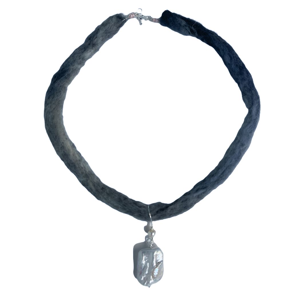 Blue Feltie features Murano wool hand-felted with single needle, Baroque pearl, freshwater pearls, and 925 silver hardware.