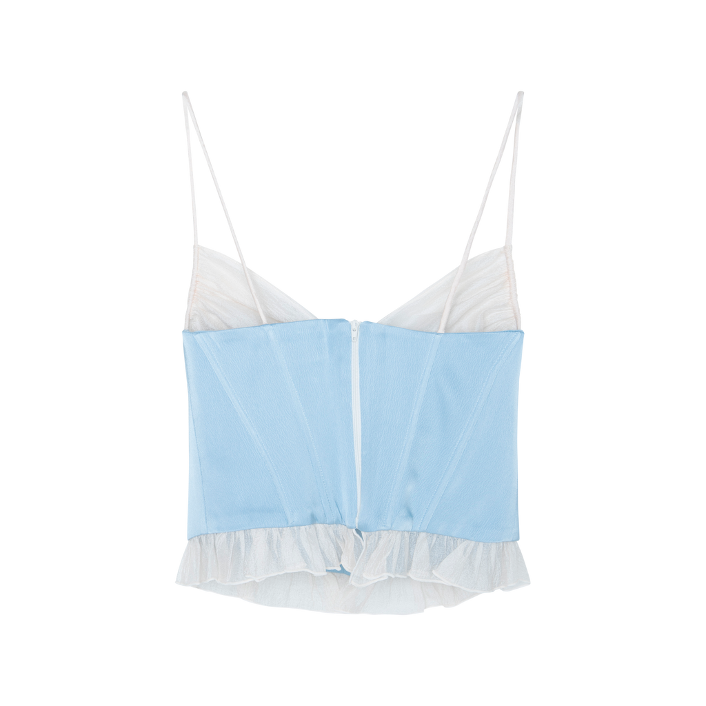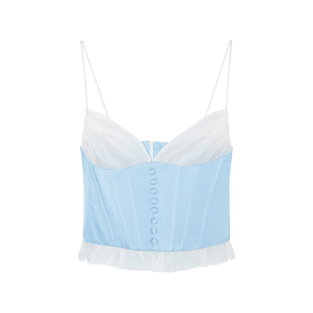 Isabel Corset - Blue features corset bustier top, center-front button up top, bottom frills, and center-back zip.