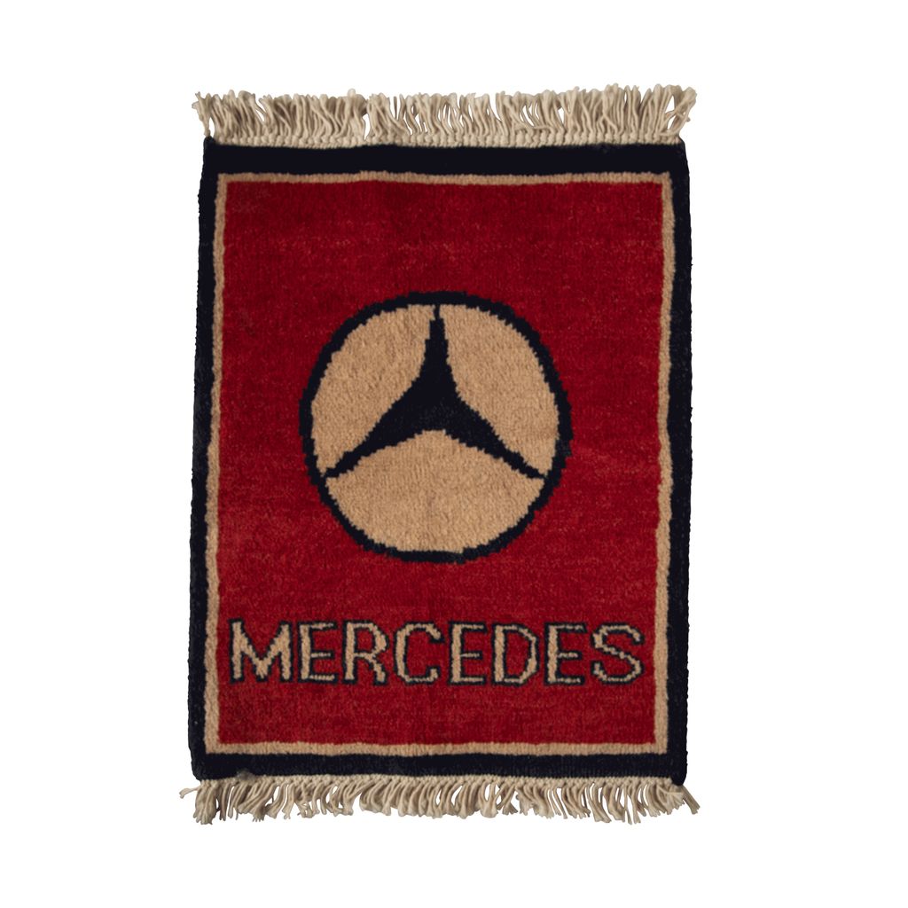 Blue Mercedes Vintage Car Rug features Mercedes logo design and is hand woven in Afghanistan.