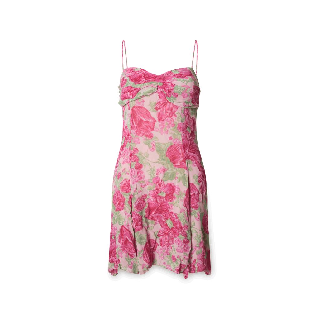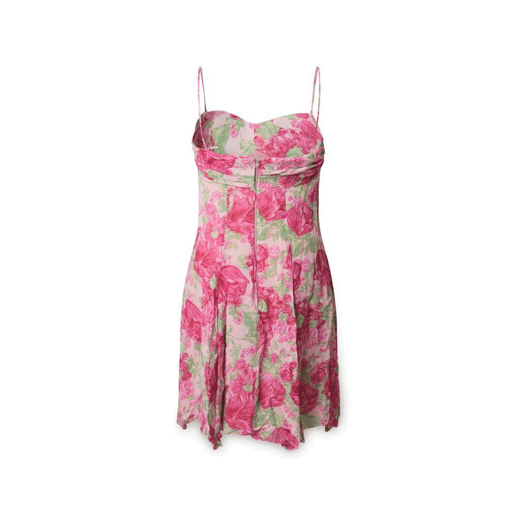 Blumarine Follies sundress features spaghetti straps, a pink floral pattern, and a zipper.