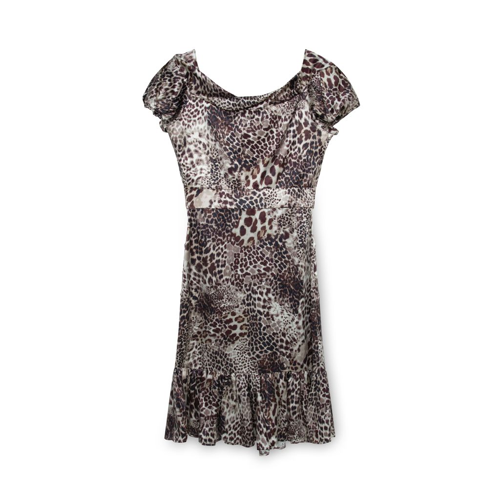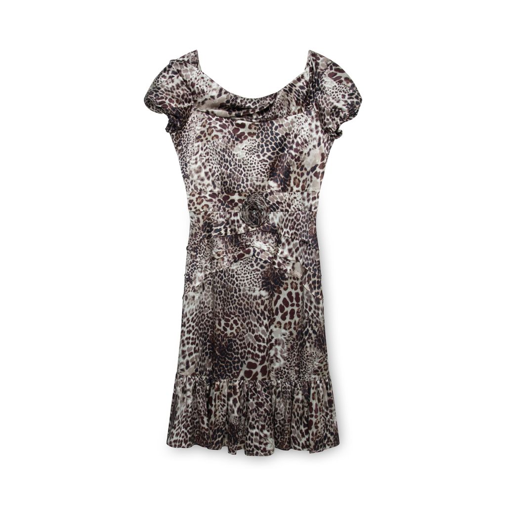 Blumarine leopard printed silk dress features animal print patterns throughout, draped neckline, flower detail with crystal embellishment at was it, and ruffle hem.