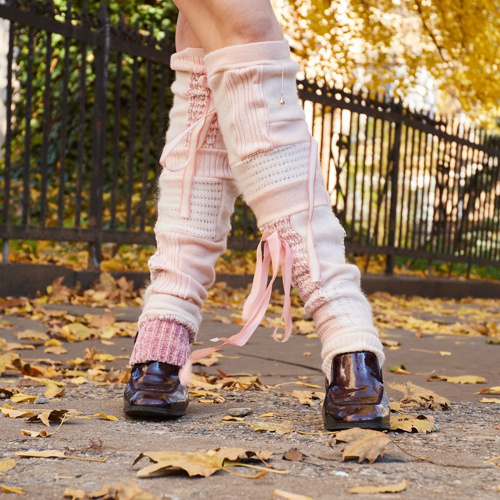 One of a kind leg warmers made from vintage blush pink sweaters, a mix of mohair and wool. Featuring hand beading and hand dyed silk ribbons.