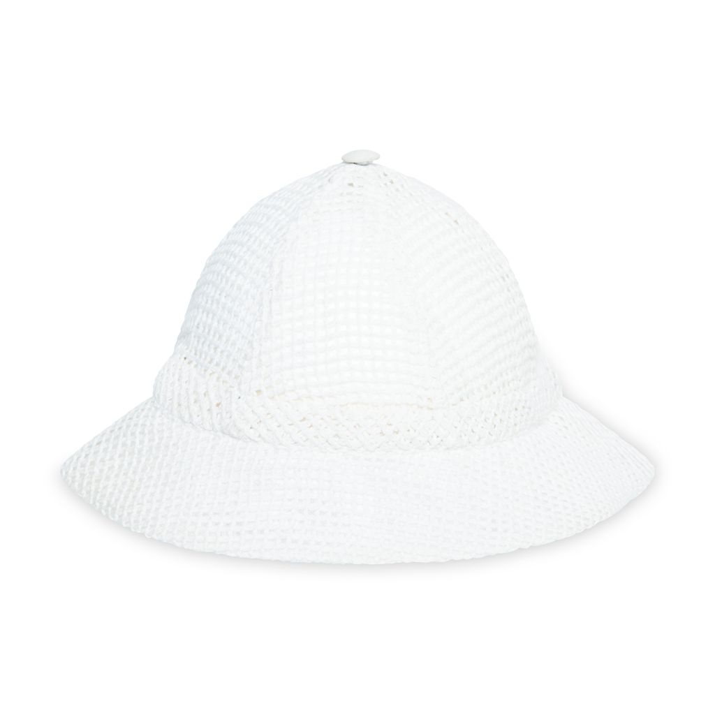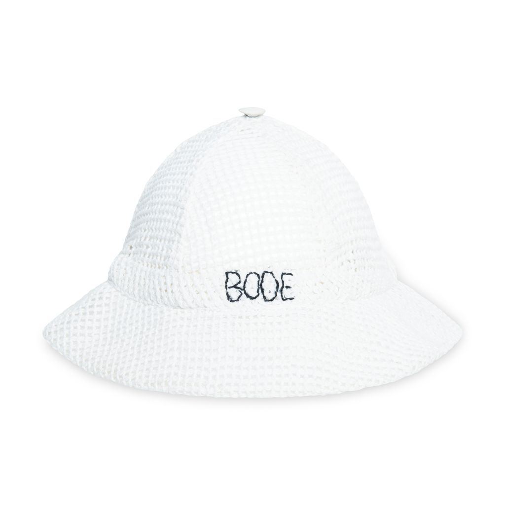Bode Bucket Hat is a white crocheted bucket hat with an embroidered Bode logo.