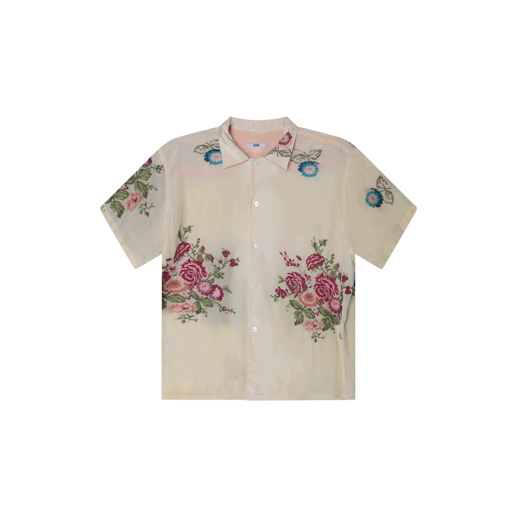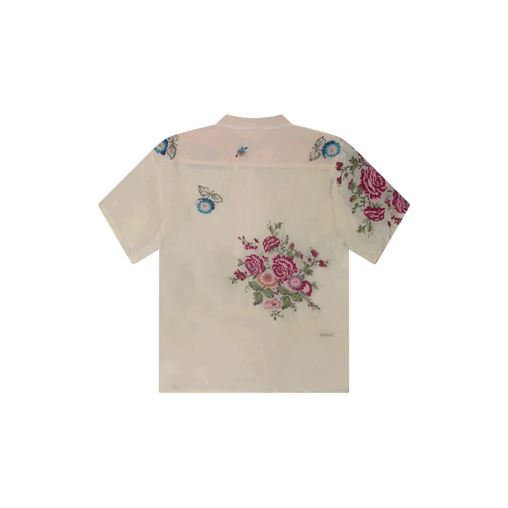 BODE Cream Floral Embroidered Button Up Shirt features embroidered floral design all over, front button closure, embroidered logo on back right, and boxy fit.
