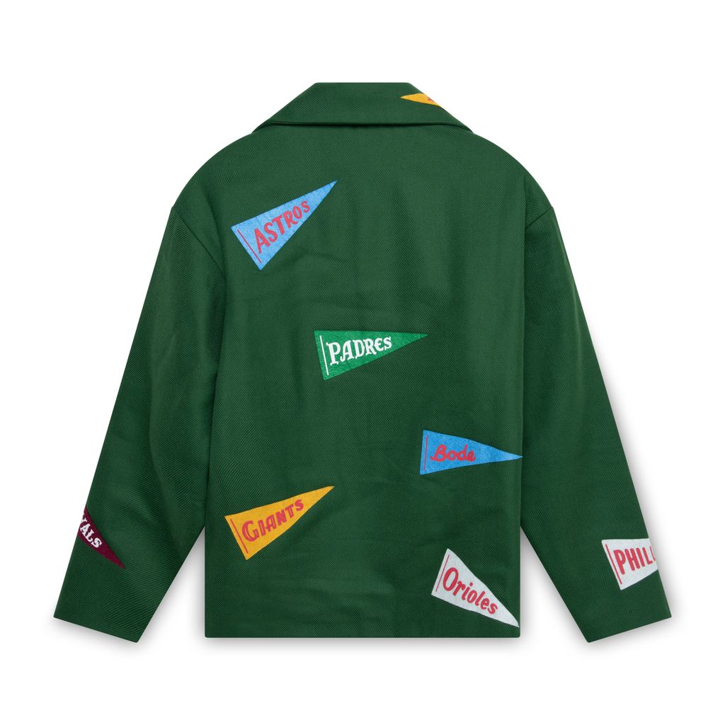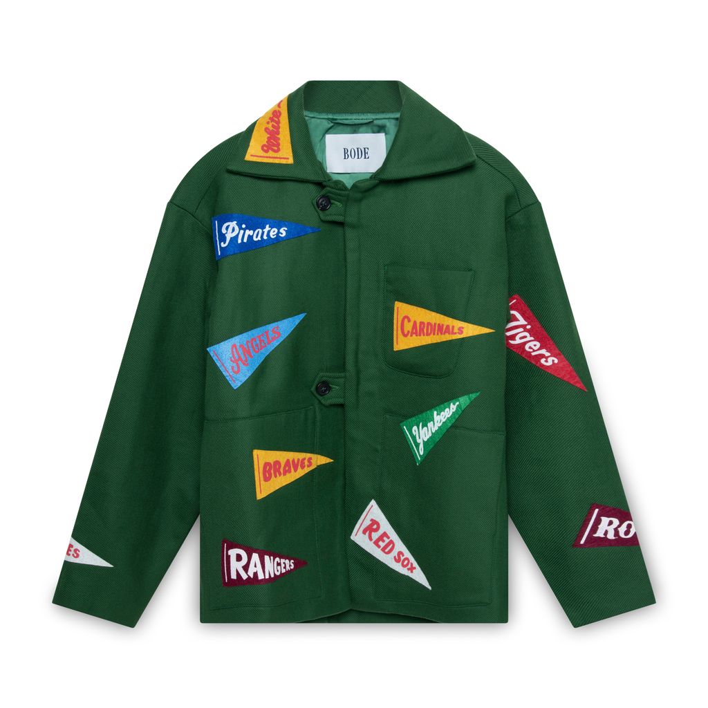 Bode Evergreen Pennant Jacket features handsewn vintage sport team flag patches. Limited Edition.