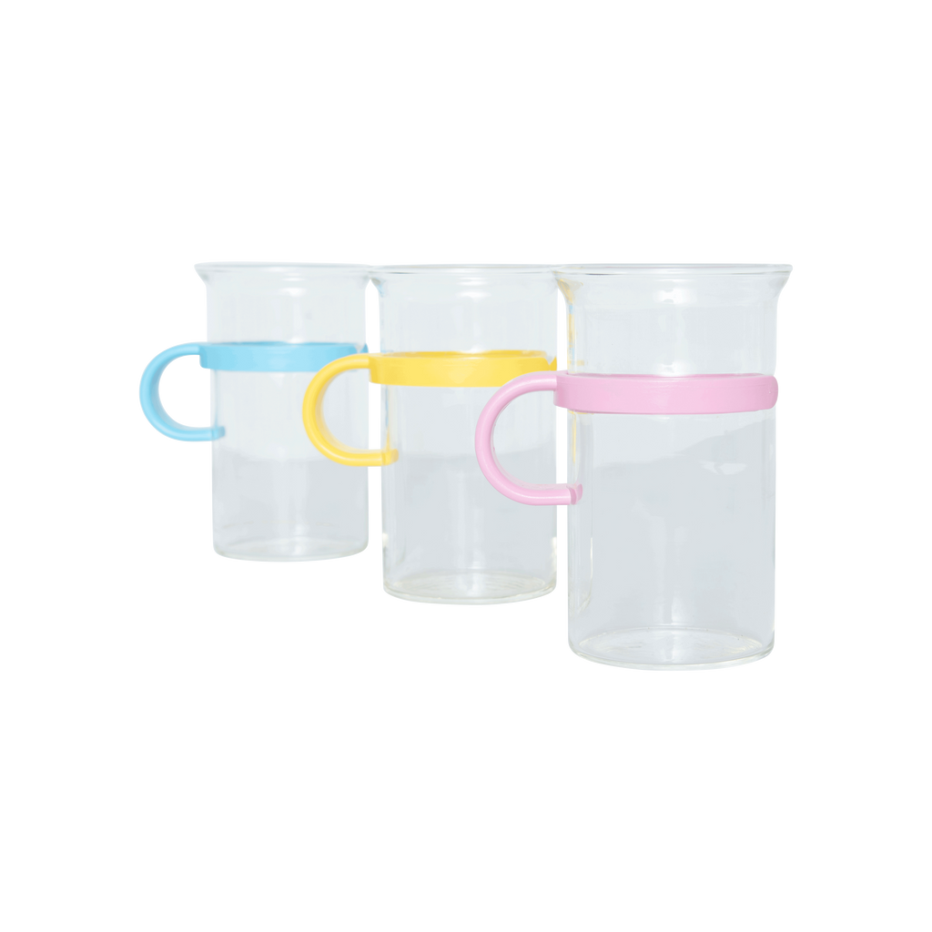 Bodum Glass Cups with Plastic Handle features set of 3 glass cups with yellow, pink, and blue handles.