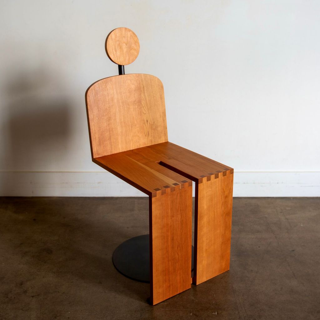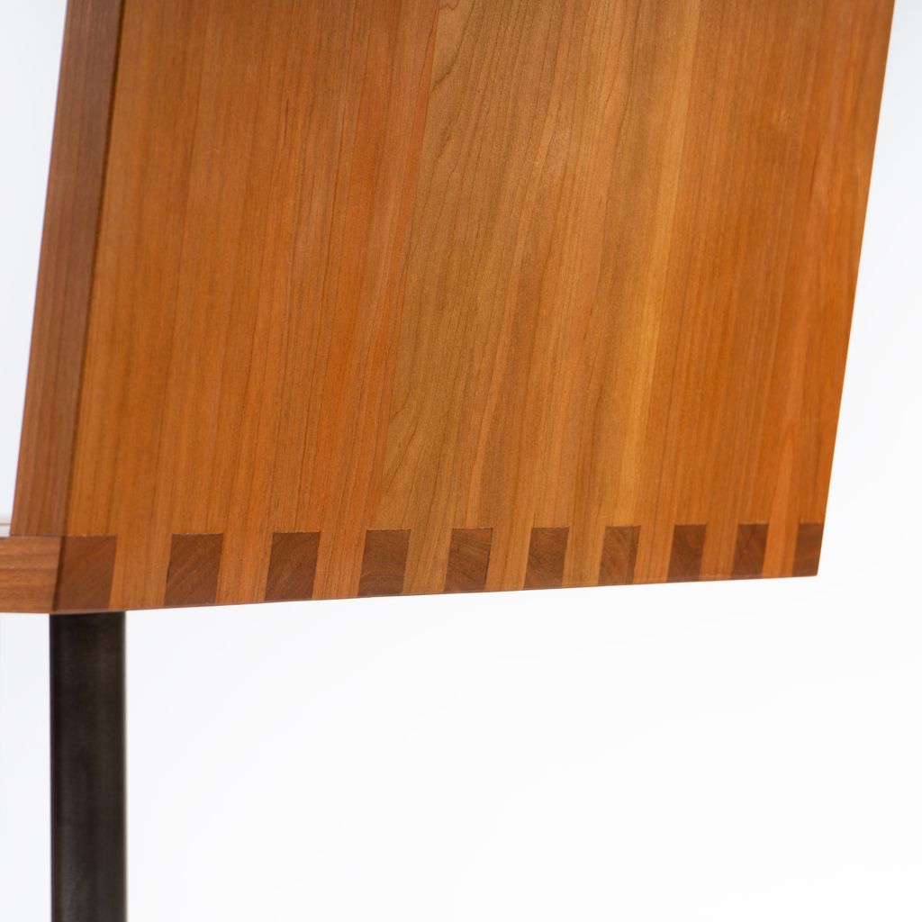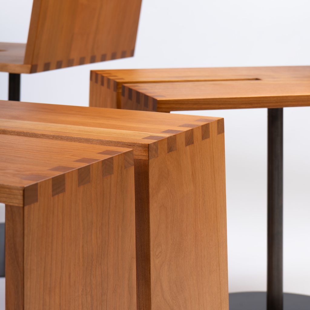 Handmade from cherry hardwood and steel, the body chair features a distinctive silhouette, patinated steel, and box joints. The chair looks at you and says “look at my box joints, aren’t they wonderful?”. Finished in natural oil.