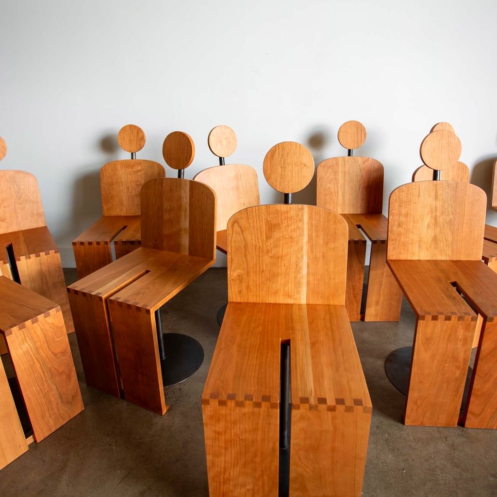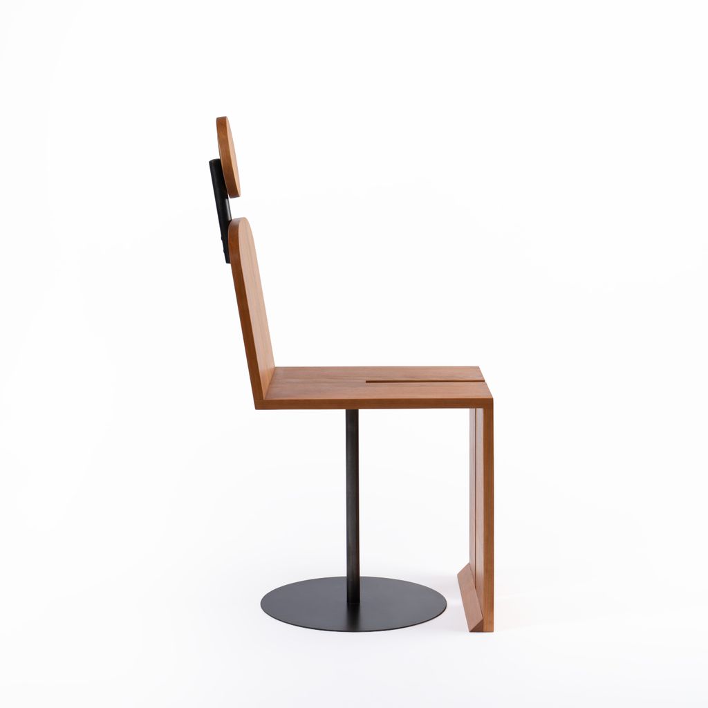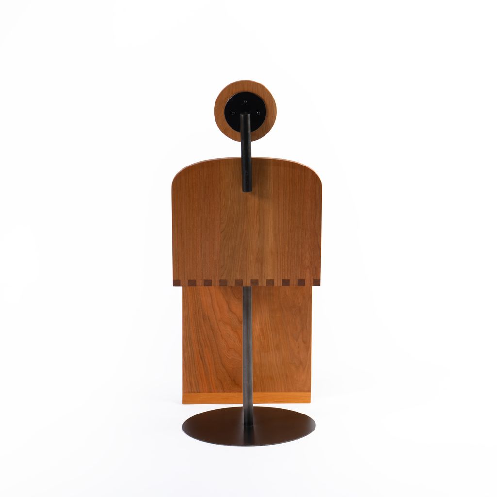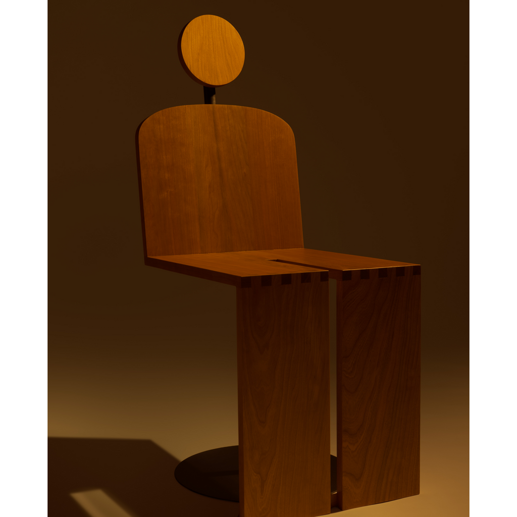 Handmade from cherry hardwood and steel, the body chair features a distinctive silhouette, patinated steel, and box joints. The chair looks at you and says “look at my box joints, aren’t they wonderful?”. Finished in natural oil.