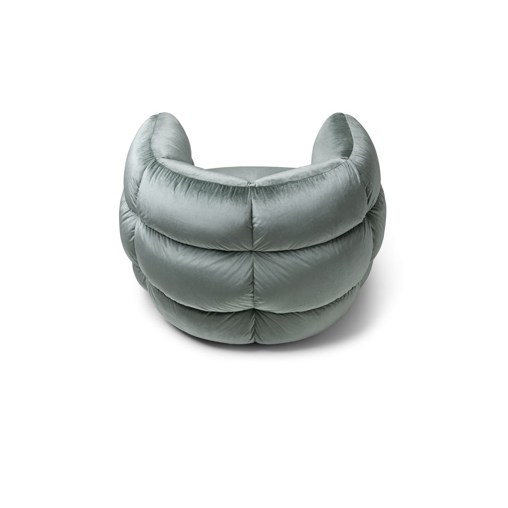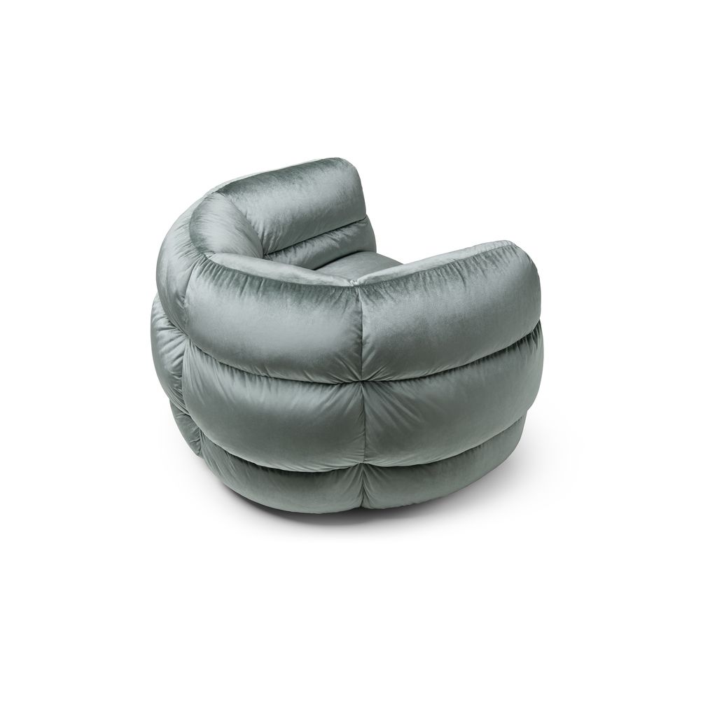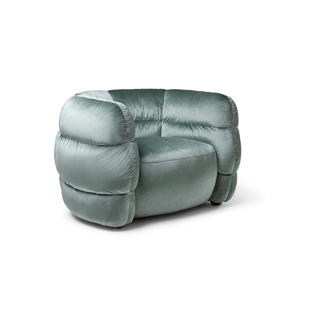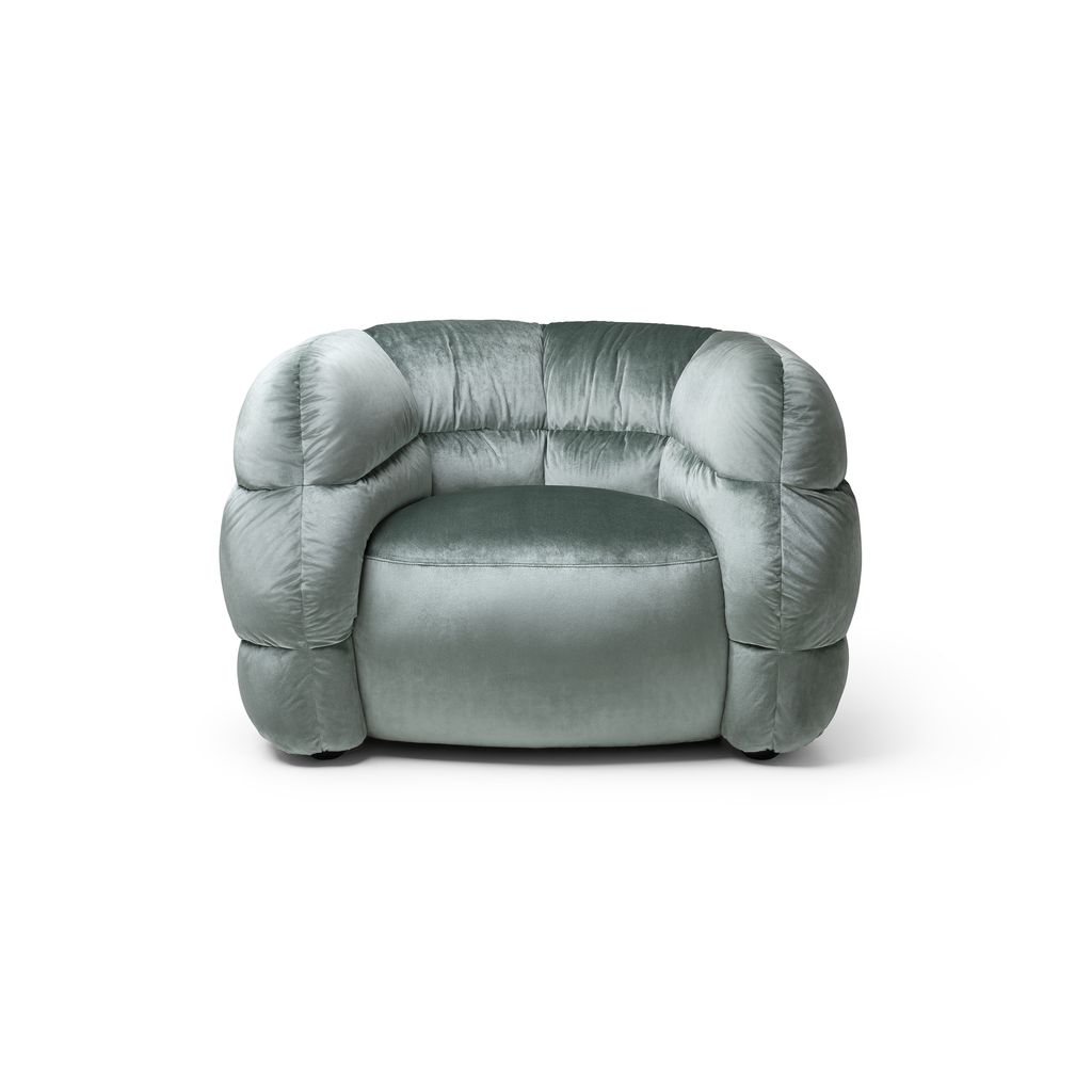 Upholstered armchair in leather or fabric, plywood and fir solid wood. Seat with elastic straps springing and seat cushions in open-cell polyurethane foam with a density of 35 kg/m3 and Memory foam, covered by a quilted goose down padding. Armrests and backrest upholstered with differentiated density polyurethane and padding with single chambers filled with micromax technical fiber, forming a soft cover with a "down effect", both inside and outside.