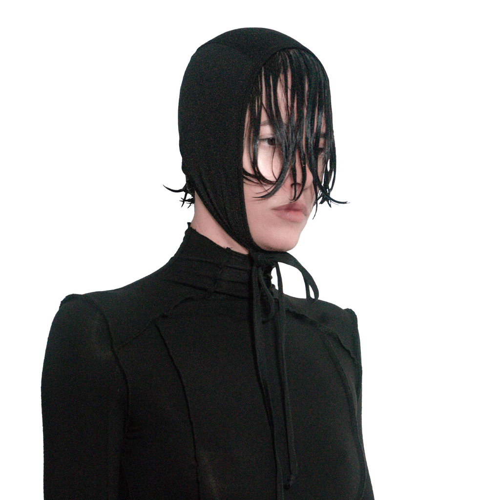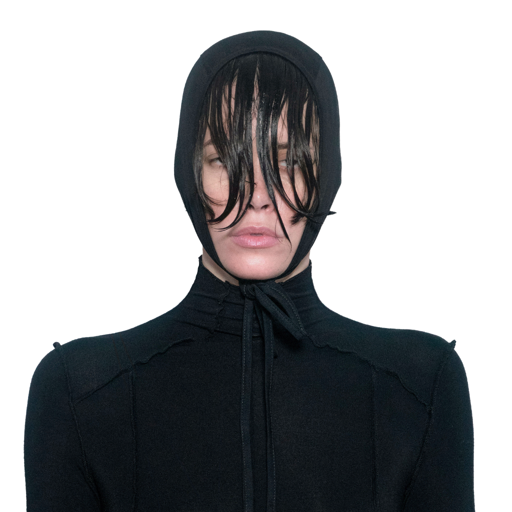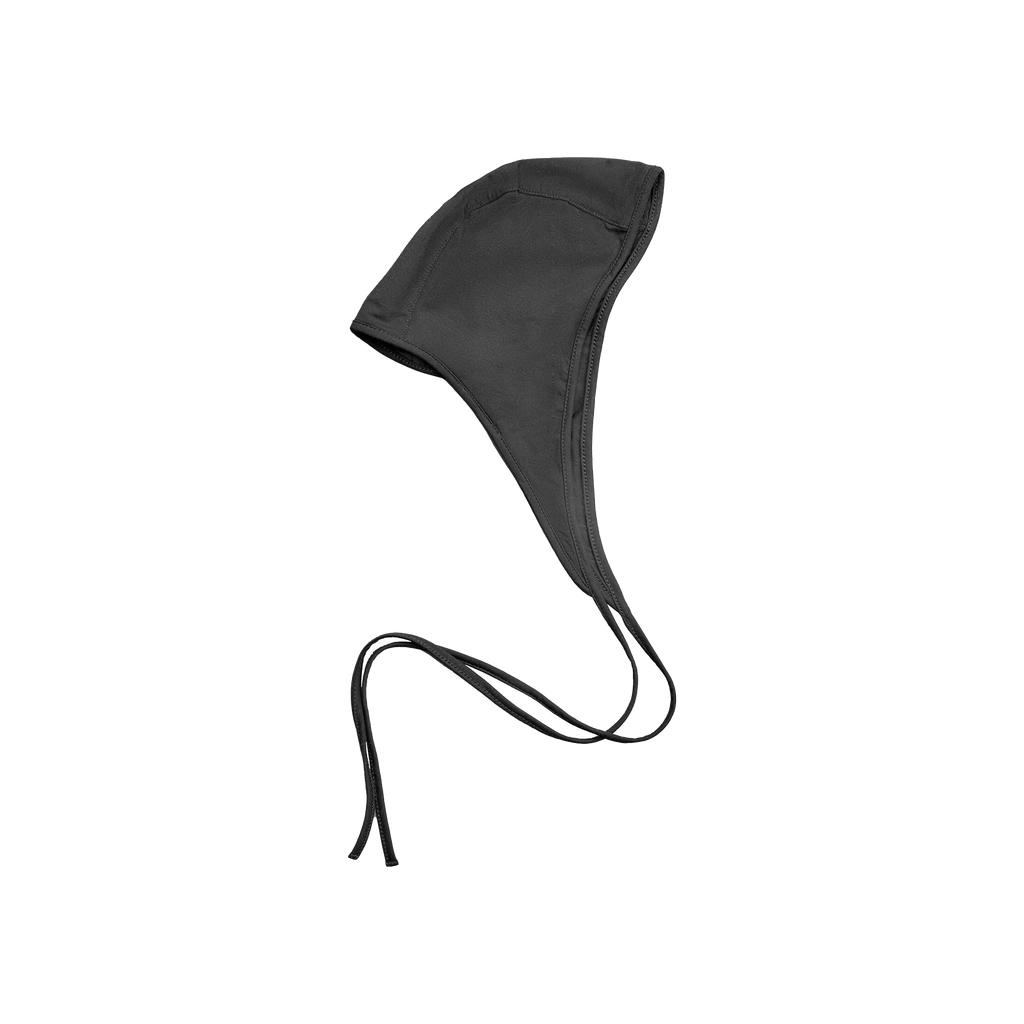 Functional black bonnet made in Italy with an adjustable drawstring, designed for comfort. PRODUCTS by Betsy Johnson, powered by UY Studio.