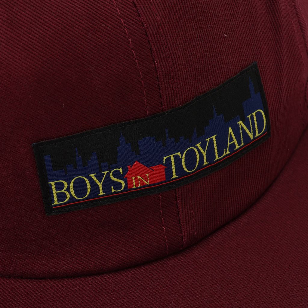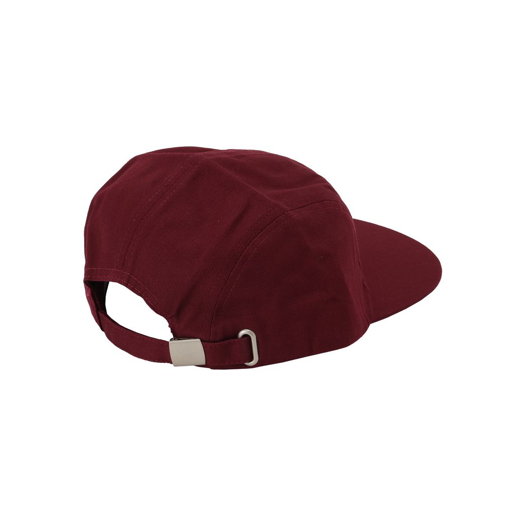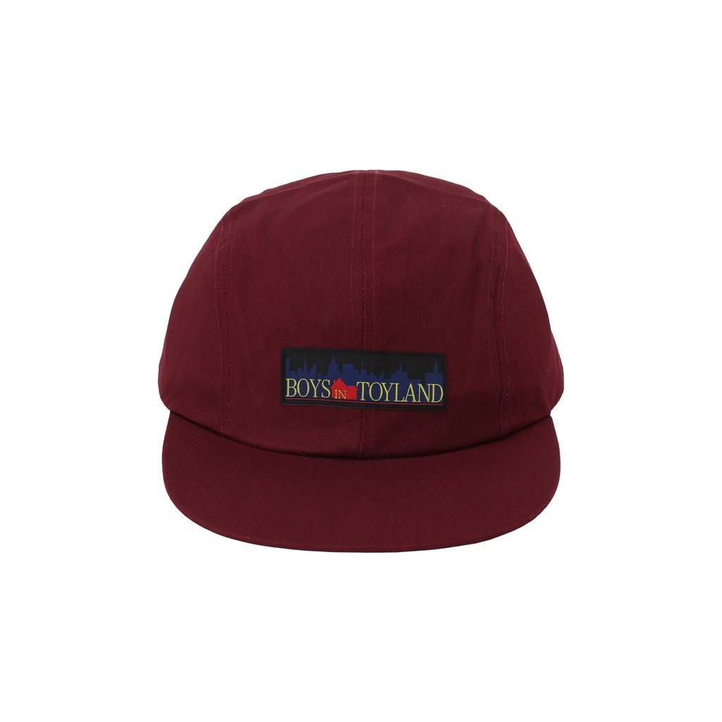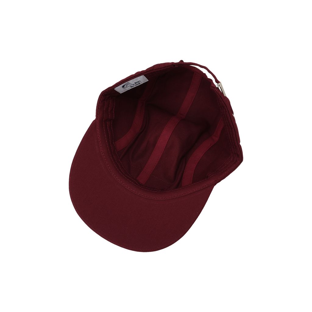 CITY LOGO CAMPER CAP - BORDEAUX features camp cap inspired by outdoor wear, short brim, and woven logo patch.