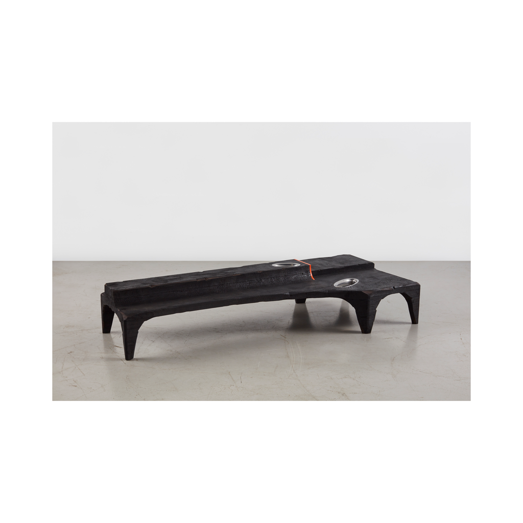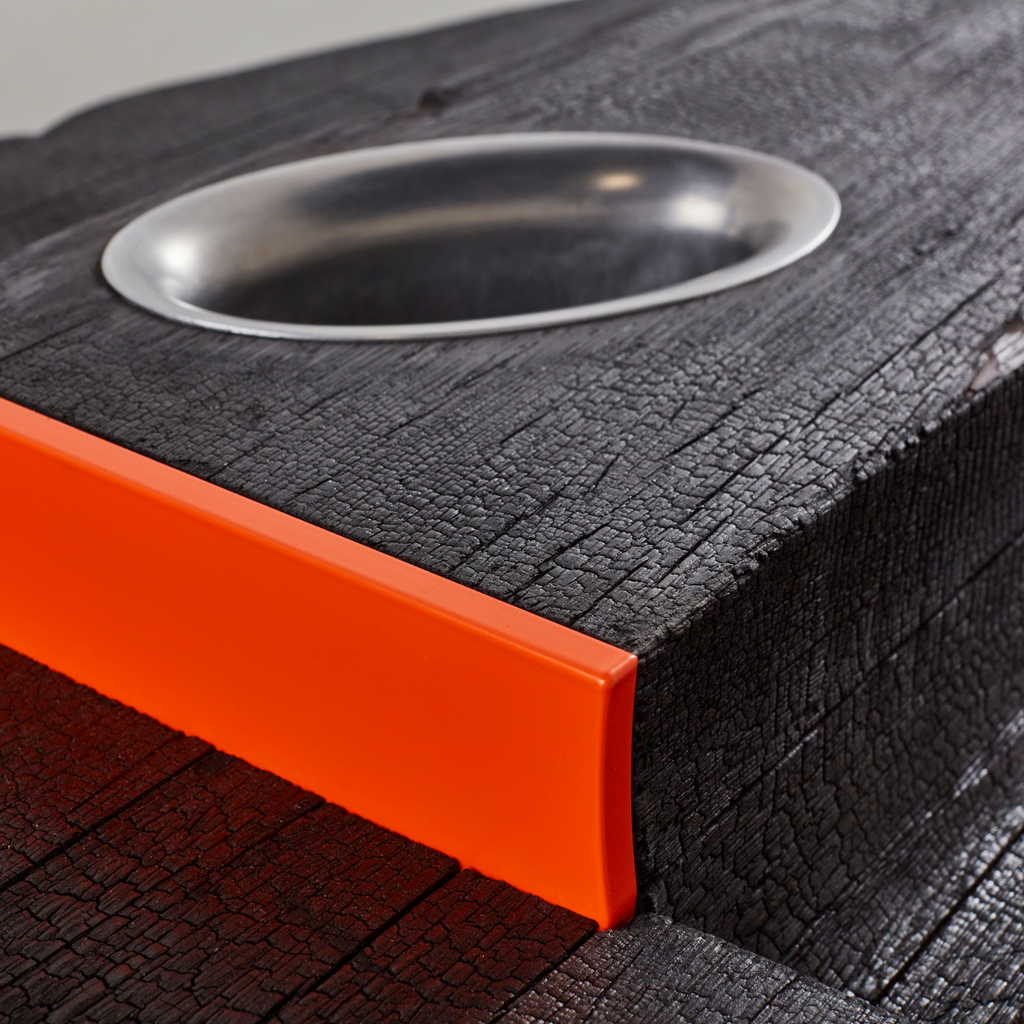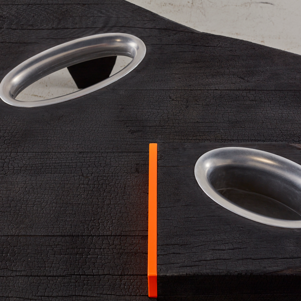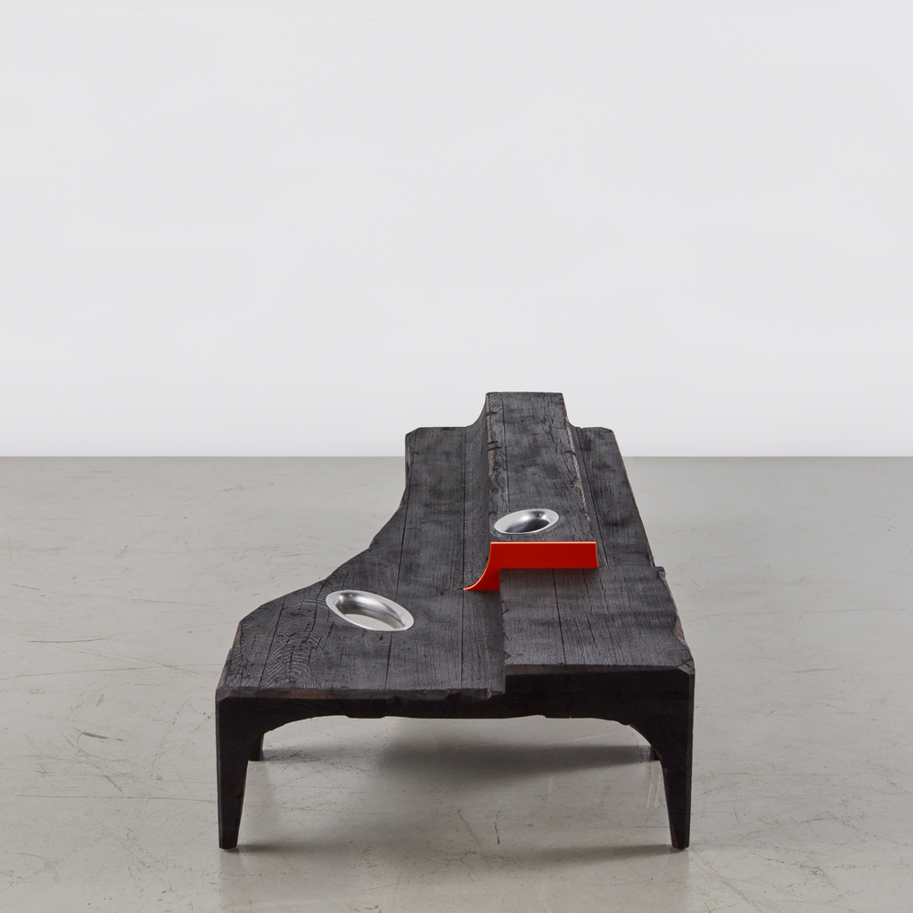 Fired wenge, planished aluminum, powder-coasted steel, melamine lacquer.