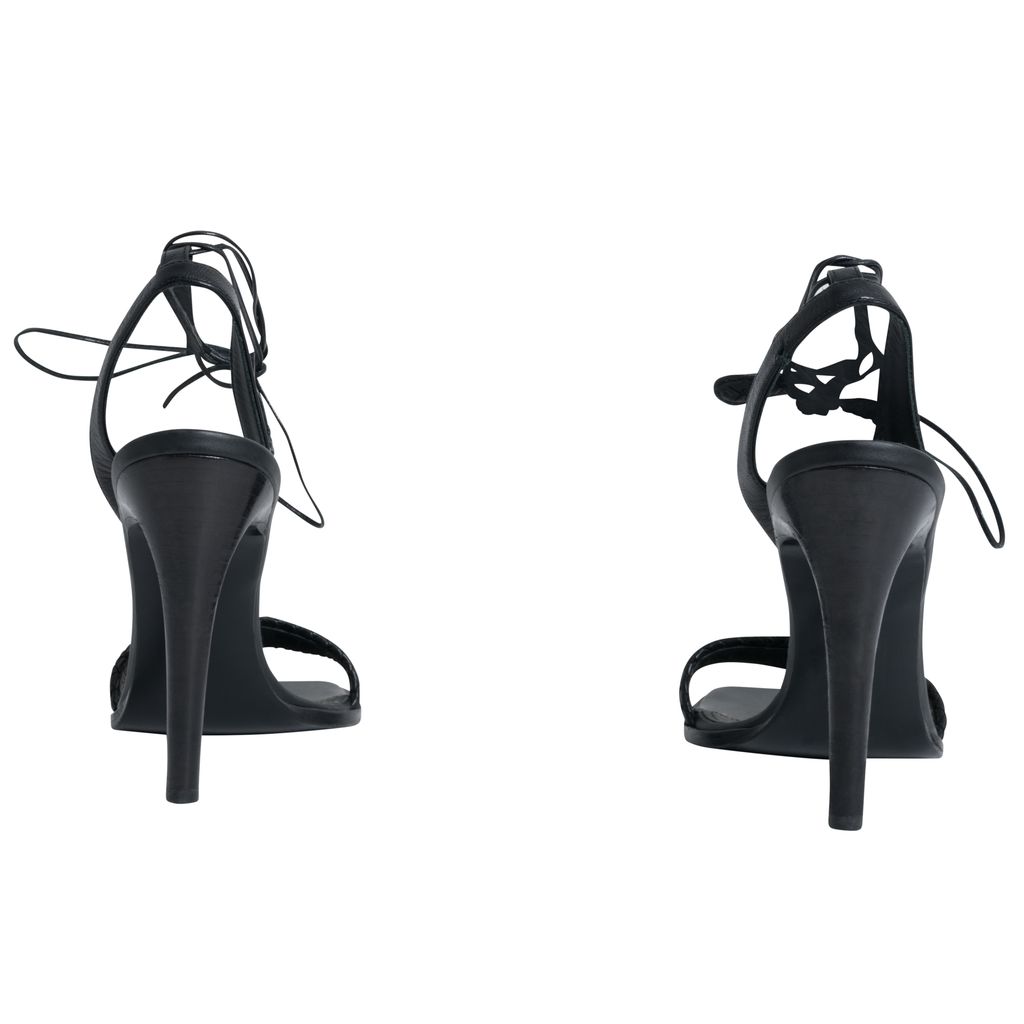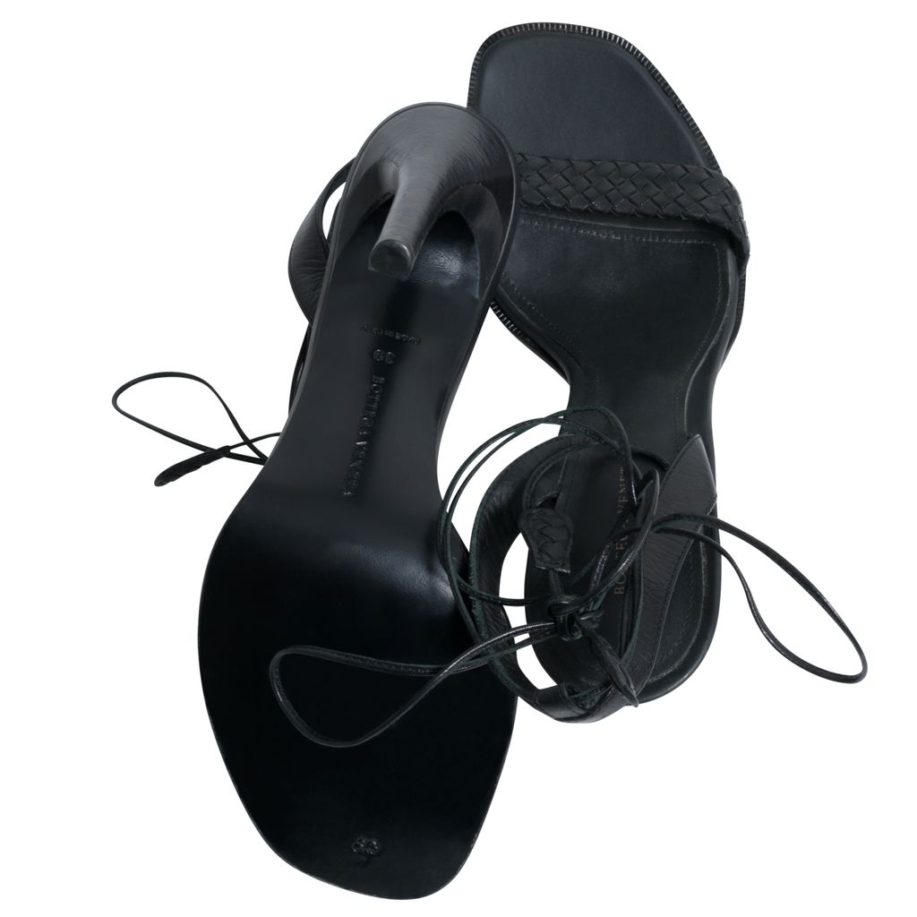 These black leather strappy heels from Bottega Veneta feature a braided strap across the toes, ankle ties with braided tab detail on the end. In excellent condition. Minor scratch on the right heel and ankle strap.