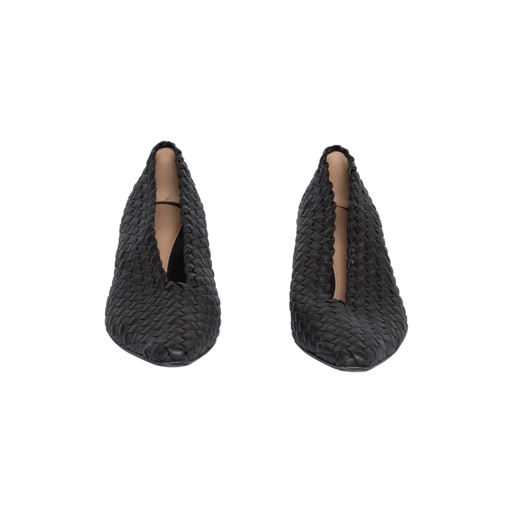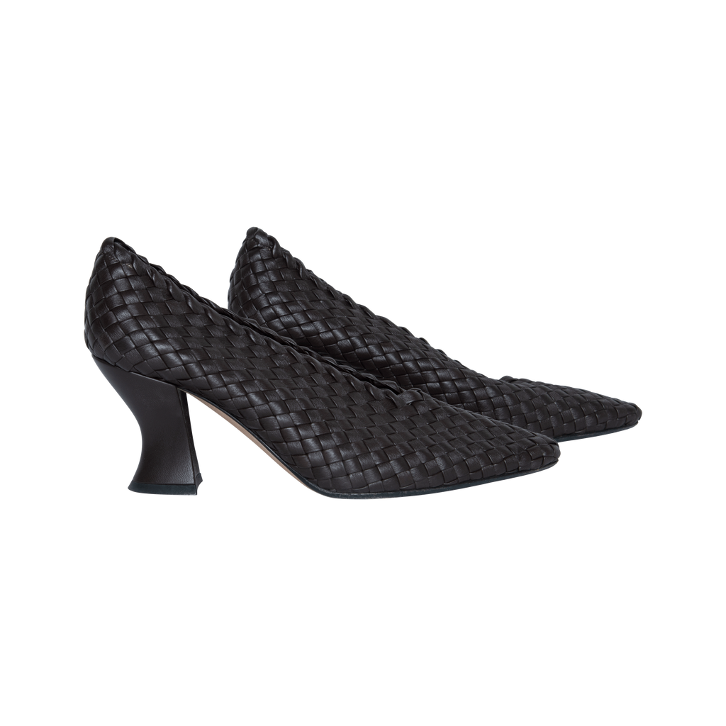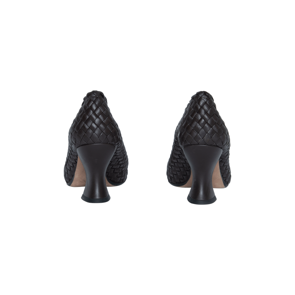 Bottega Veneta Brown Intrecciato Nappa Leather Almond Pumps features signature woven intrecciato nappa leather, slip on style, and almond shaped toe.
