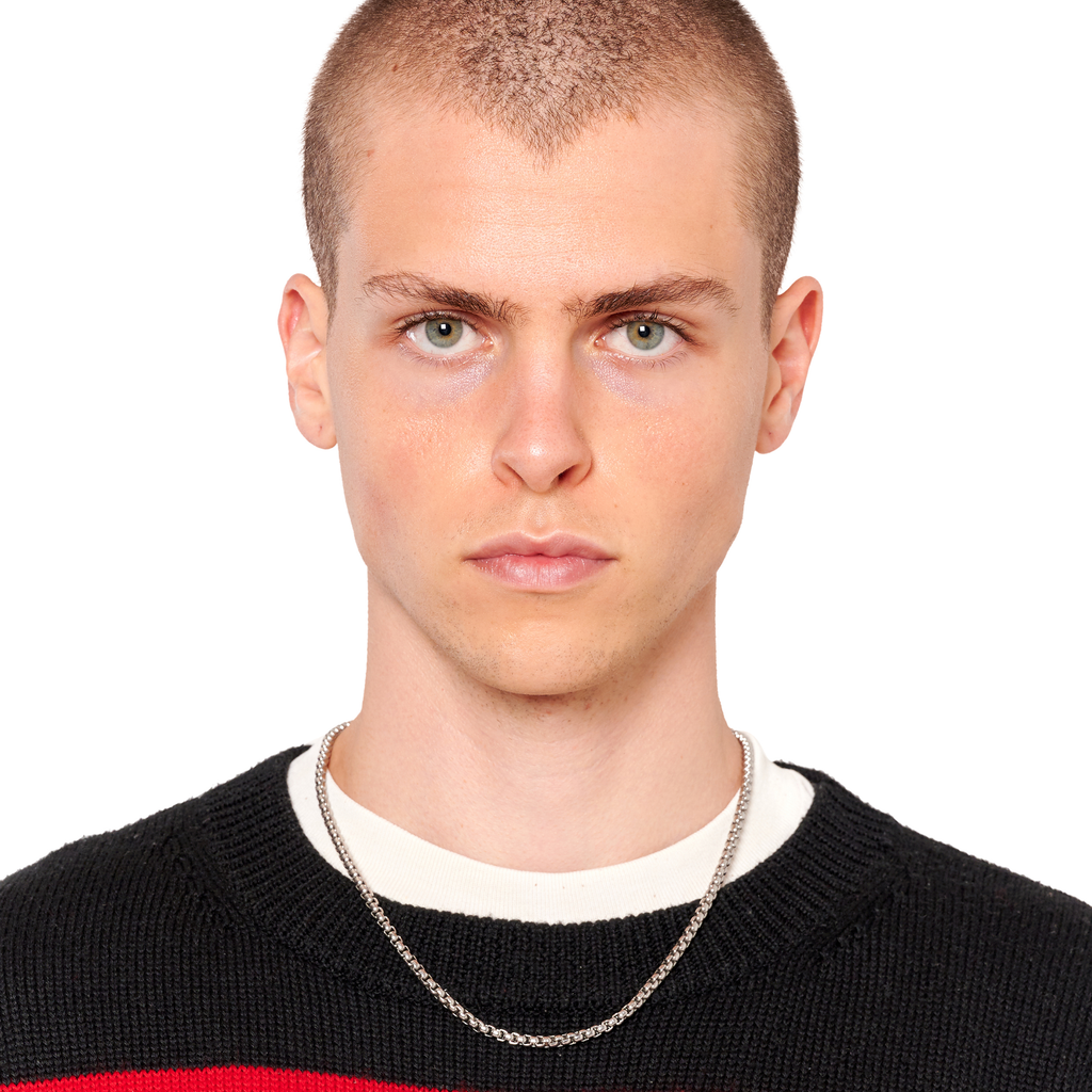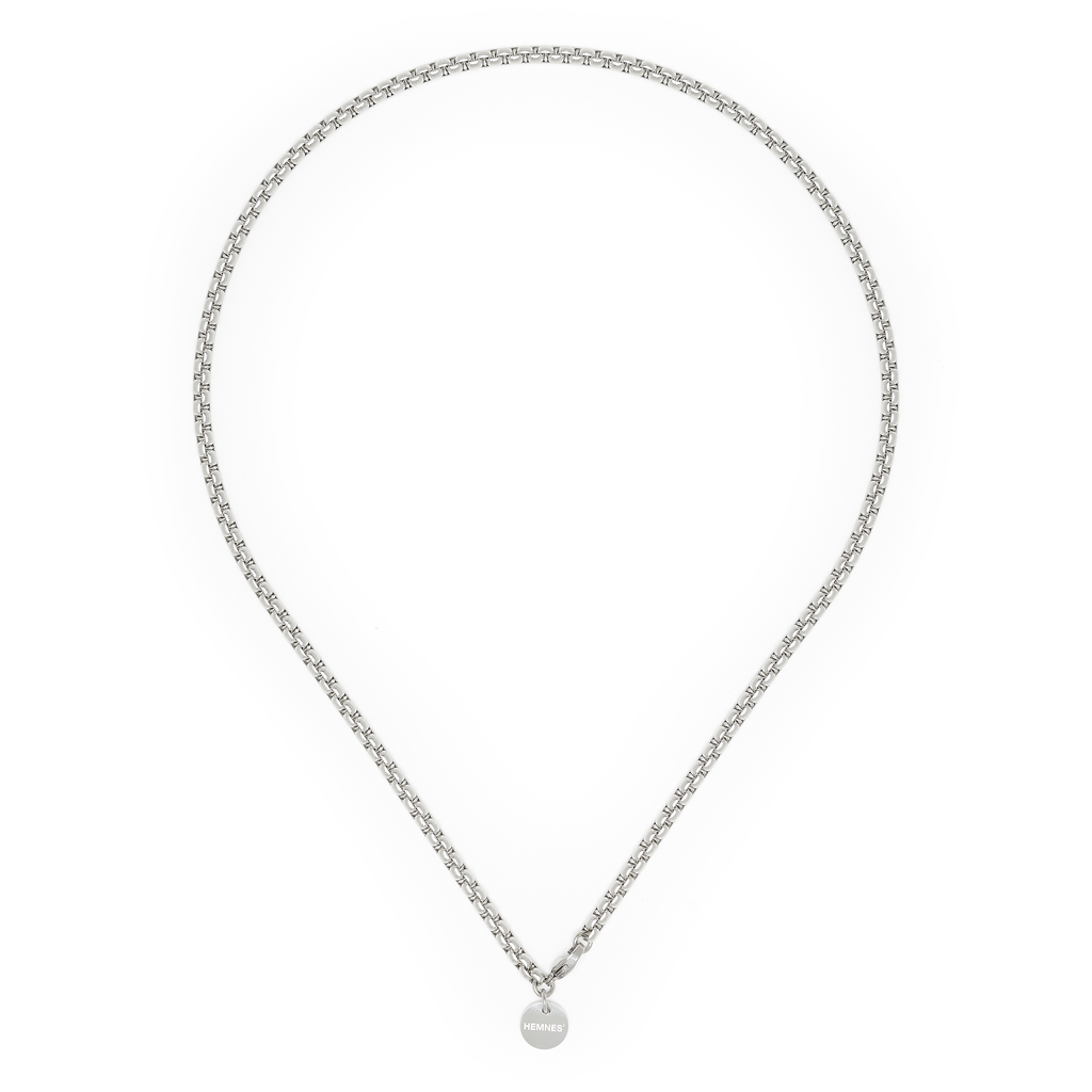 Handcrafted necklace in stainless steel. Lobster clasp closure. Logo engraved charm. Made in Los Angeles, CA.