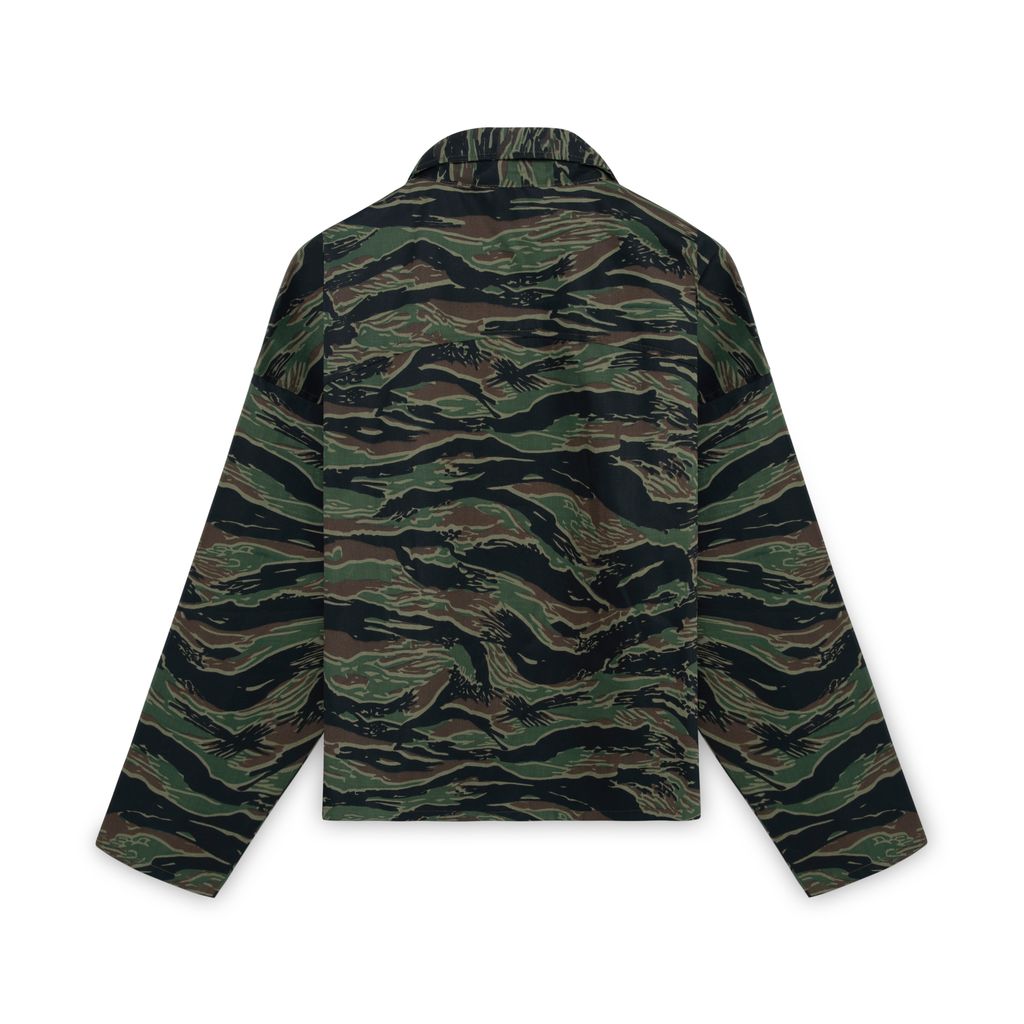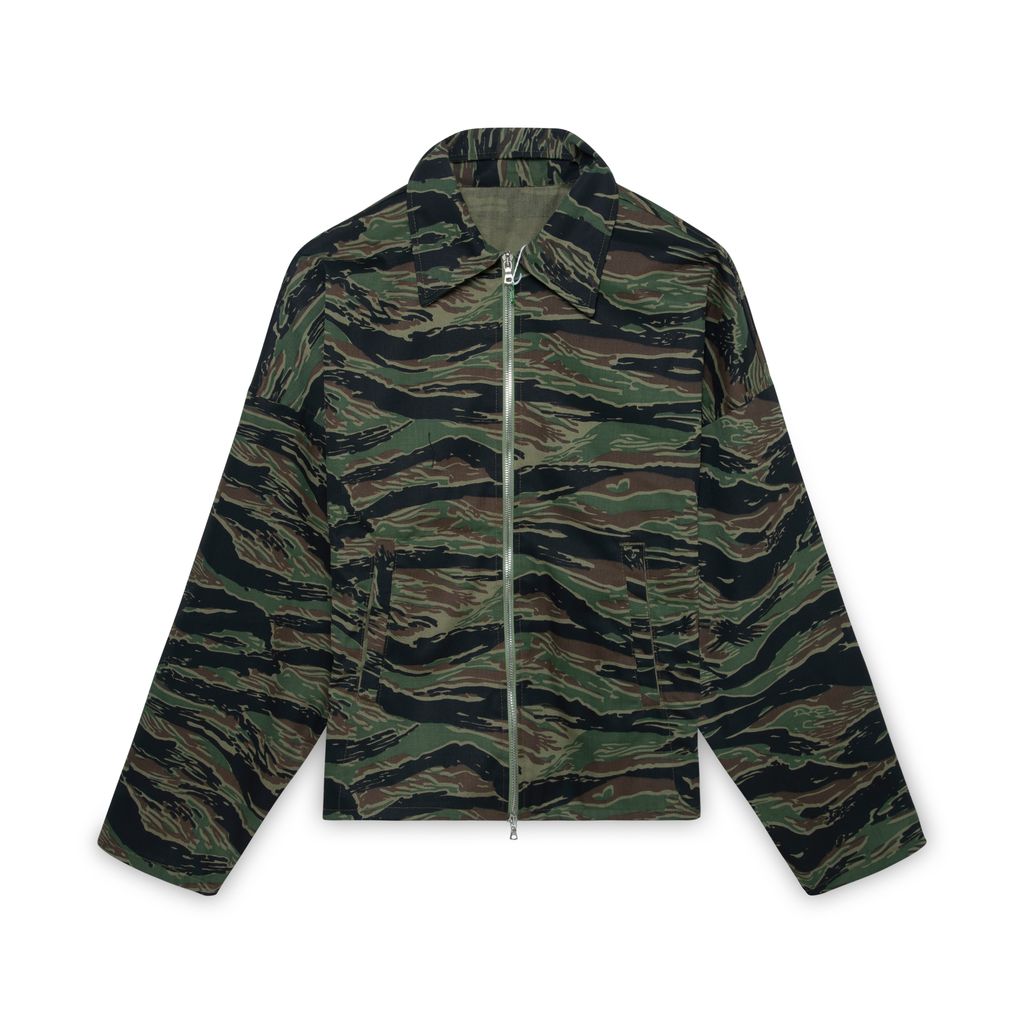 Boxy camouflage jacket features vertical stripe pattern throughout, two front pocket, classic collar, and zipper front closure.