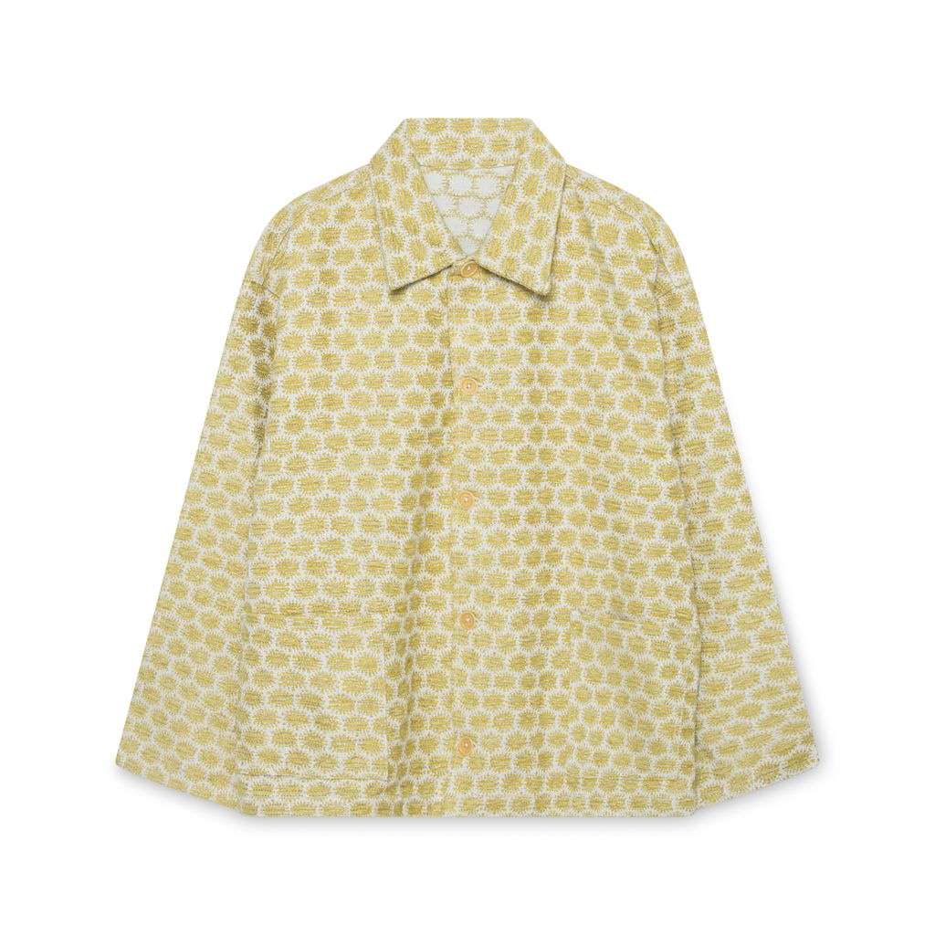 Boxy jacquard button jacket features two front pocket, classic collar, and button front closure.