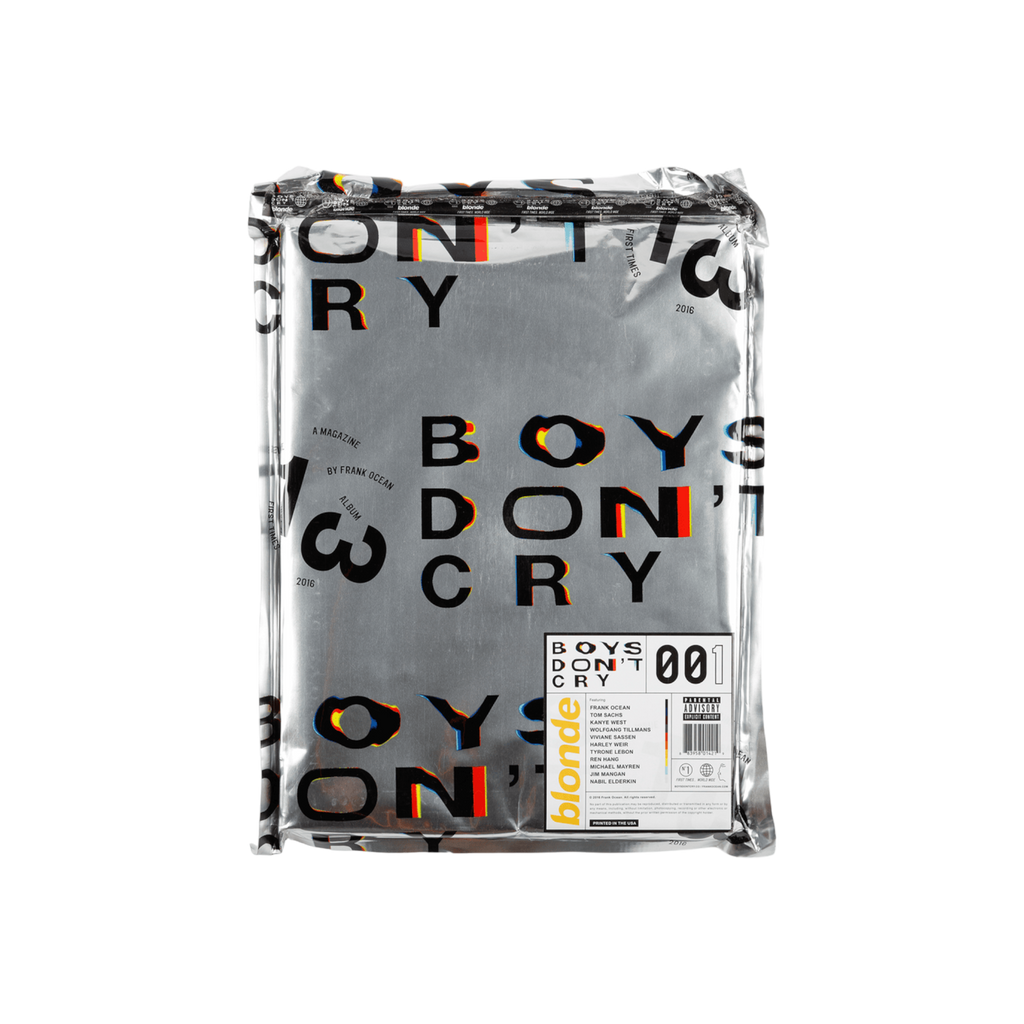 Boys Don’t Cry by Frank Ocean features a sealed magazine and a t-shirt from the artist’s album, Blonde.