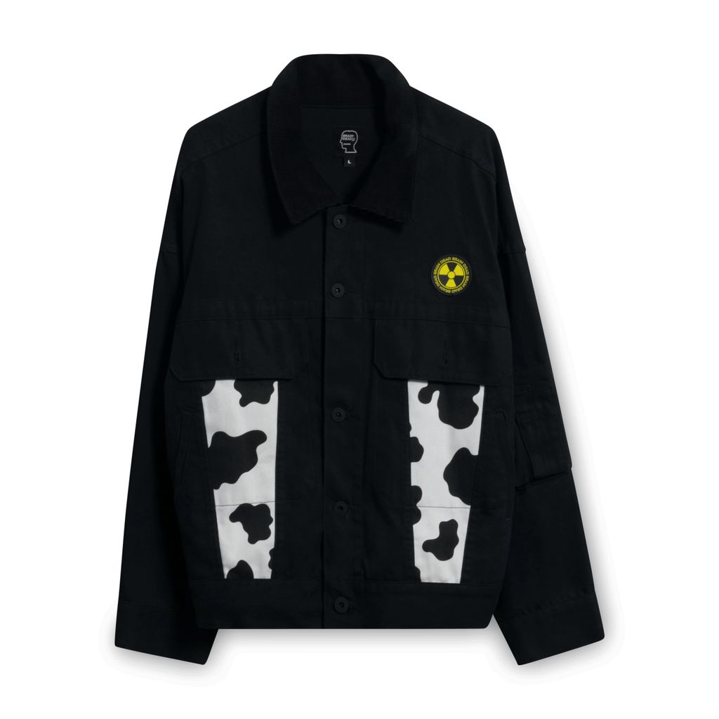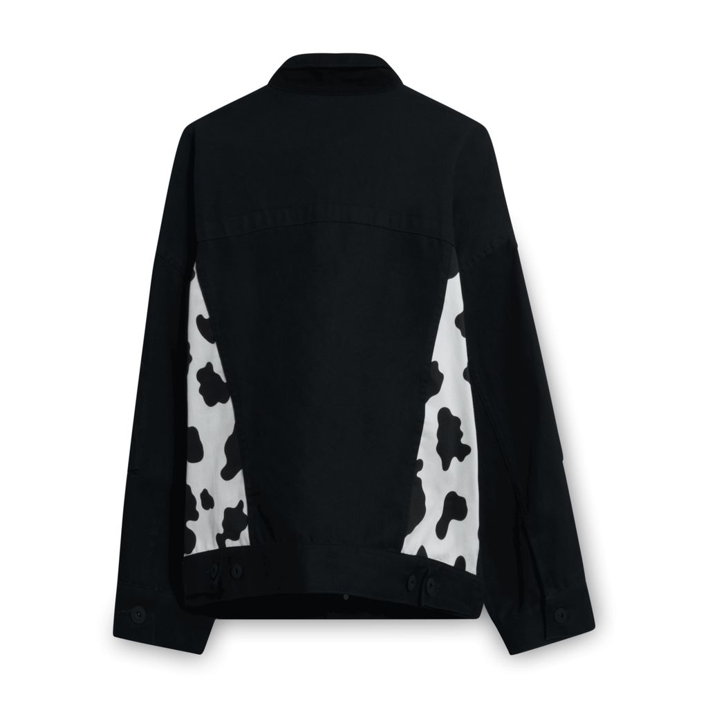 This canvas trucker jacket from Brain Dead features cow-print panels at front and back, tonal corduroy spread collar, front button closures, buttoned cuffs and hem and embroidered brand logo at front. Pre-owned. In good condition.