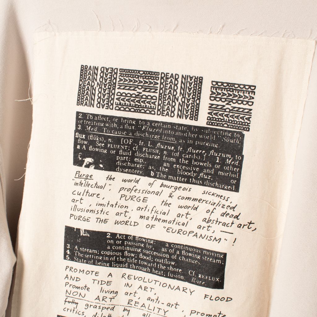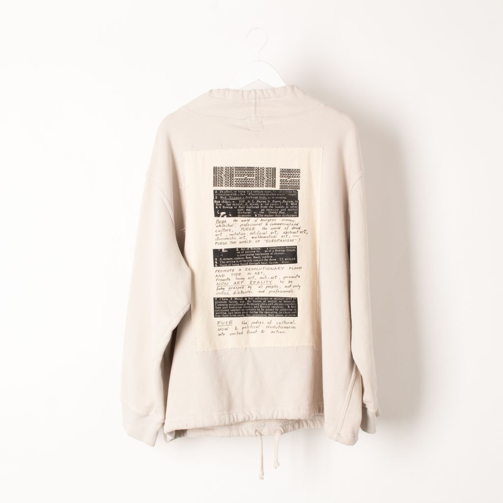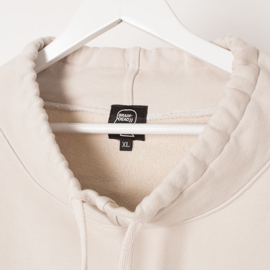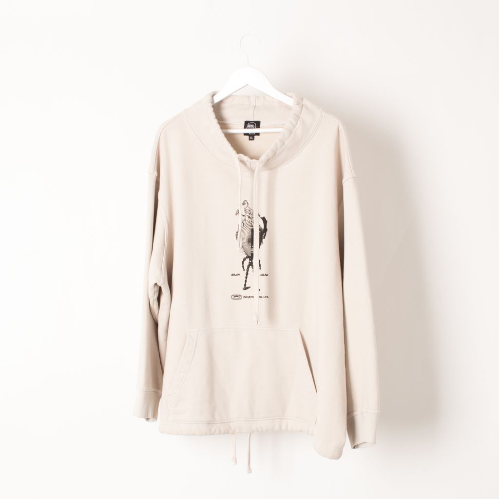 Like new, industrial mock neck crewneck from Braindead. Heavyweight sweatshirt with cinch around neck and bottom hem, screen printed graphic on front and cotton patch sewn on back. Made in USA.