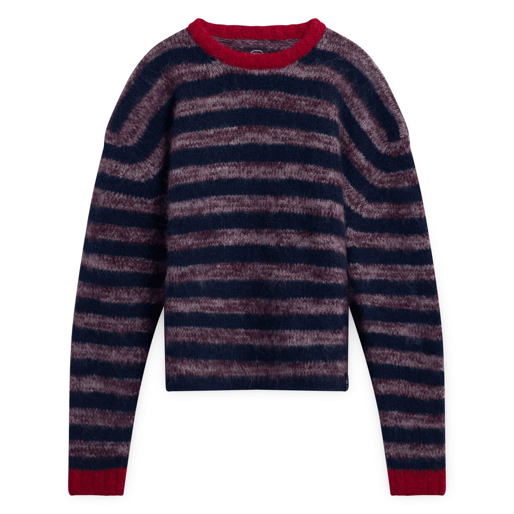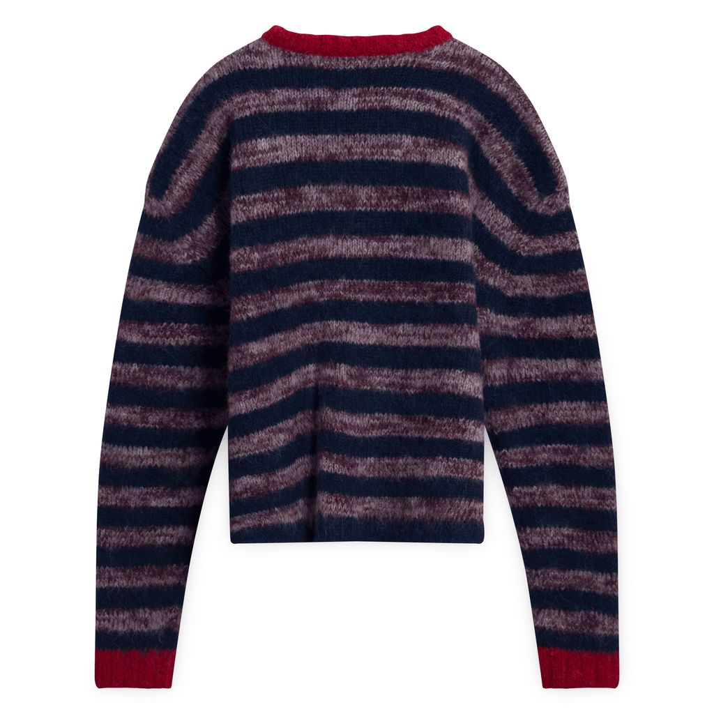 Alpaca knit sweater features all over navy/multi knit pattern. Boxy, cropped fit. Hand wash only, lay flat to dry, do not use bleach. Made in Peru.