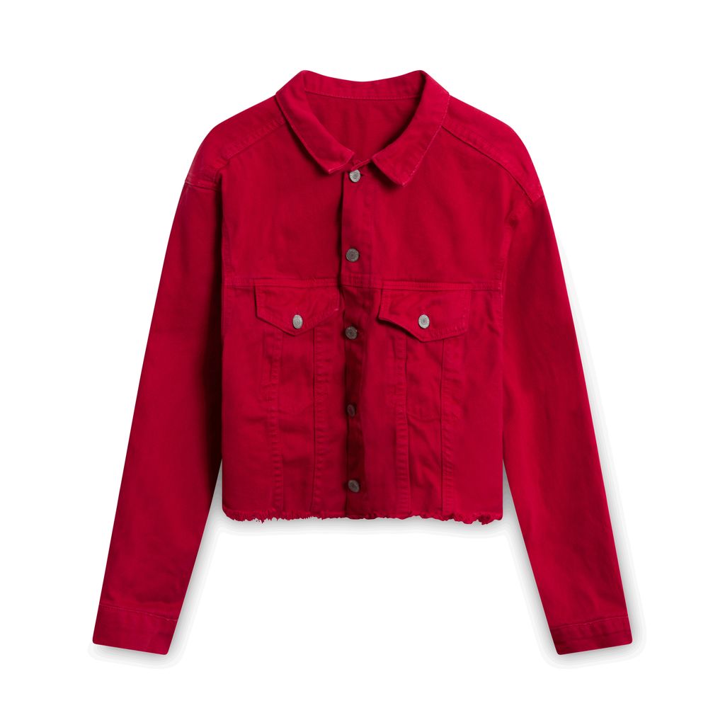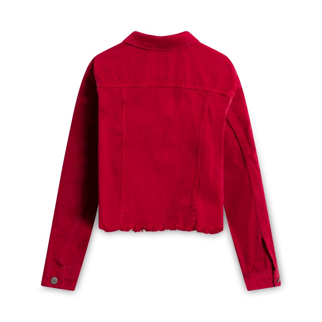John Galt red denim jacket with cropped raw hem and silver hardware.