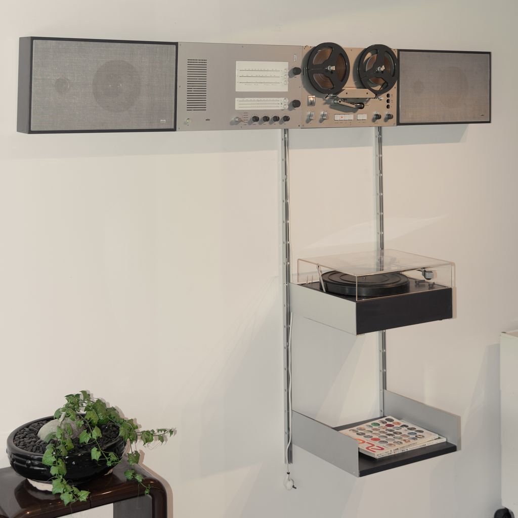 The Braun Wandanlage Wall Stereo System by Dieter Rams is one of the most sought-after hi-fi systems from the 60s. It is comprised of TG 504 tape recorder, TS 45 amplifier, PCS 5 tunrtable, L 450 speakers, and Vitsoe shelves/rails.
