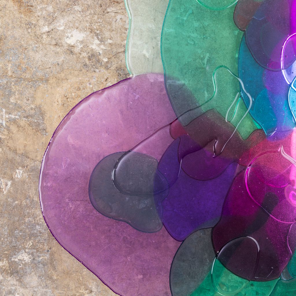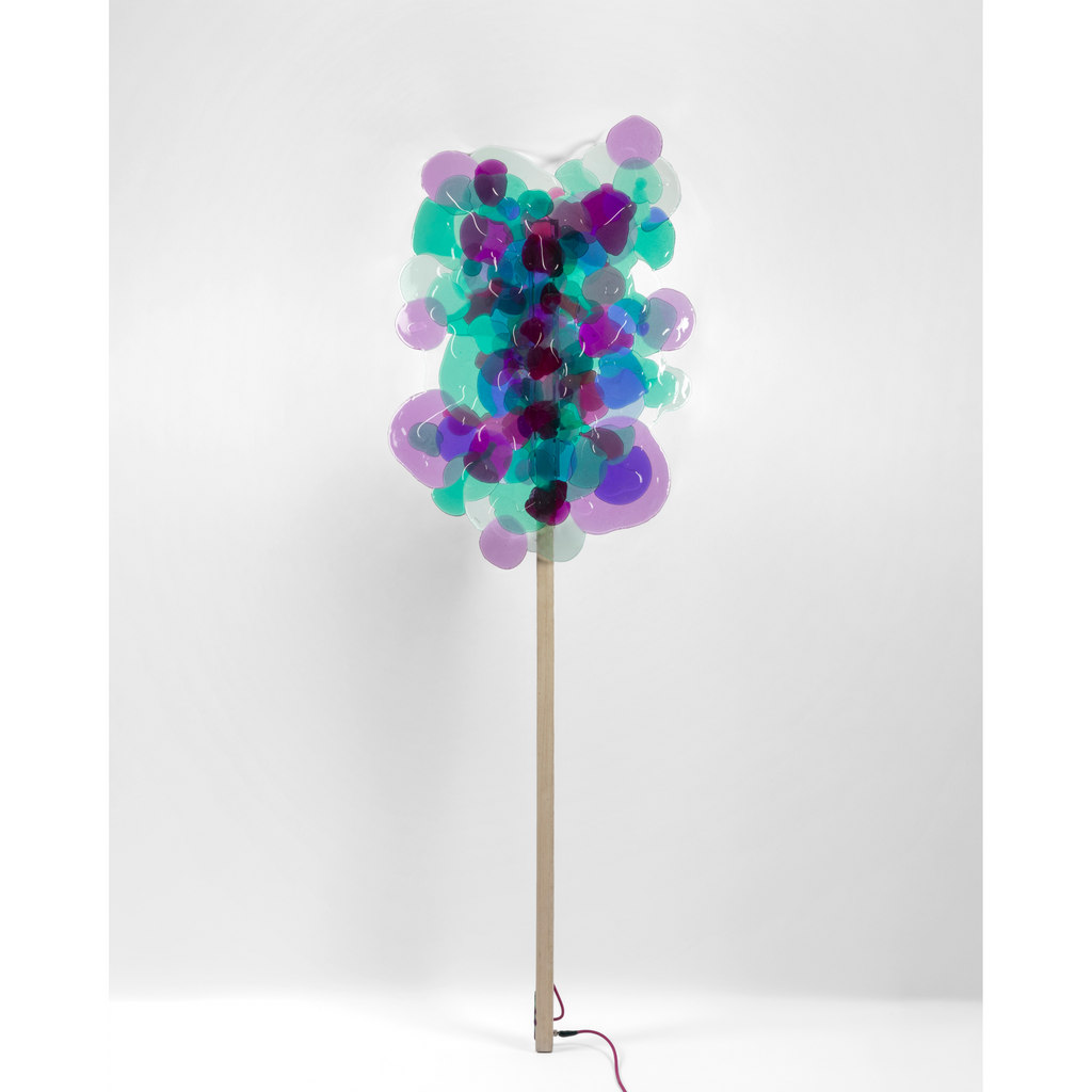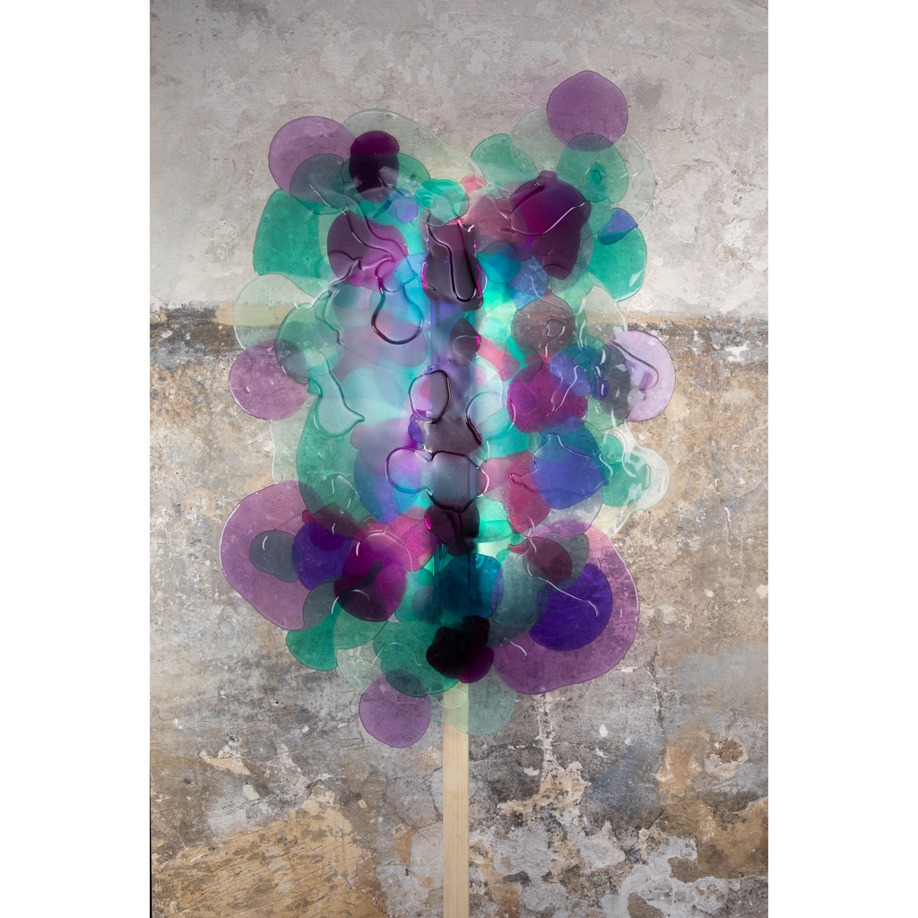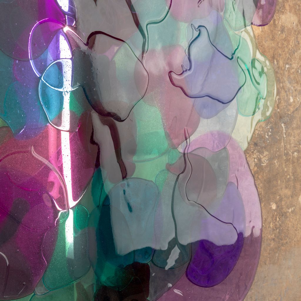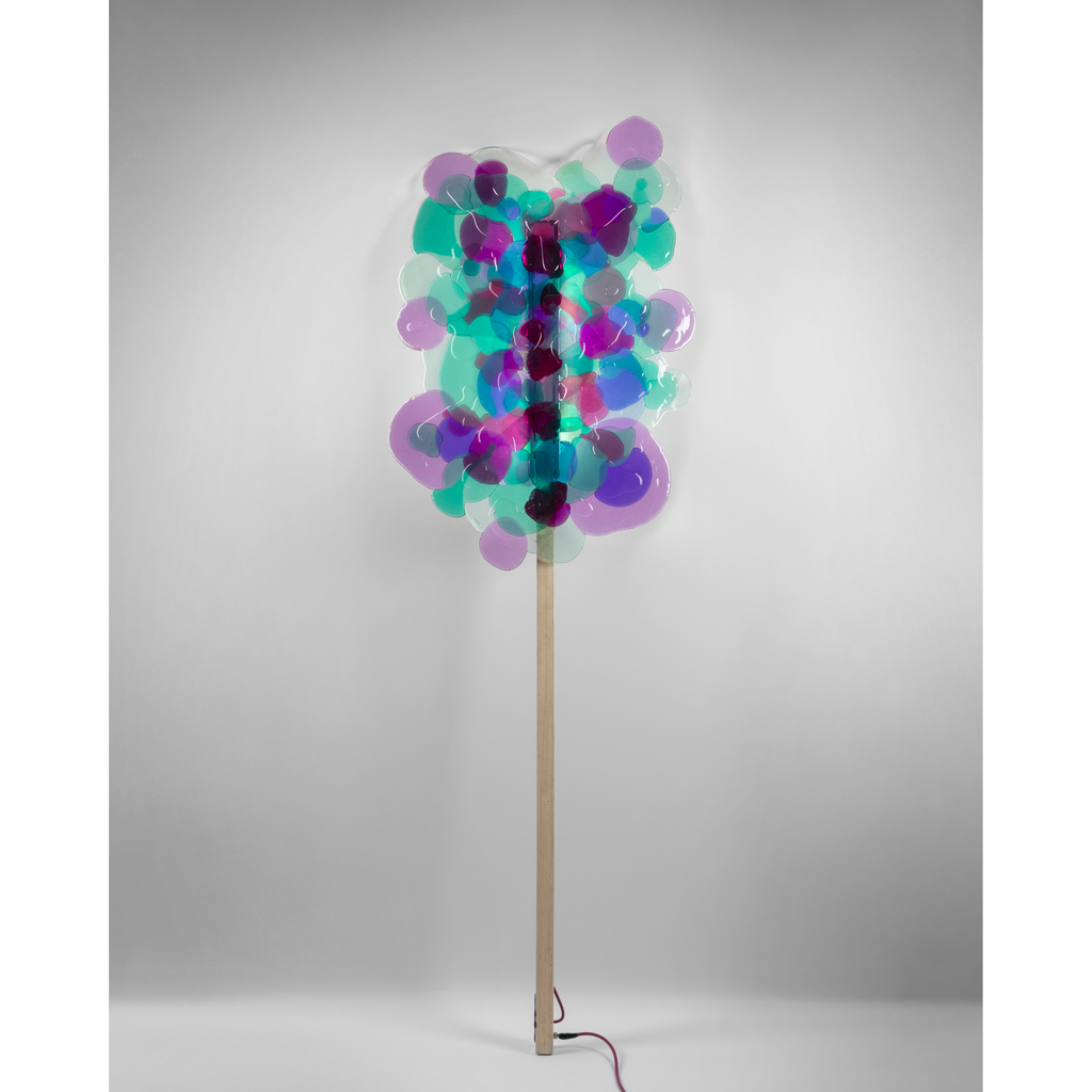 “Bright Future” reinterprets the protest sign, transforming it into a radiant beacon of hope and transformation, where light replaces words. A wooden pole supports a vibrant mass of polychrome resin, evoking (the act of) a demonstration while leaving space for an open and ever-changing message.The piece stands as a visual manifesto without fixed declarations, a sign that illuminates new possibilities. The contrast between solid material and the lightness of resin suggests a dialogue between past and future, tradition and innovation.