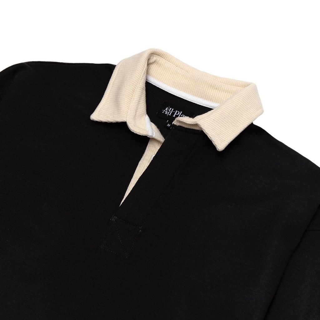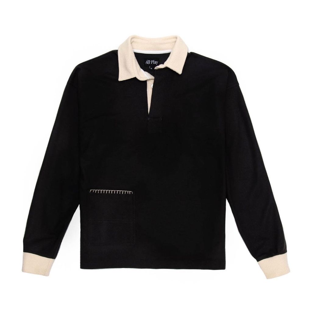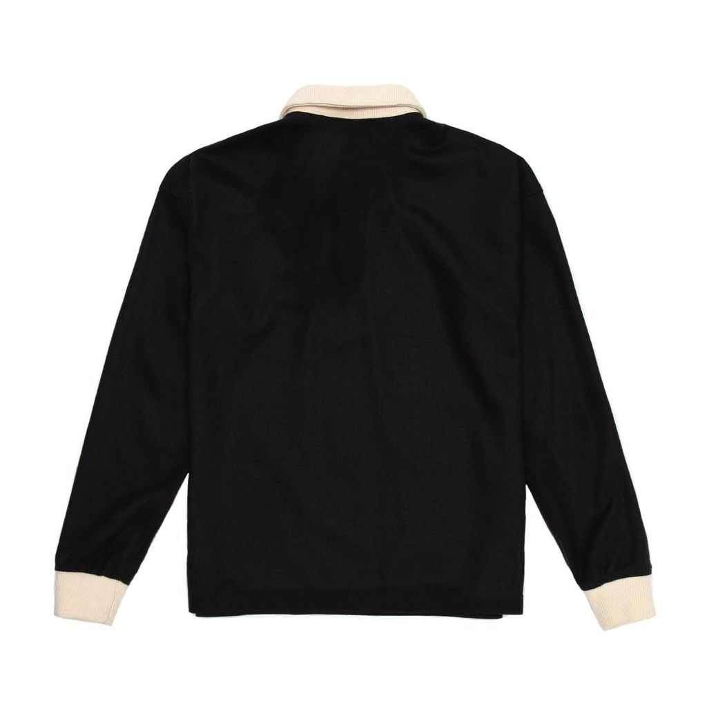 Our most luxurious piece to date, this rugby features Japanese wool knit fabric, ribbed collar, smoke pearl buttons and hand embroidered edge stitching. Material: 82/18 Wool/Poly Blend Color: Shadow Gray/Ecru Fabric made in Japan Manufactured in USA Model is 5’9” and wears a Medium