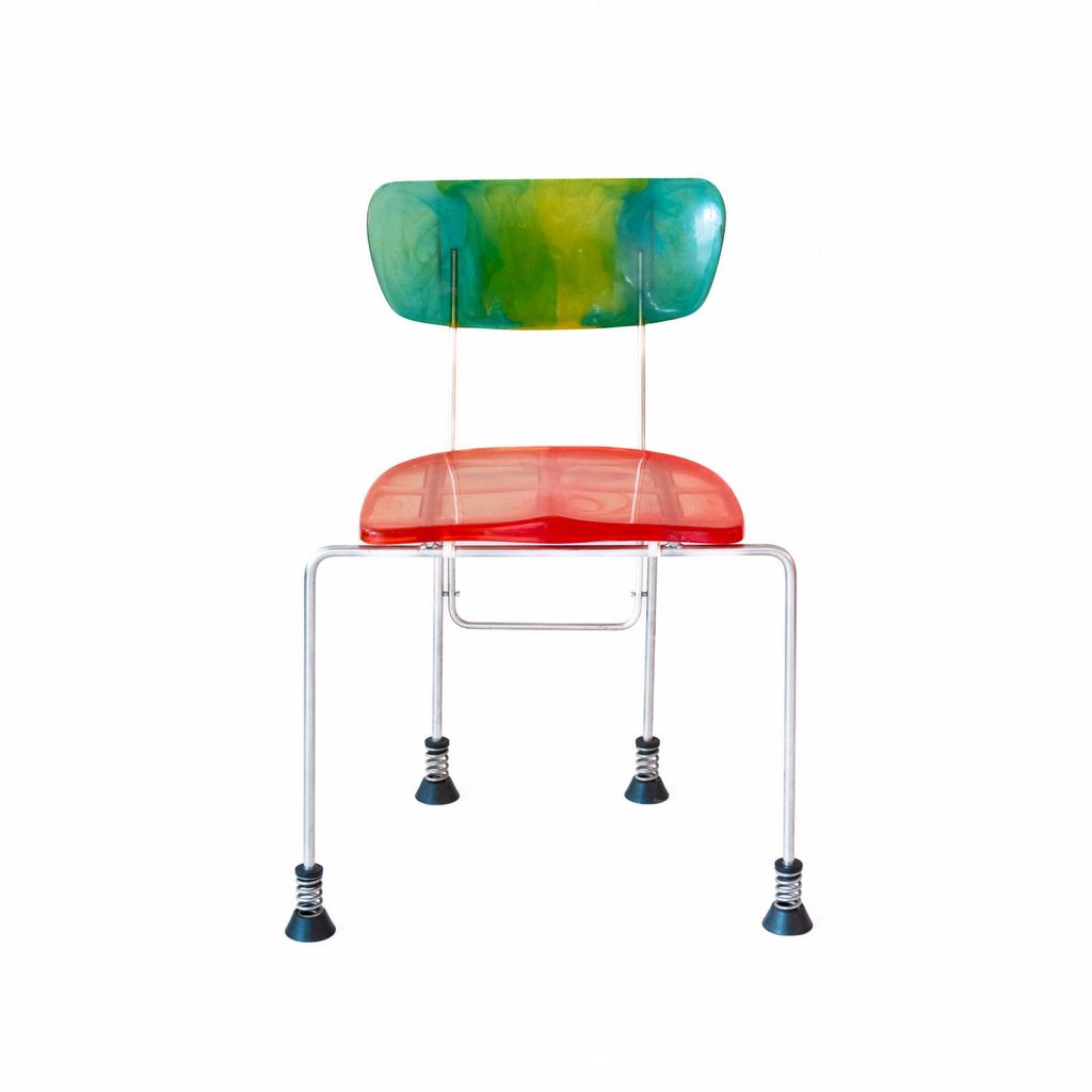Gaetano Pesce’s Broadway Chair, produced by Bernini in 1993, was among the original furnishings used throughout the TBWA/Chiat/Day New York headquarters in 1994. This particular example was part of the functioning office environment — used daily by staff and showing unique traces of that history, including a welded screw likely added on site as a repair. Supported by four spring-mounted, rubber-capped feet and cast in resin, the chair embodies Pesce’s fascination with instability and imperfection — “When you sit, you do not feel secure. That is like the reality of life.” The Chiat/Day chairs were saved from the NYC office in 1998 during its demolition and held in private ownership until now. Multiple available.