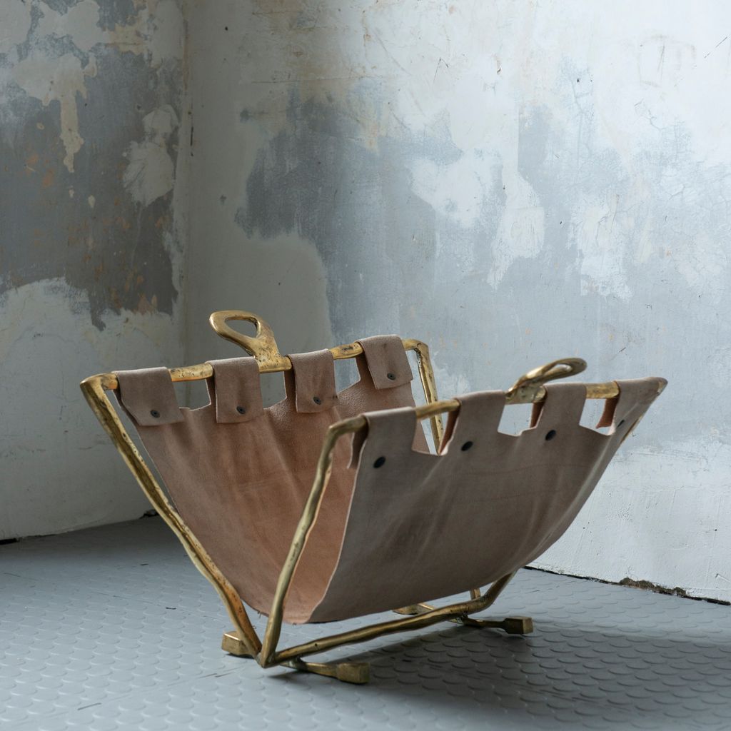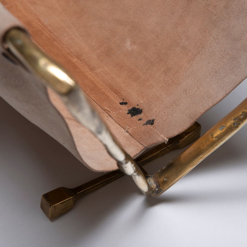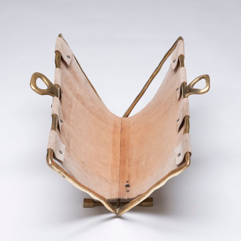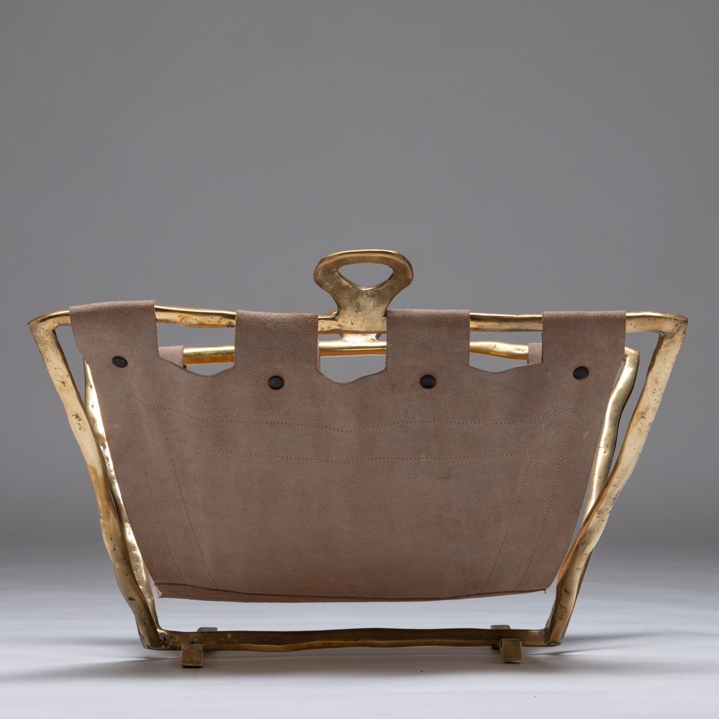 80s David Marshall bronze and leather magazine rack in great condition. Small stain from ink pen, beautiful patina.