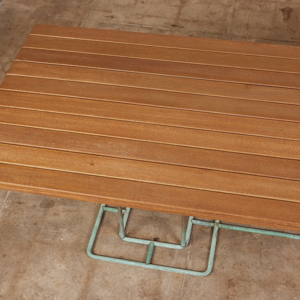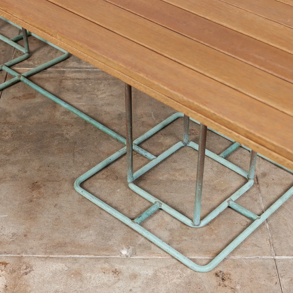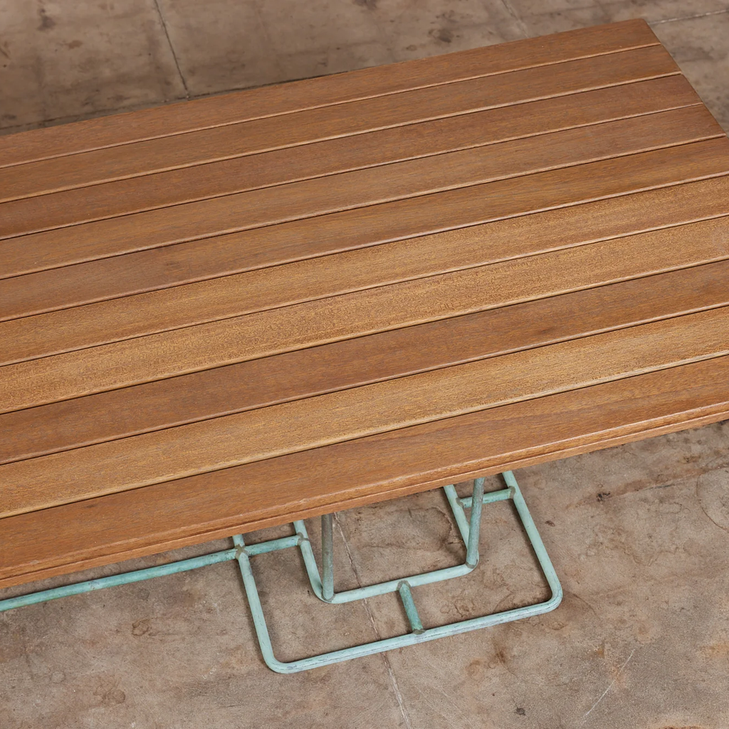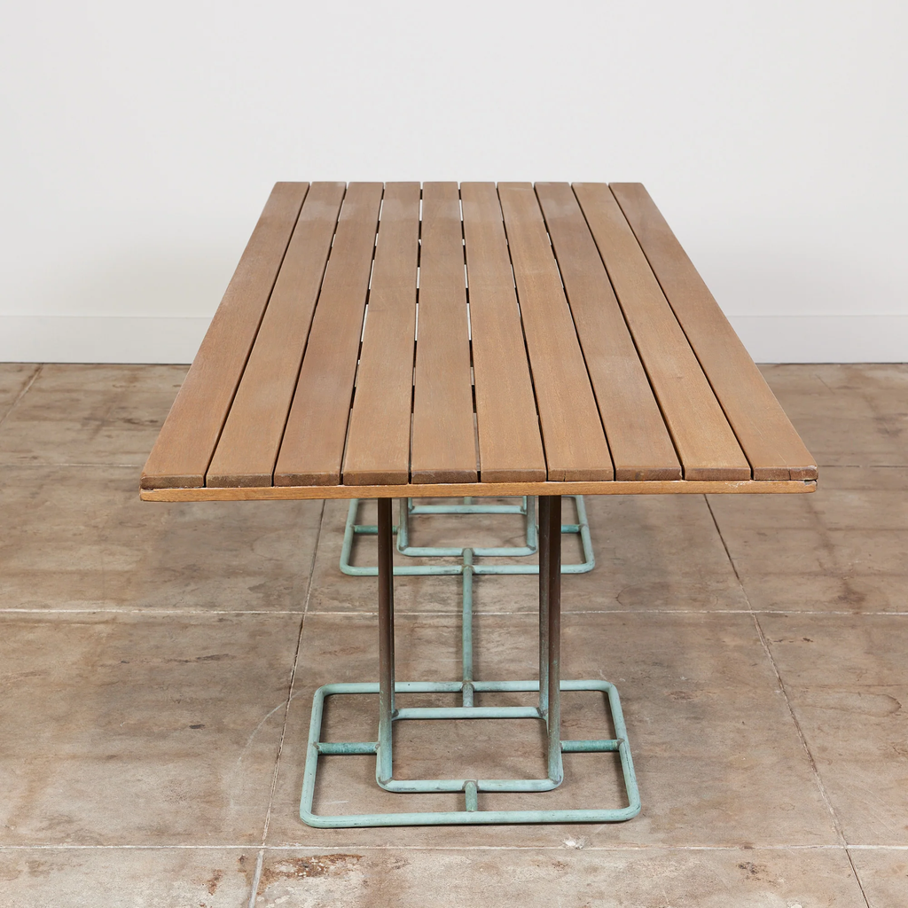 An impressive eight foot rectangular patio table designed by Walter Lamb and manufactured by Brown Jordan. The table has a slatted surface in the original weathered wood, mounted on a double bronze base. Its subtle geometry suggests an Arts & Crafts sensibility, each with two concentric squares, joined by bronze stretchers and supporting a pedestal of four closely grouped legs.