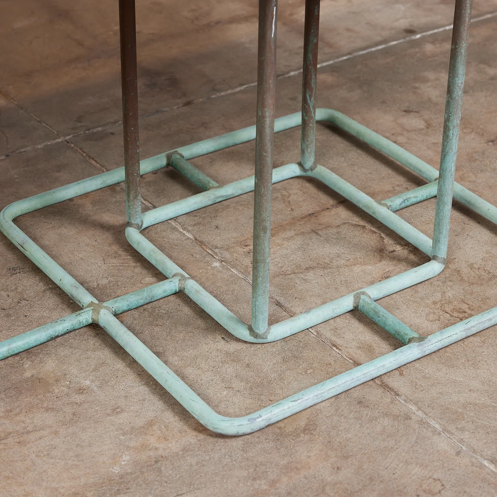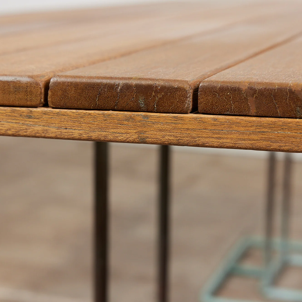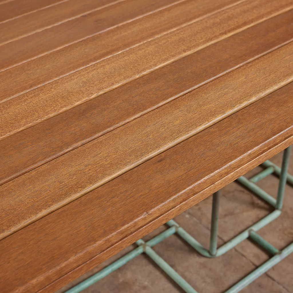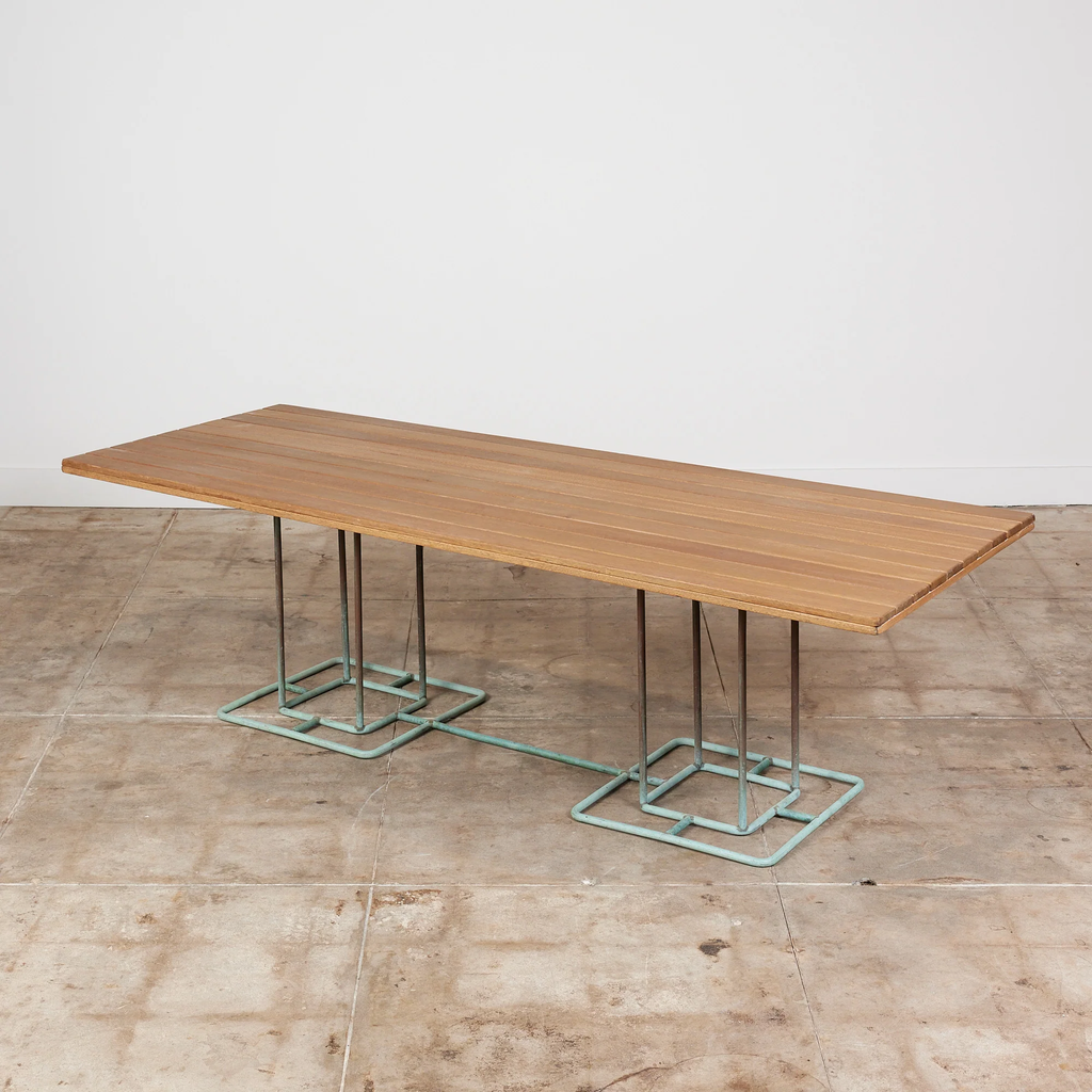 An impressive eight foot rectangular patio table designed by Walter Lamb and manufactured by Brown Jordan. The table has a slatted surface in the original weathered wood, mounted on a double bronze base. Its subtle geometry suggests an Arts & Crafts sensibility, each with two concentric squares, joined by bronze stretchers and supporting a pedestal of four closely grouped legs.