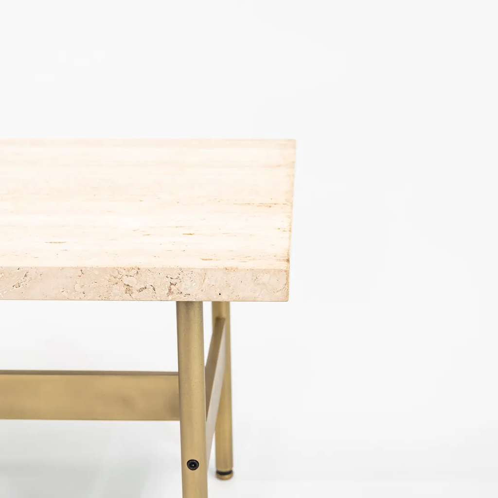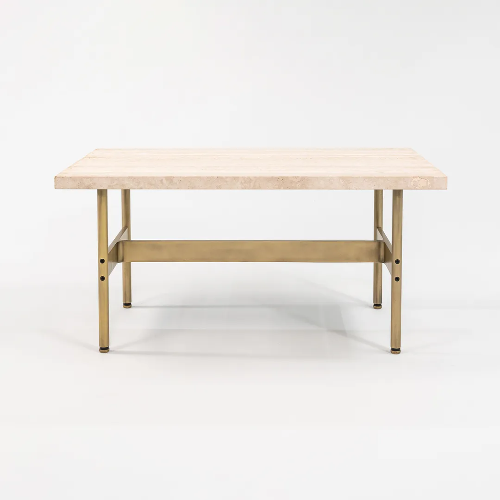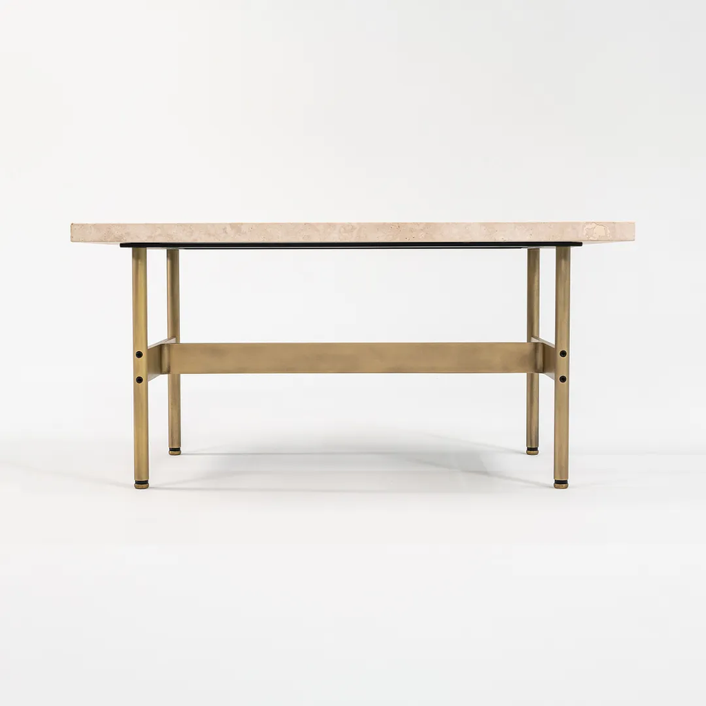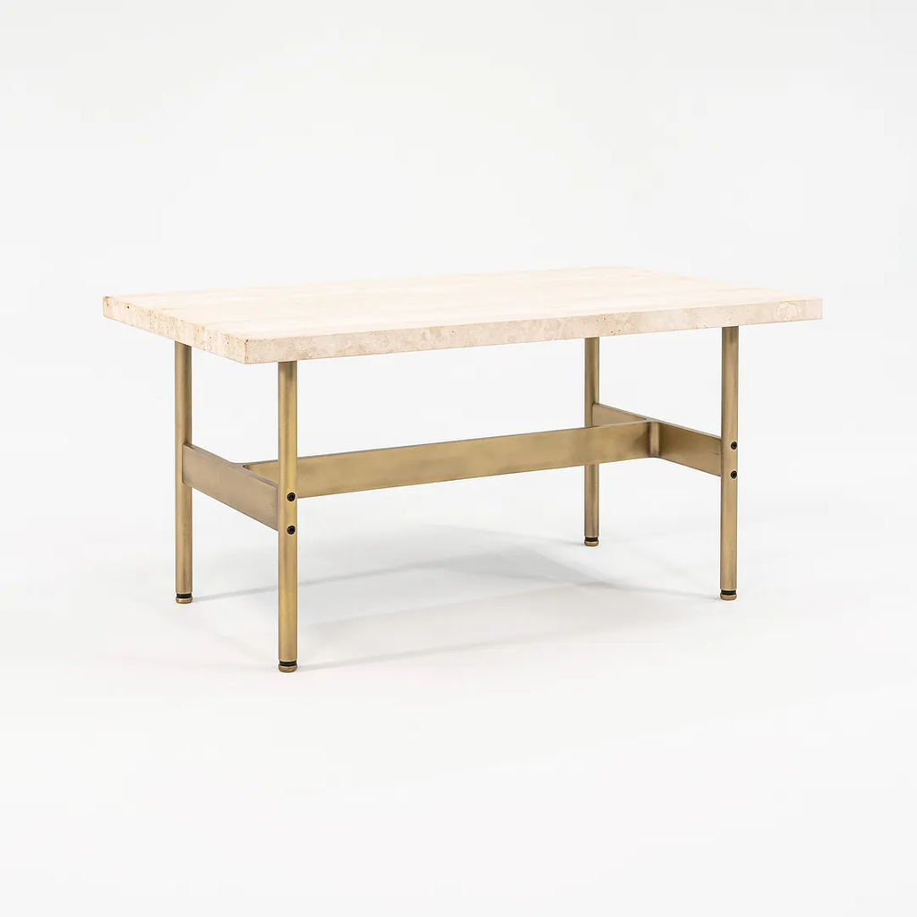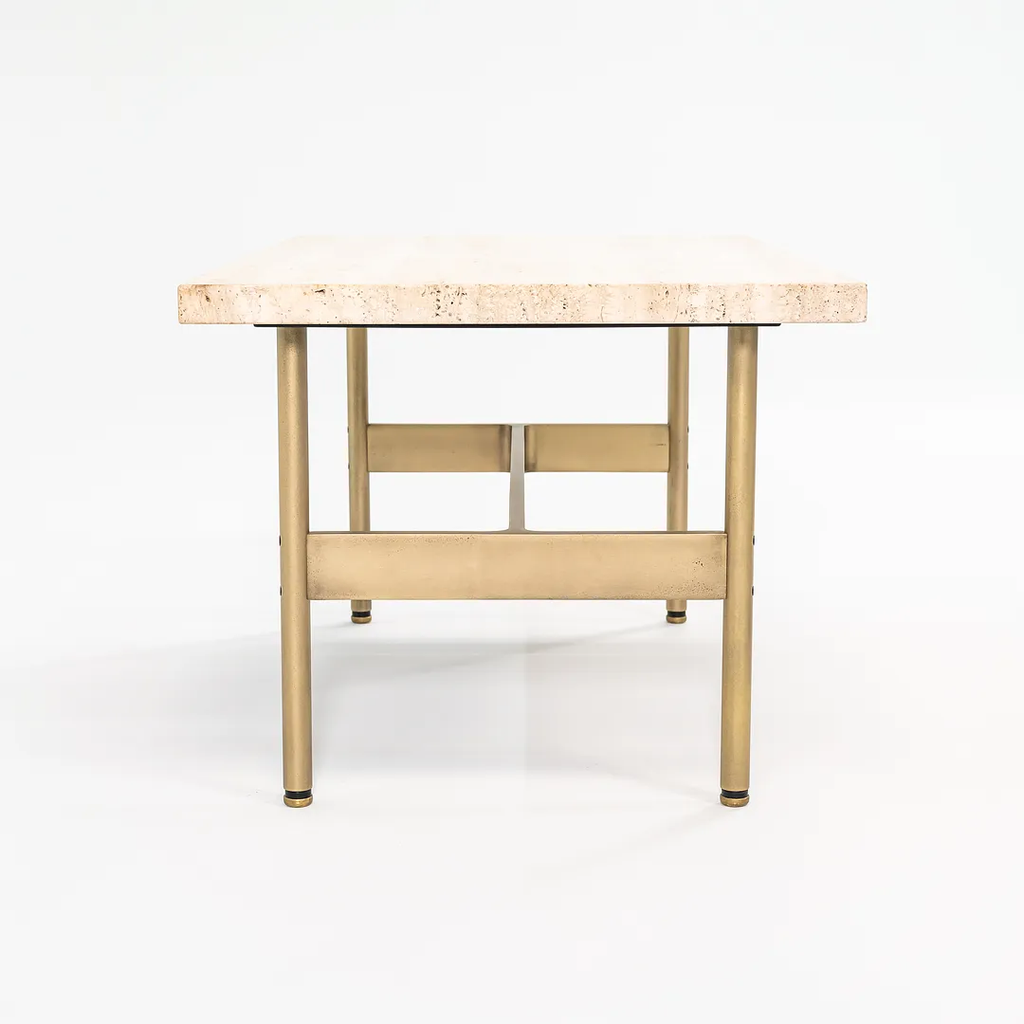This is a recent production Laverne table with a Travertine top and light antique bronze frame, produced by Gratz Industries. Gratz Industries was one of the original manufacturers of Laverne furniture and continued to work with designer Bill Katavolos for many decades up until circa 2010s.