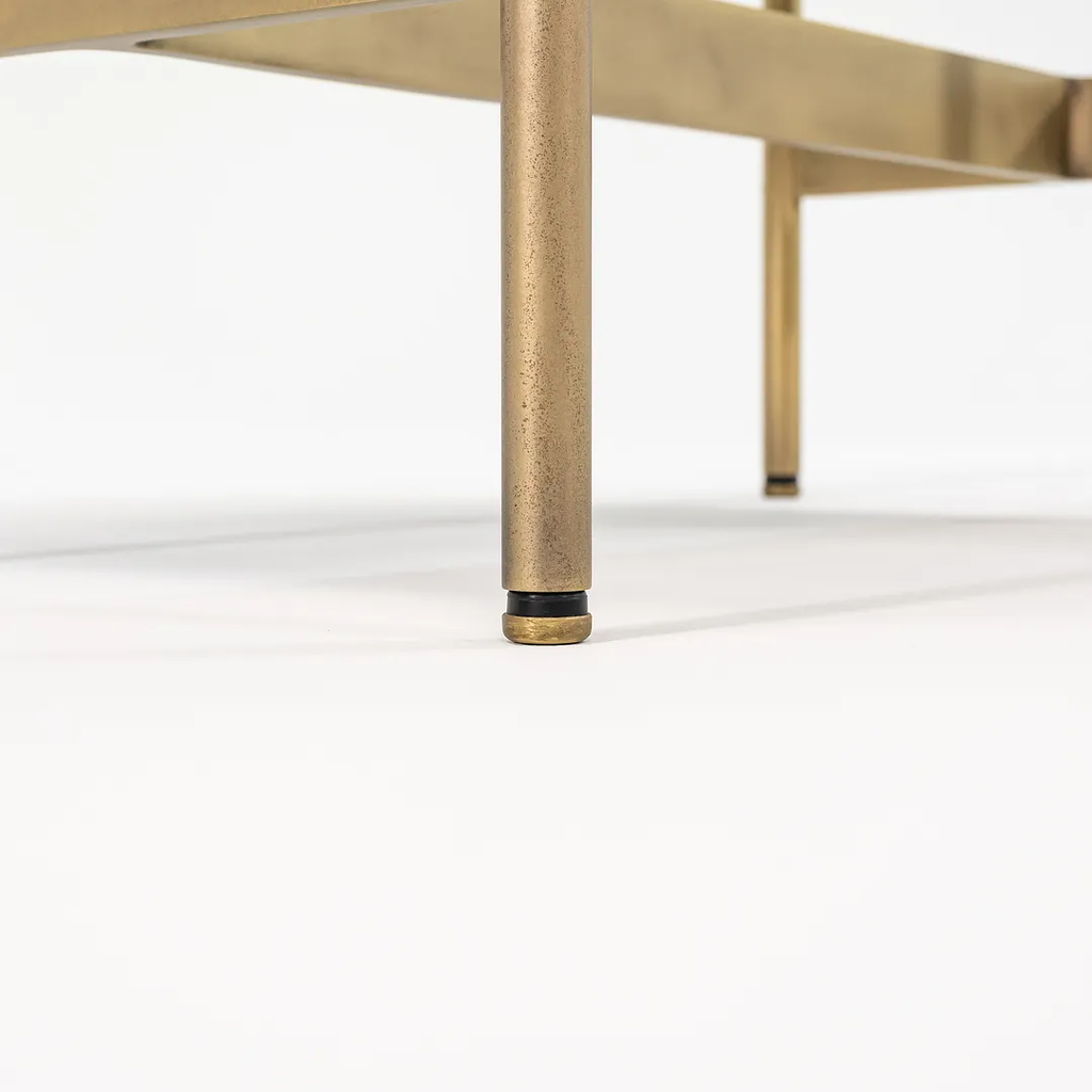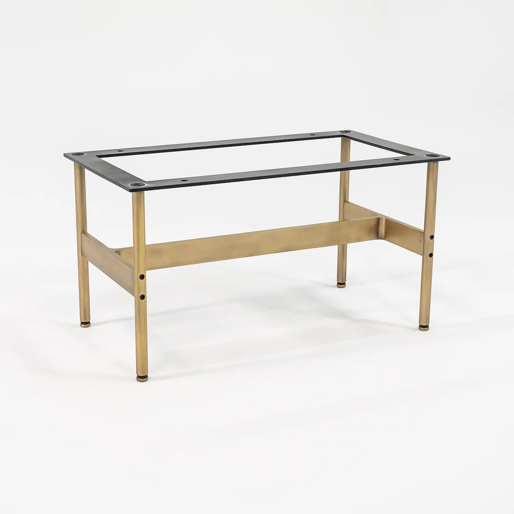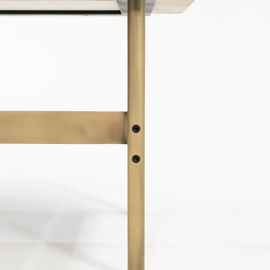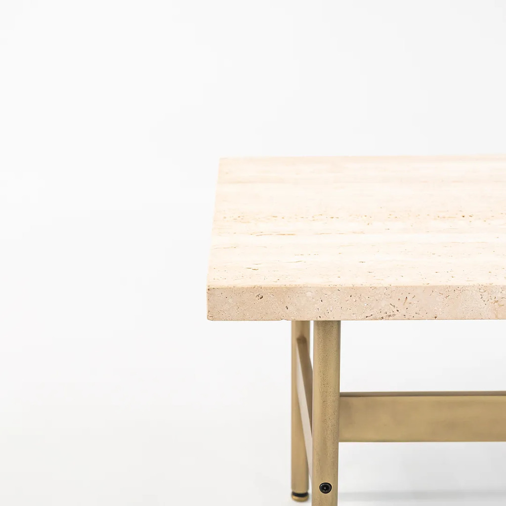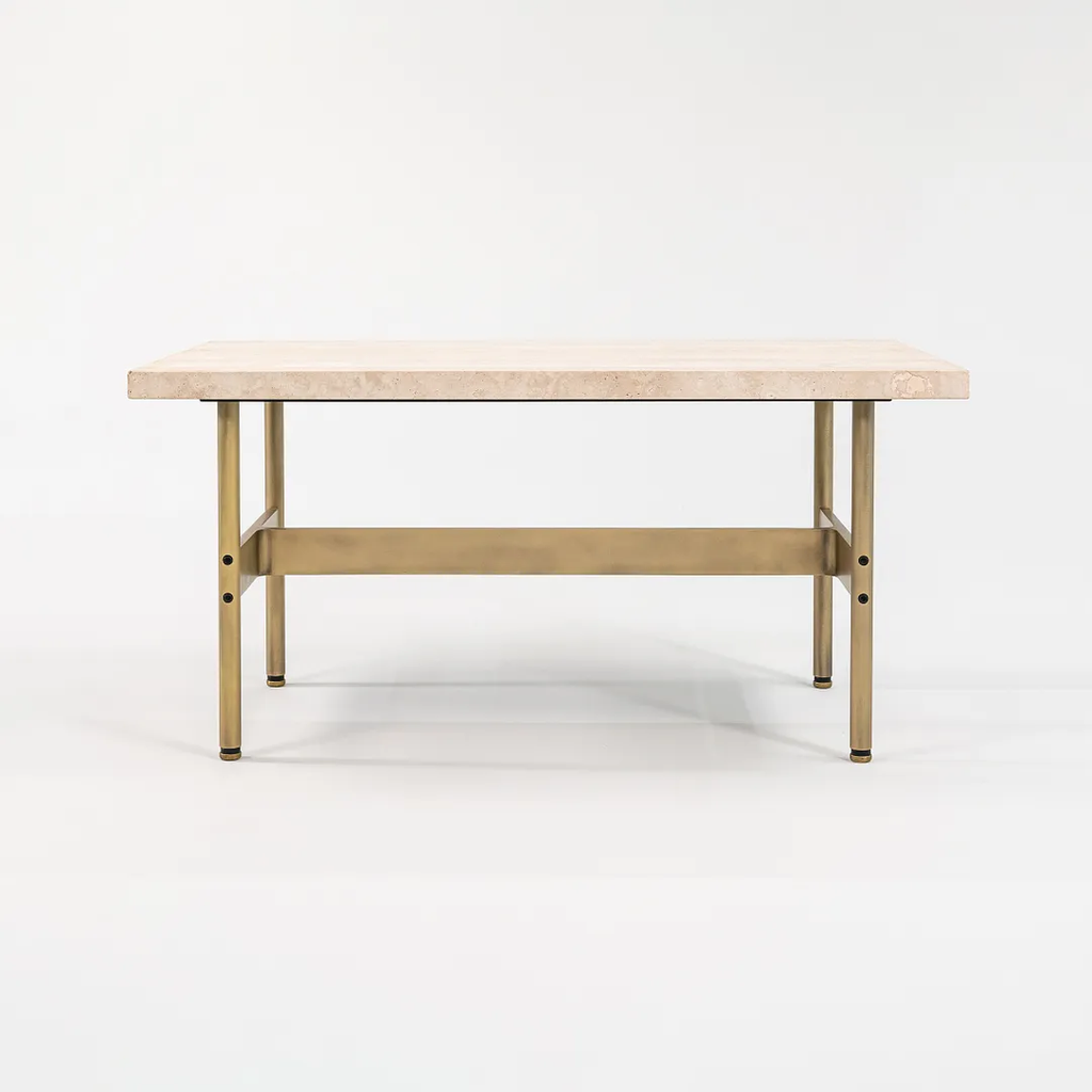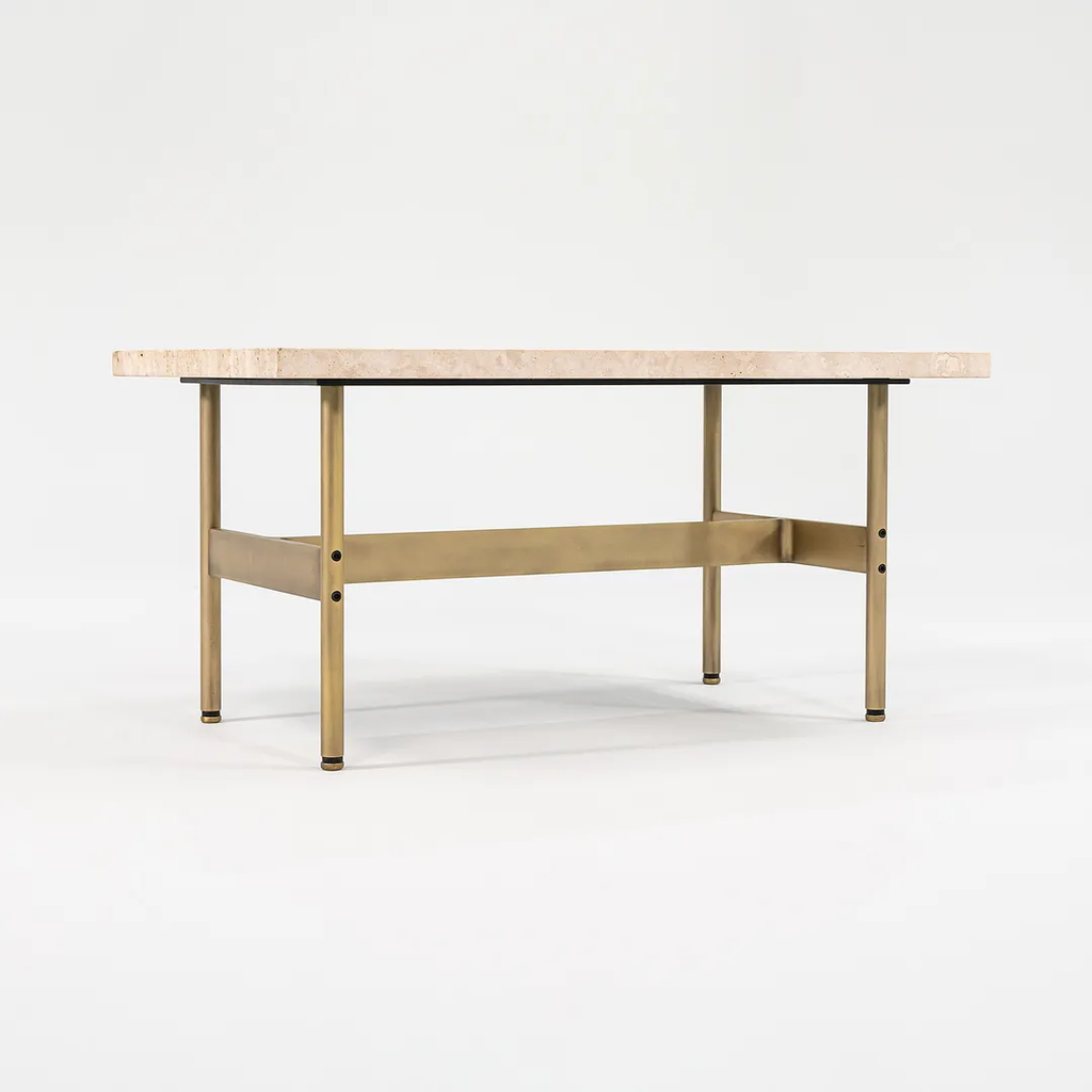 This is a recent production Laverne table with a Travertine top and light antique bronze frame, produced by Gratz Industries. Gratz Industries was one of the original manufacturers of Laverne furniture and continued to work with designer Bill Katavolos for many decades up until circa 2010s.