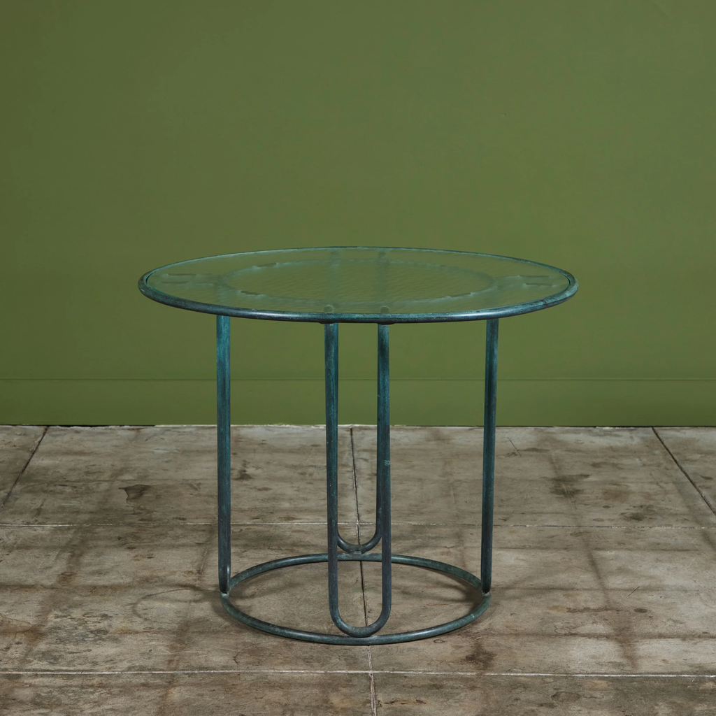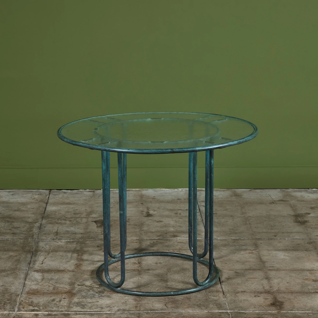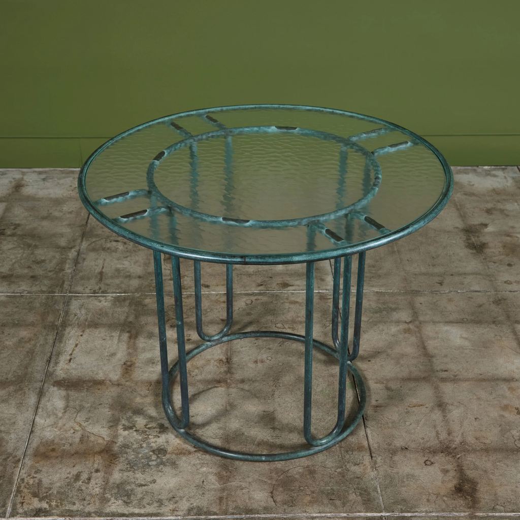 A patio dining table in patinated bronze designed by Walter Lamb and produced by Brown Jordan. The round frame is has concentric bronze with radial supports and a circular bronze base. The round tabletop has a single piece of hammered glass that fits inside the bronze frame.