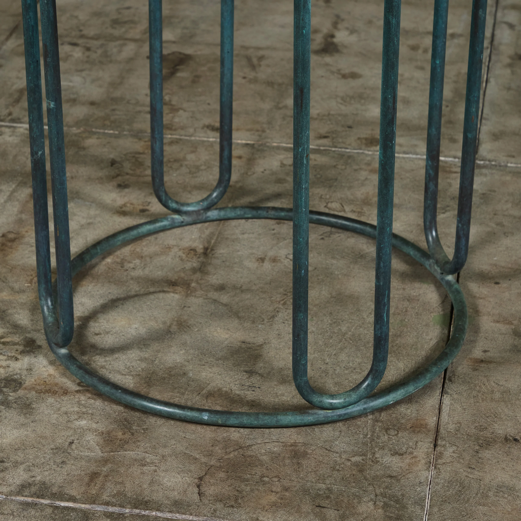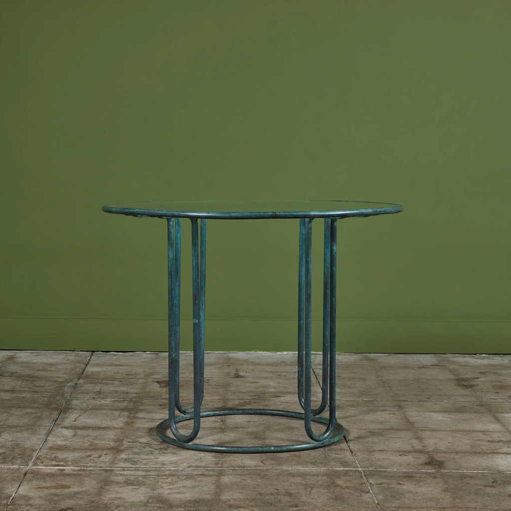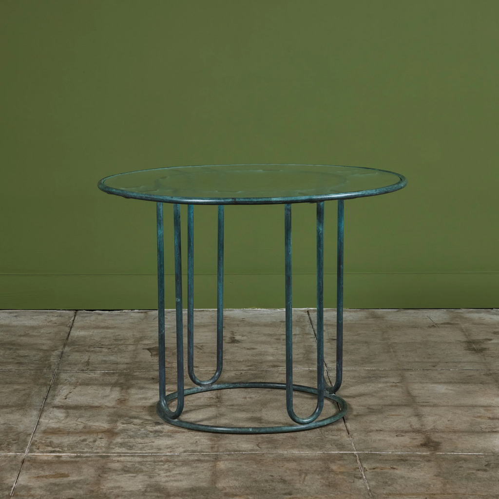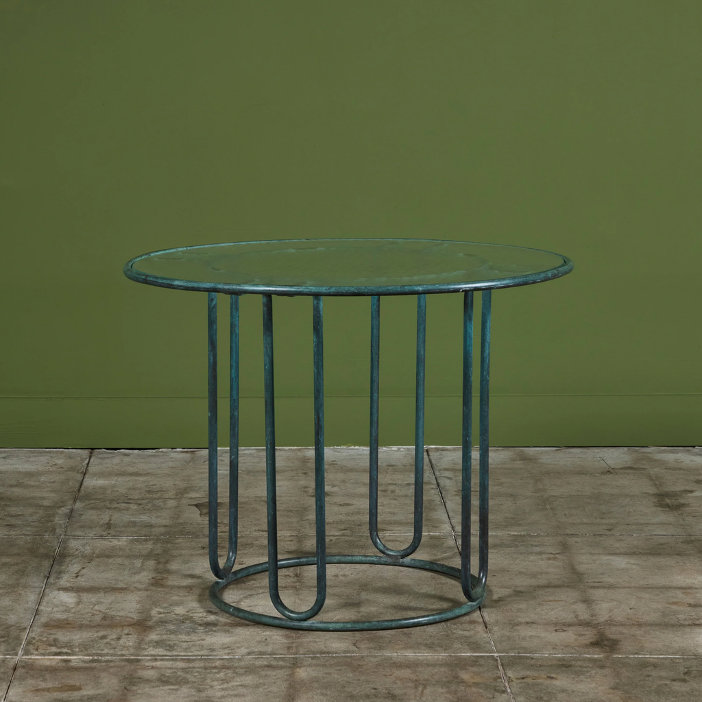 A patio dining table in patinated bronze designed by Walter Lamb and produced by Brown Jordan. The round frame is has concentric bronze with radial supports and a circular bronze base. The round tabletop has a single piece of hammered glass that fits inside the bronze frame.