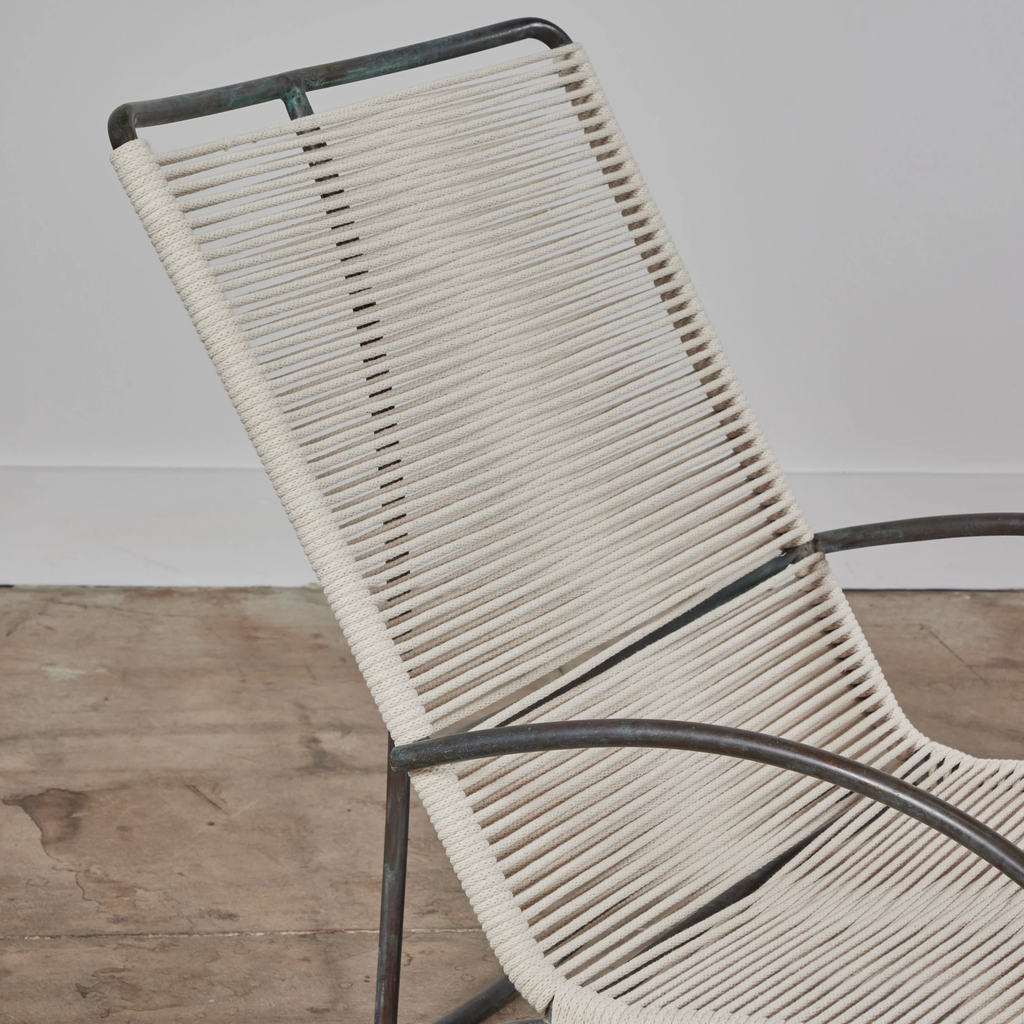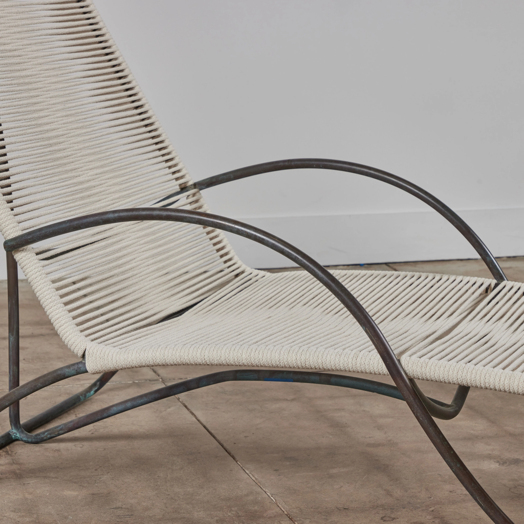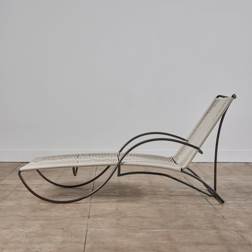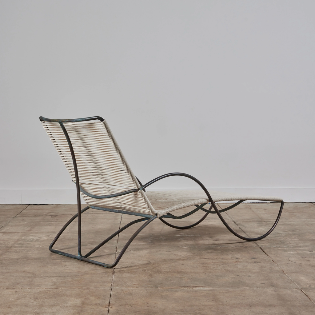 S-Lounge patio chair by Walter Lamb for Brown Jordan. Graceful even for a Lamb design, the chaise lounge is rendered in bronze tubing with a seat of woven yacht cord. Its namesake armrest draws a serpentine curve from the backrest to the front edge of the chair. A bent runner mirrors the arched lines of the seat to form the rear support.