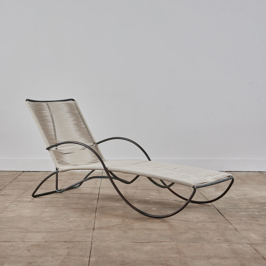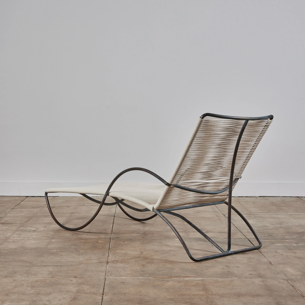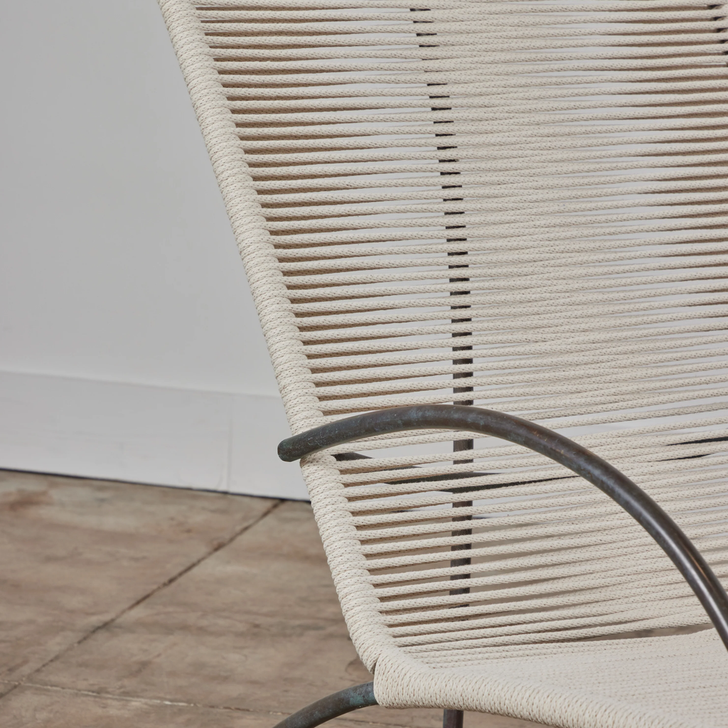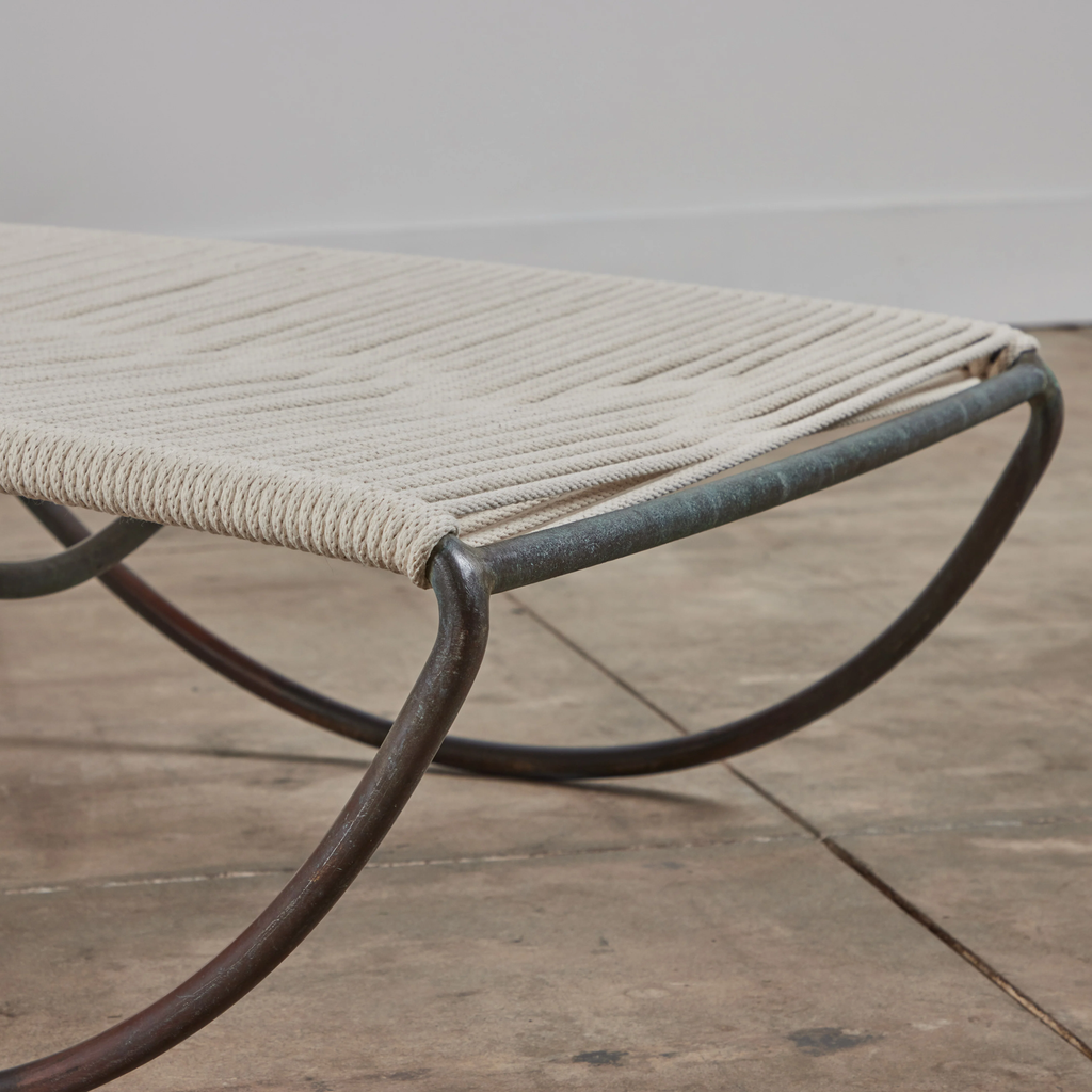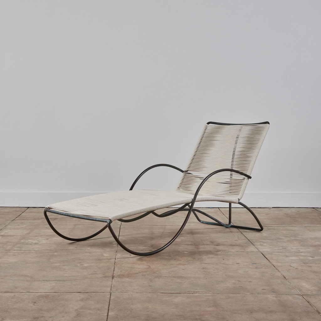 S-Lounge patio chair by Walter Lamb for Brown Jordan. Graceful even for a Lamb design, the chaise lounge is rendered in bronze tubing with a seat of woven yacht cord. Its namesake armrest draws a serpentine curve from the backrest to the front edge of the chair. A bent runner mirrors the arched lines of the seat to form the rear support.