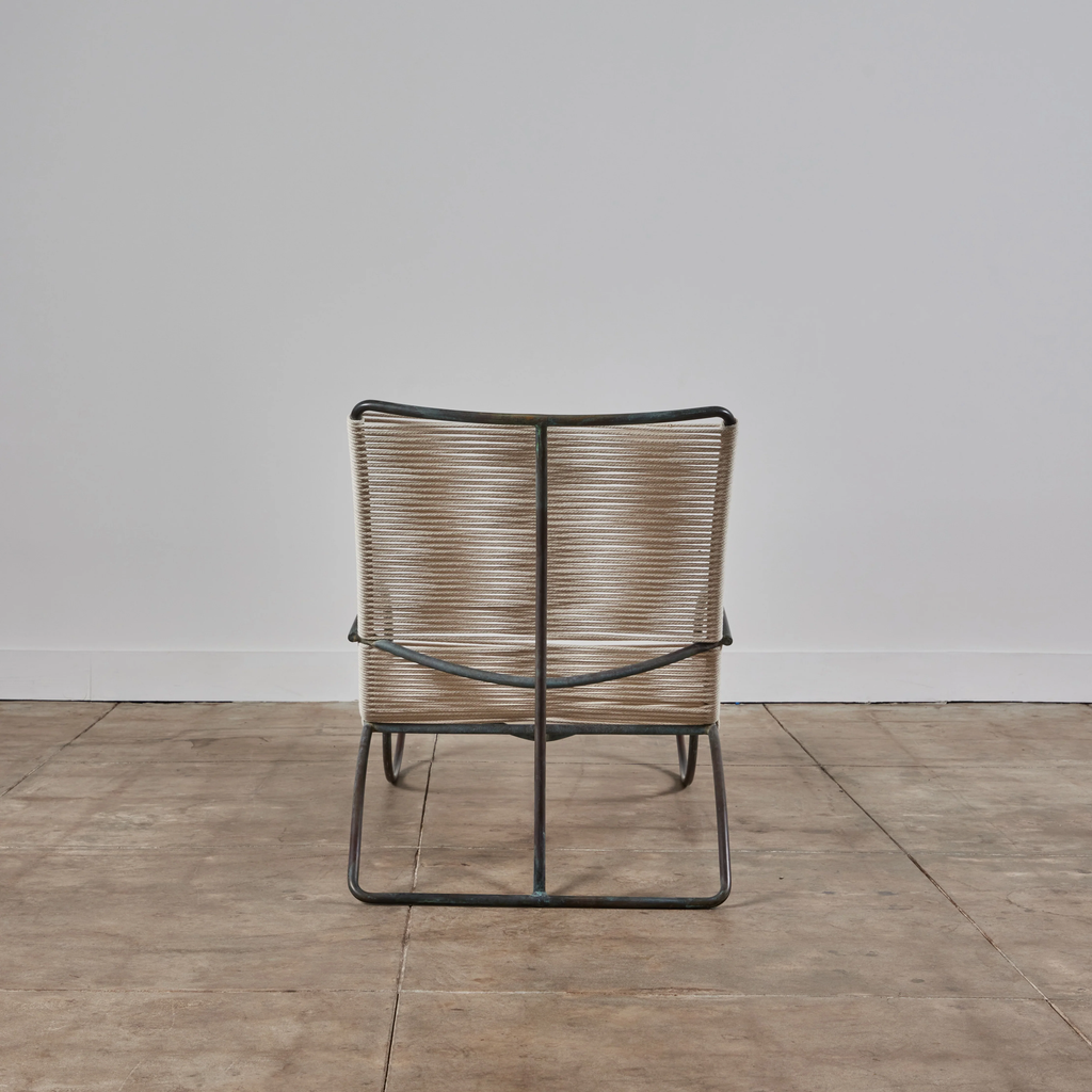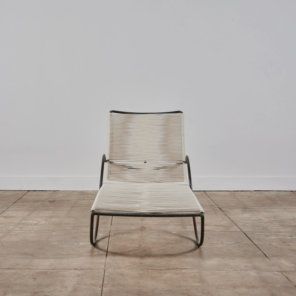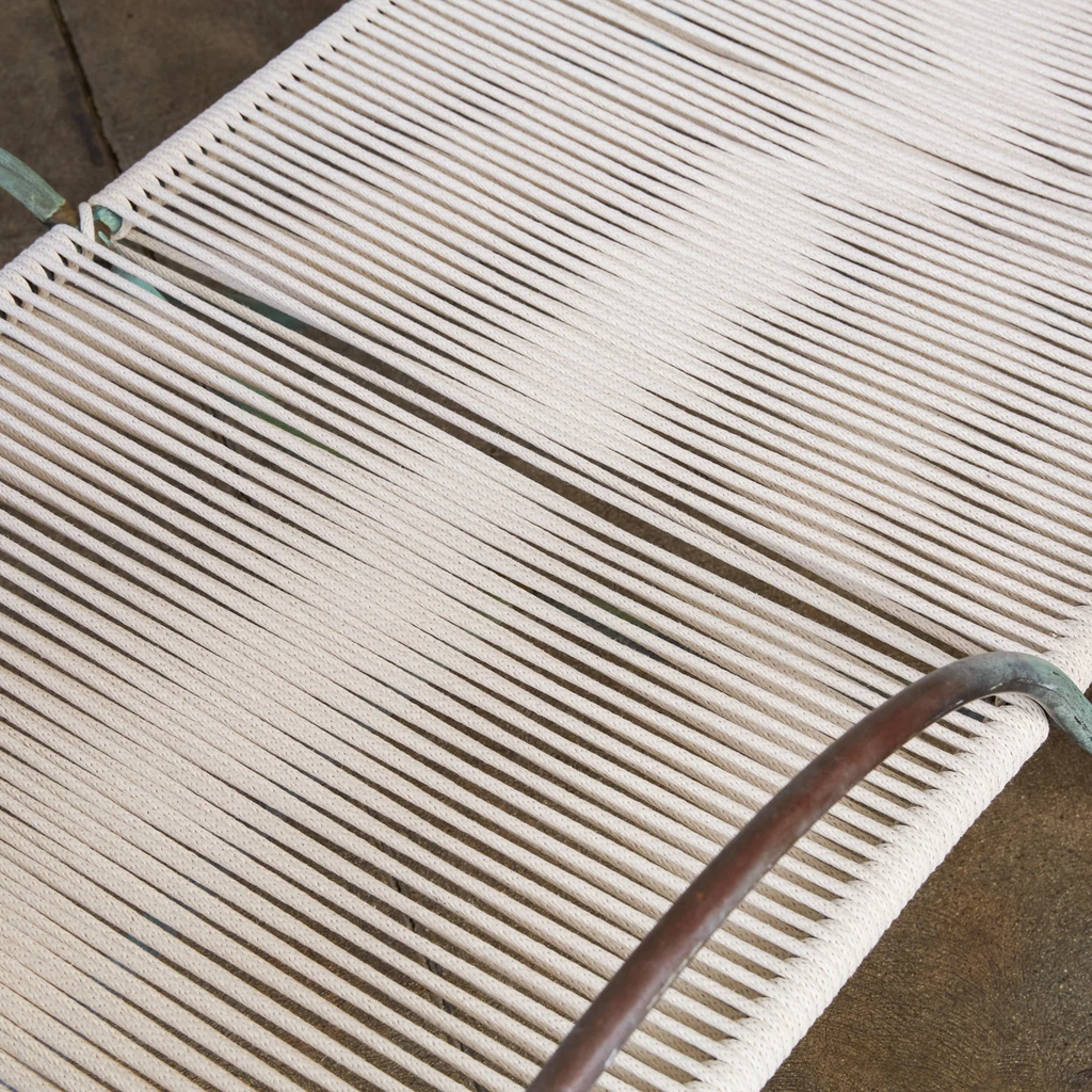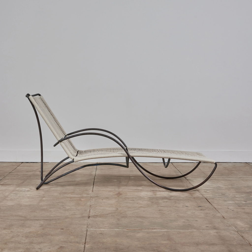 S-Lounge patio chair by Walter Lamb for Brown Jordan. Graceful even for a Lamb design, the chaise lounge is rendered in bronze tubing with a seat of woven yacht cord. Its namesake armrest draws a serpentine curve from the backrest to the front edge of the chair. A bent runner mirrors the arched lines of the seat to form the rear support.